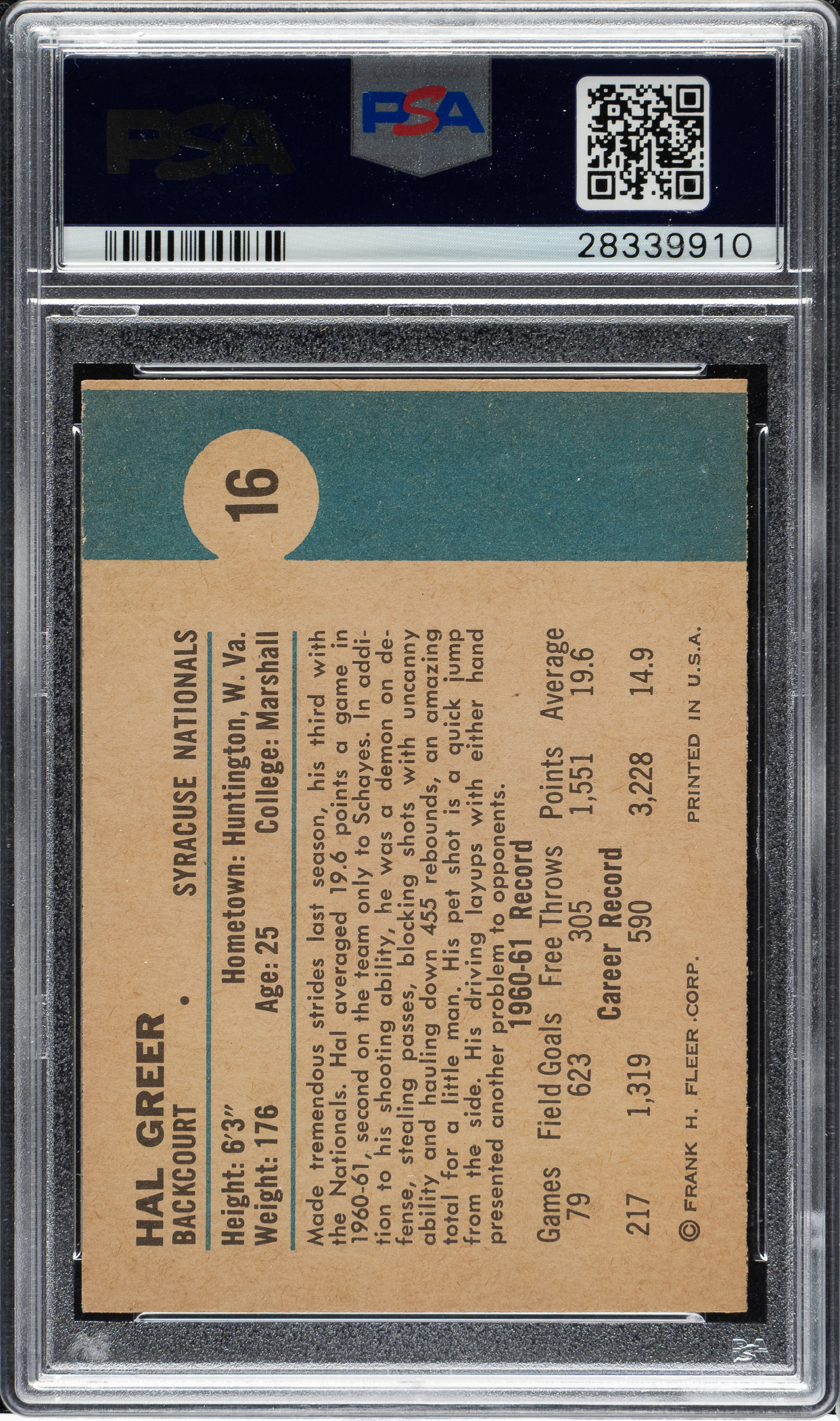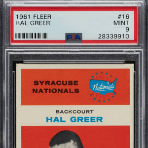 Graded MINT 9 by PSA. Only one example has been graded higher by PSA to date. Extremely desirable high-grade example of Syracuse Nationals Hall of Famer Hal Greer from the classic 1961-1962 Fleer basketball set. Bright, crisp, and clean with four sharp corners, bold colors, and excellent centering. Boldly printed reverse. A superb rookie card of Hal Greer from one of the most significant basketball sets ever produced.