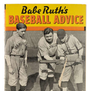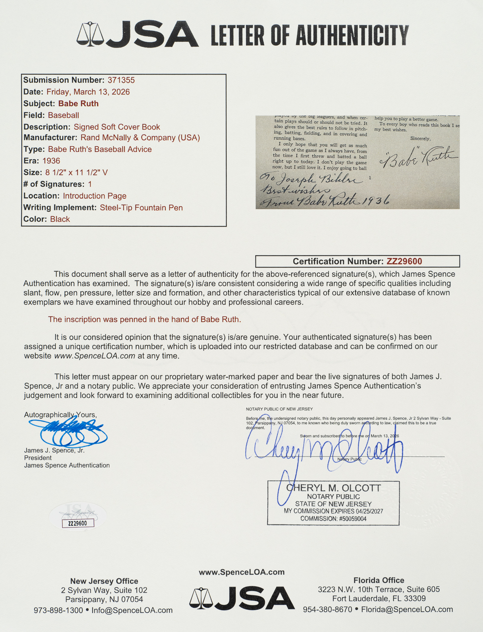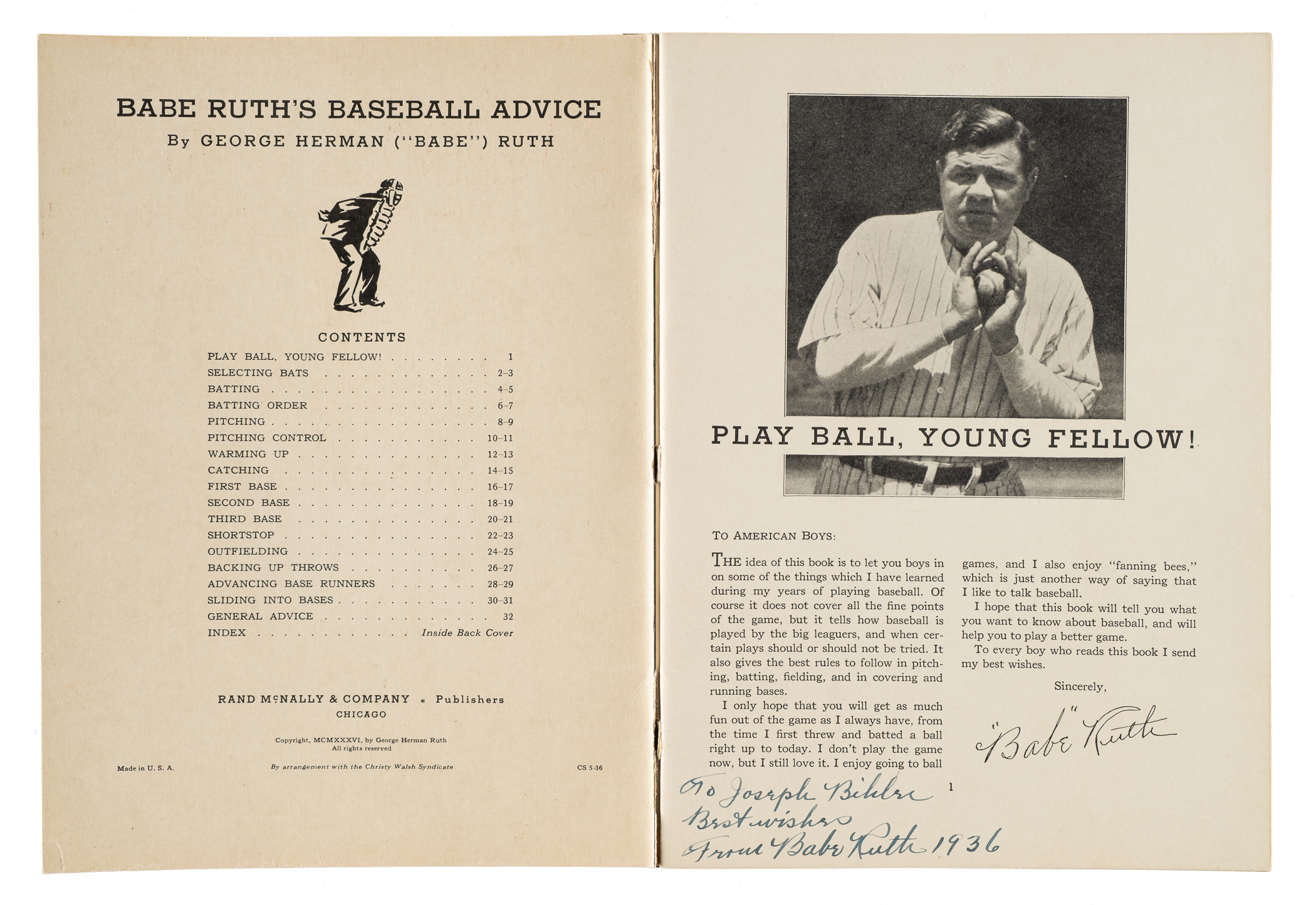 Presented is a signed copy of Babe Ruth's Baseball Advice (Rand McNally & Co., Chicago, 1936), featuring not only the signature of Babe Ruth but also an inscription and date from the legendary New York Yankees Hall of Famer. On the first interior page, Ruth has inscribed "To Joseph Bihler / Best Wishes / From Babe Ruth 1936" boldly in blue fountain pen. Joe Bihler was a very close business associate of Ruth. He worked for many years on Ruth's promotional projects under Christy Walsh, who was Ruth's business manager. The 32-page soft-cover book (8-1/4 x 11-1/4 inches) displays moderate handling including an area of paper loss on the front cover and a small tear on the bottom edge. In Good condition overall. In 1999, this item appeared as Lot 1048 in the historic sale of Barry Halper's collection; the original Sotheby's auction tag accompanies the book. Full LOA from James Spence/JSA.