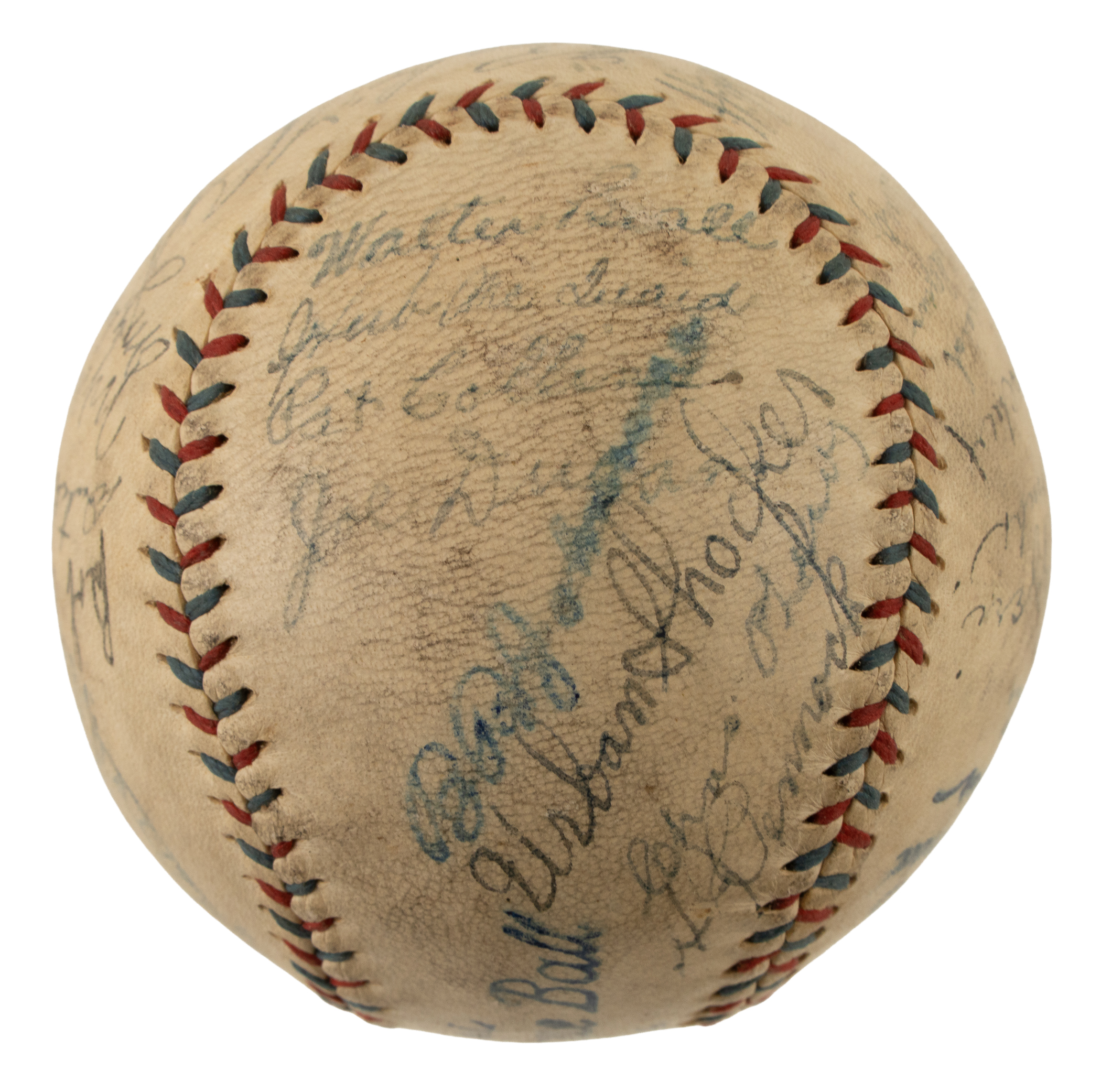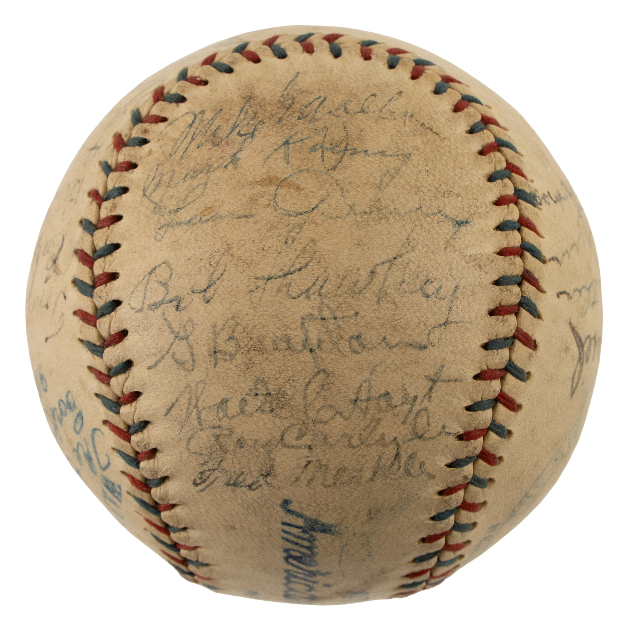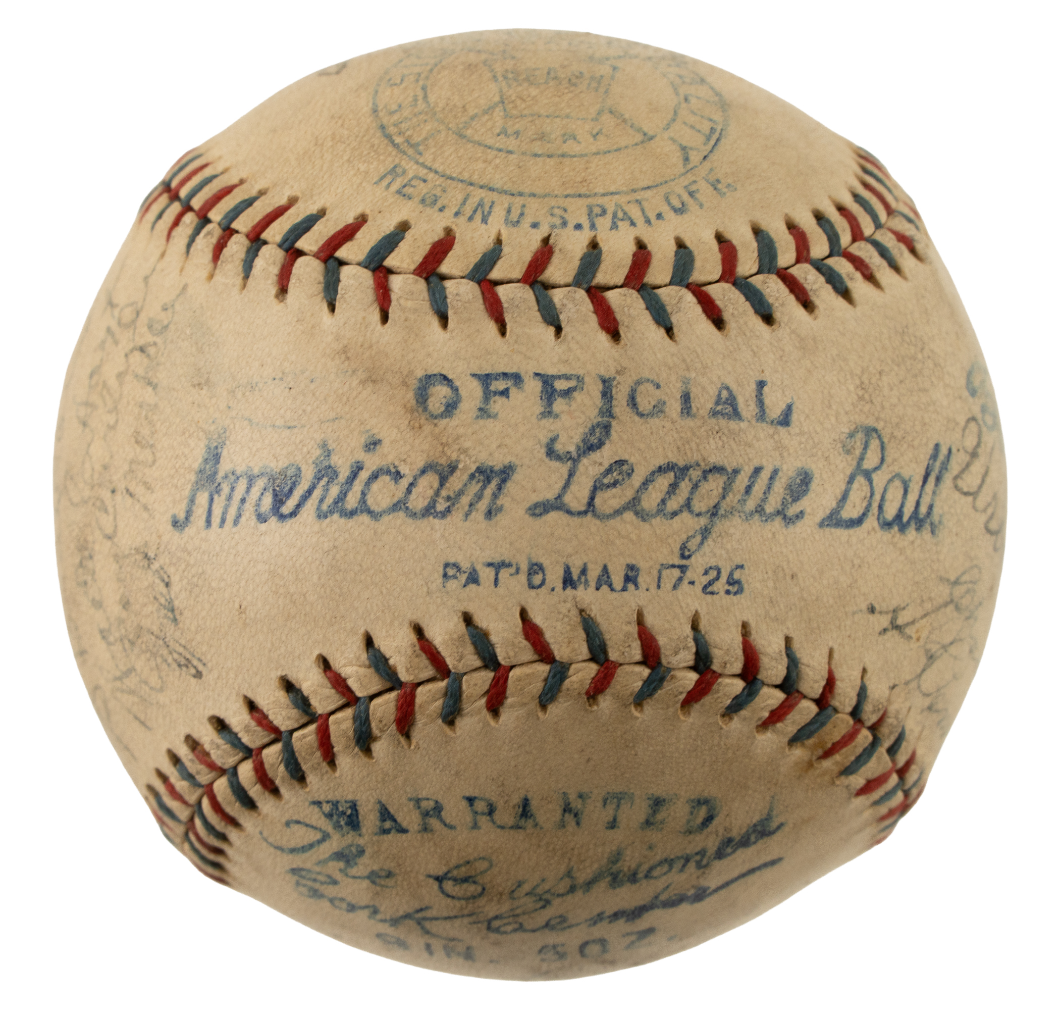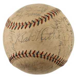 Official American League baseball (Johnson) signed in blue fountain pen by 27 members of the 1926 American League Champion New York Yankees, including Gehrig, Huggins (Mgr.), Lazzeri, Combs, Pennock, Hoyt, Shocker, Merkle (player/coach), Ward, Koenig, Meusel, P. Collins, Dugan, Paschal, Beall, McQuaid, O'Leary (coach), Ruether, Thomas, Gazella, Shawkey, Braxton, Carlyle, Severeid, Skiff, and Adams. (The signature of Babe Ruth across the sweet spot has been deemed a clubhouse version.) This 1926 New York Yankees team-signed ball is unique due to its exceptional provenance. It originates from the family member of pitcher Urban Shocker, who was a key member of the 1927 New York Yankees, and the baseball is one of a number of items consigned to this auction by Shocker's great-grandson (the remainder of the collection, which includes photos, game-used equipment, and other such items, is offered elsewhere in this auction). Shocker is one of the rarest of all 1927 New York Yankees signatures because of his untimely death in 1928 due to pneumonia. This is just the sixth Shocker signature we have ever offered, in any form. The ball is moderately toned and the manufacturer's stampings are bold and legible. In Very Good to Excellent condition overall. Mid-1920s era Yankees team balls are extremely scarce, and we cannot remember the last time we offered one dating from 1926. In our eyes, the fact that this ball was once part of Urban Shocker's personal collection adds to its significance and mystique. Full LOA from James Spence/JSA.