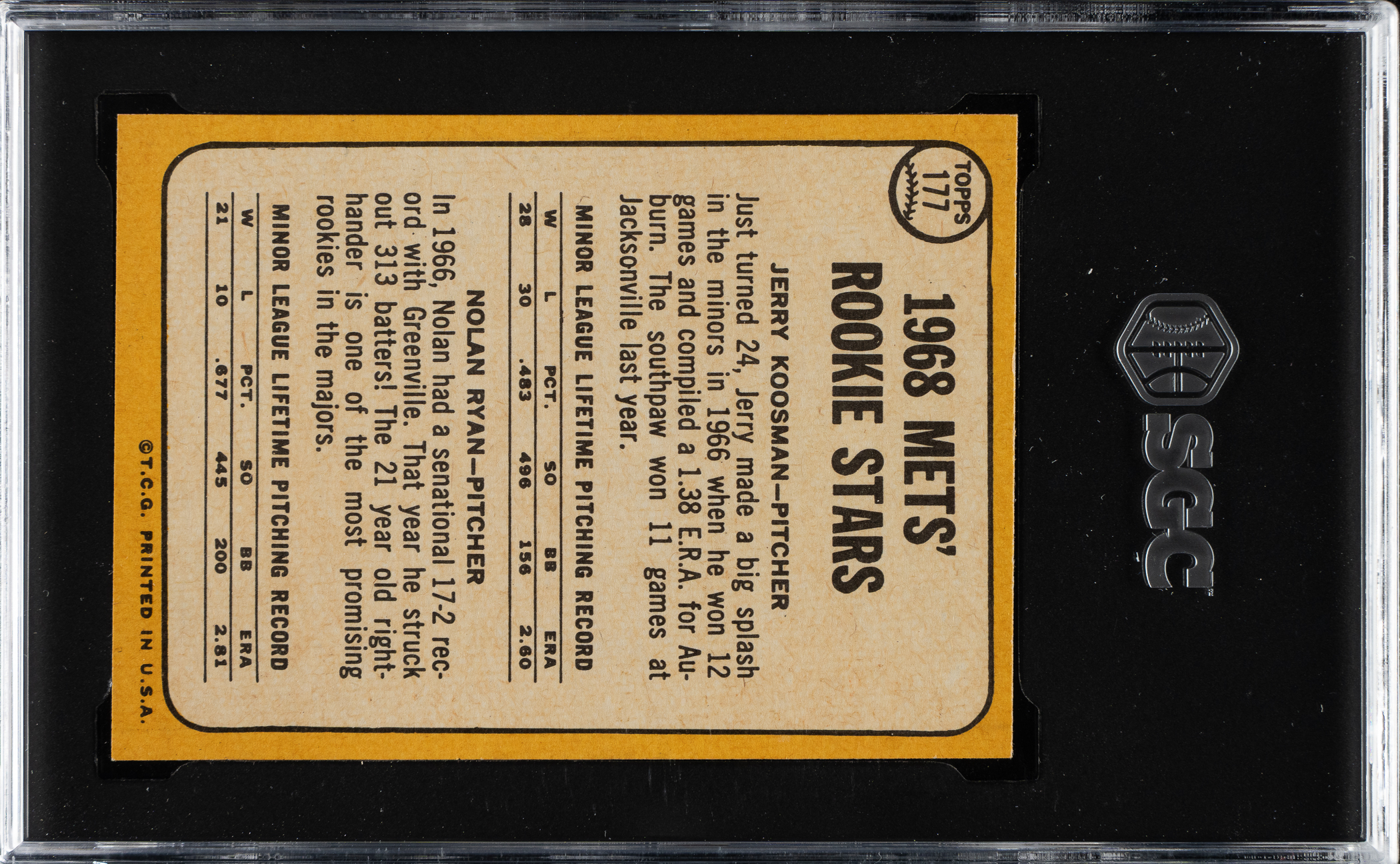 Graded NM/MT+ 8.5 by SGC. Presented is a superb high-grade example of Hall of Famer Nolan Ryan’s rookie card from the 1968 Topps set. Bright, crisp, and clean with brilliant colors, strong corners, and impressive centering. Boldly printed and clean reverse. This is an outstanding ultra-high-grade example worthy of any 1968 Topps, Nolan Ryan, or Hall of Fame rookie-card collection.