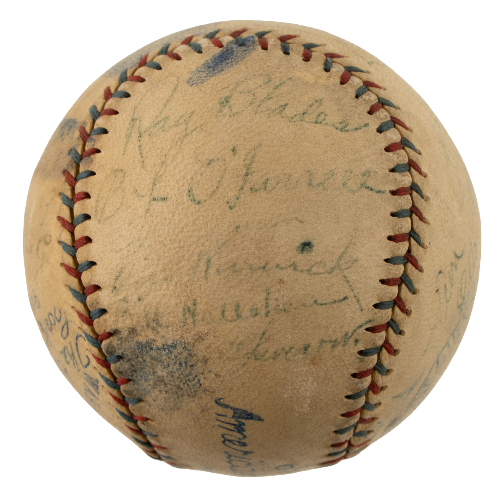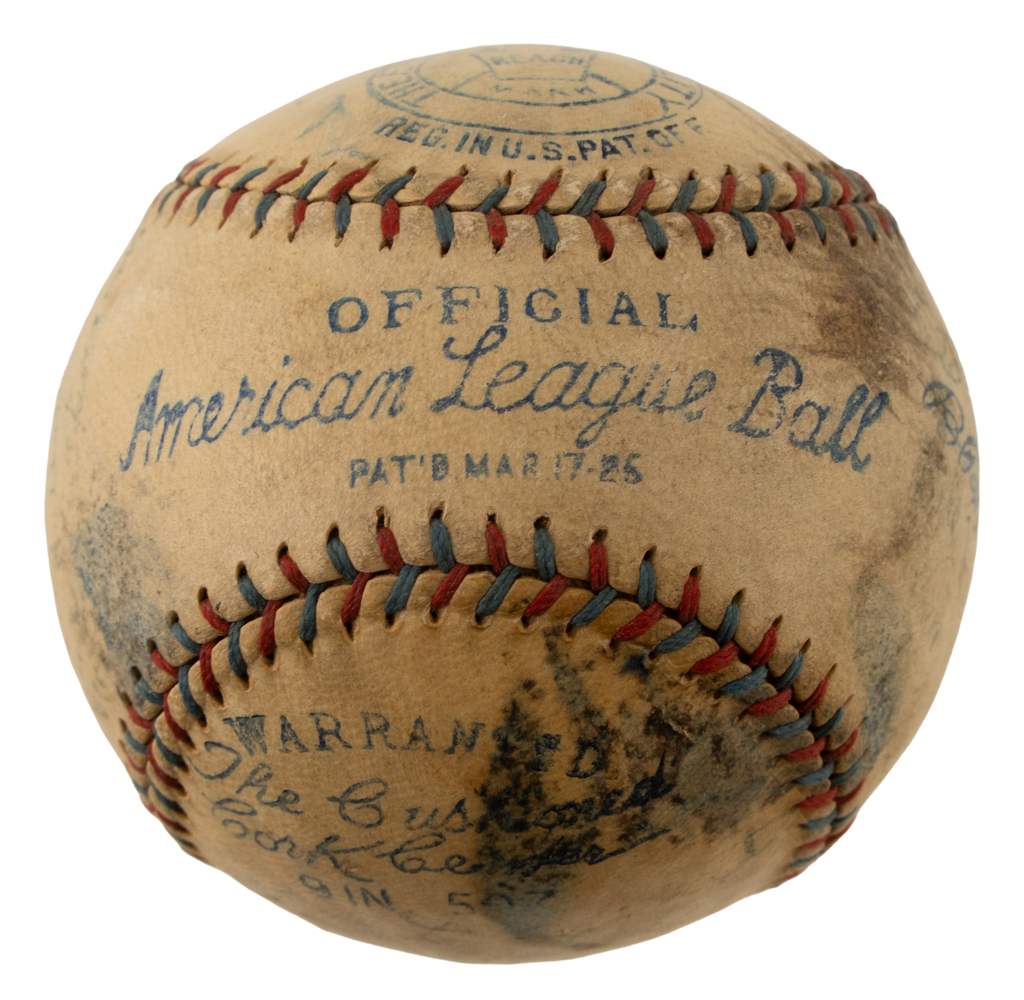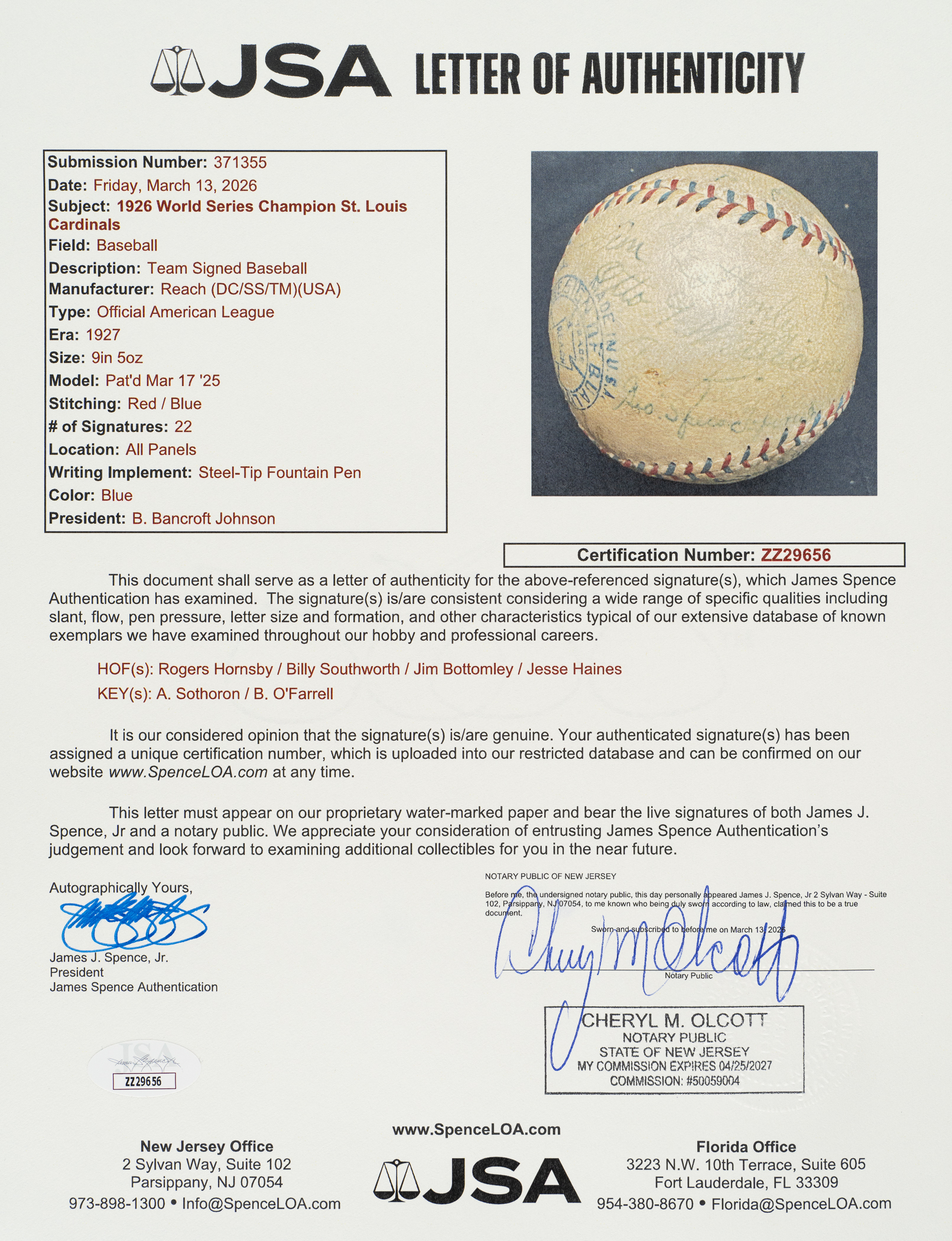 Official American League baseball (Johnson) signed in blue fountain pen by 22 members of the 1926 World Champion St. Louis Cardinals, including Hornsby (Mgr., sweet spot), Bottomley, Southworth, Haines, Toporcer, Blades, O'Farrell, Warwick, Hallahan, Sothoron, and Killefer (coach). This 1926 St. Louis Cardinals team-signed ball is unique due to its exceptional provenance. It originates from the family member of former pitcher Urban Shocker, who was a key member of the 1927 New York Yankees and is one of a number of items consigned to this auction by Shocker's great-grandson (the remainder of the collection, which includes photos, game-used equipment, and other such items, is offered elsewhere in this auction). The ball is lightly toned and the manufacturer's stampings are bold and legible. There is excess ink scattered throughout. In Good condition overall. Mid-1920s era Cardinals team balls are extremely scarce and we cannot remember the last time we offered one dating from 1926. In our eyes, the fact that this ball was once part of Urban Shocker's personal collection adds to its significance and mystique. Full LOA from James Spence/JSA.