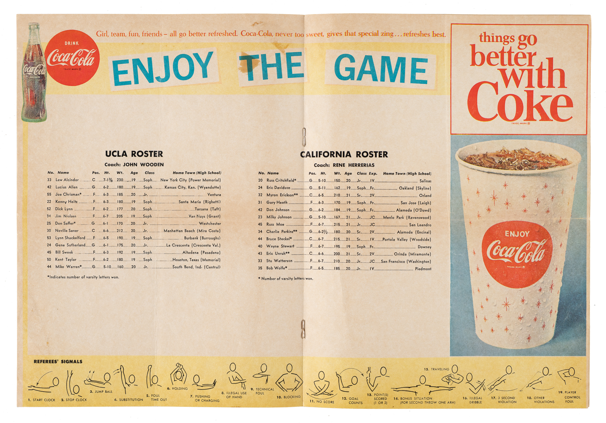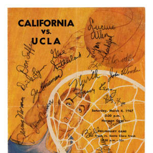 University of California program issued for a game against UCLA at Harmon Gym on March 4, 1967. The program is signed on the front cover by 17 individuals, predominantly in black ink. Notable signatures include John Wooden (UCLA head coach), Lew Alcindor (Kareem Abdul-Jabbar), and Lucius Allen. The program (7-5/8 x 10-1/2 inches) displays a horizontal and vertical fold. The back cover is missing, and presumably multiple interior pages. Additionally, there is creasing throughout and tape residue along the unscored scorecard and some of the interior pages. Poor condition overall.