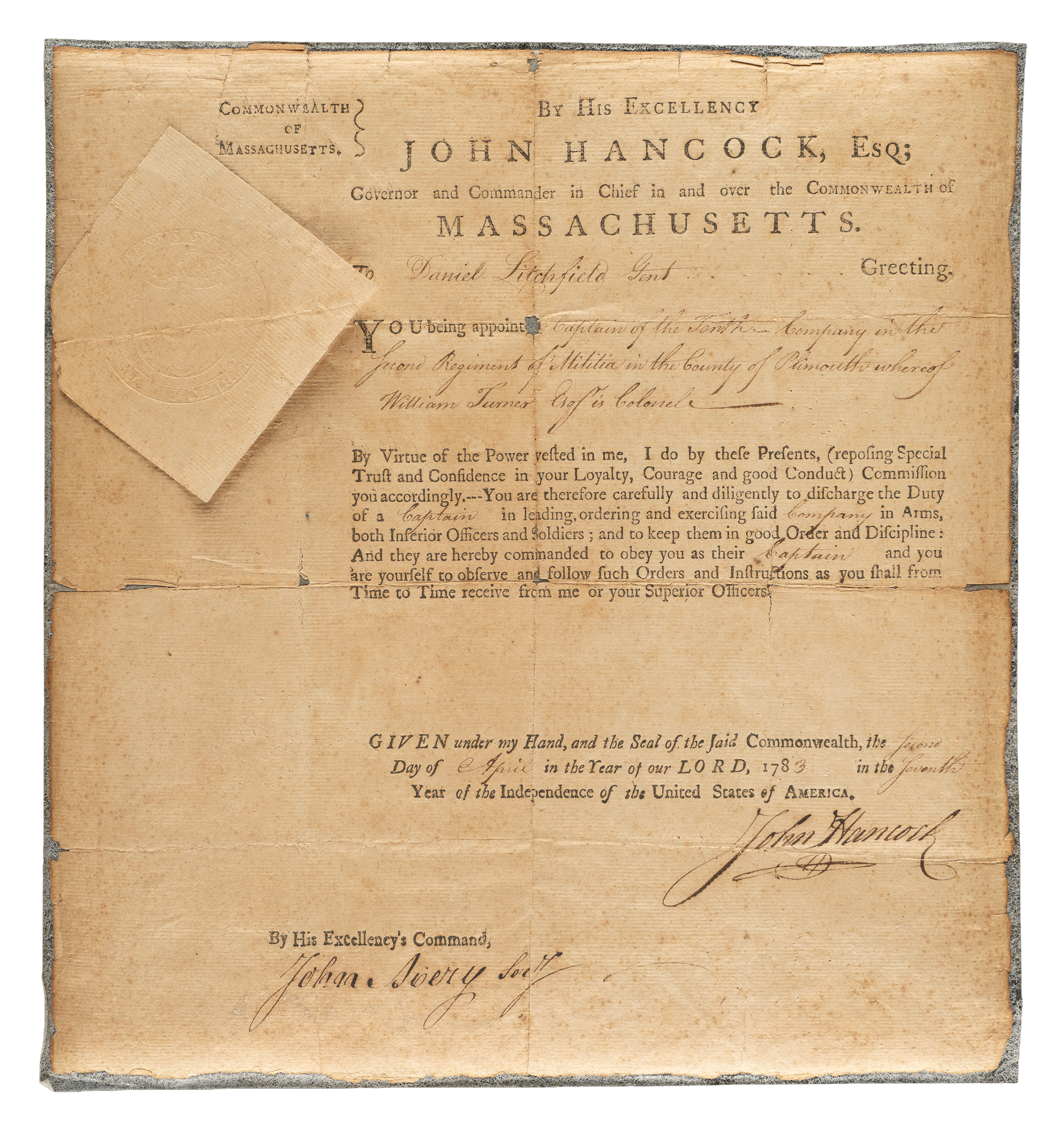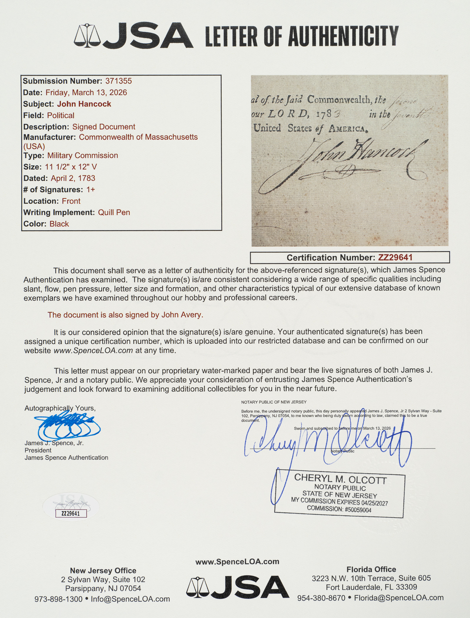 One-page military appointment, dated April 2, 1783, boldly signed in black ink by John Hancock (1737-1793), Massachusetts statesman and first signer of the Declaration of Independence. Hancock's signature, which is customarily large (it measures 3.5 inches in length) is boldly scripted at the base of the document. This official document appoints "Daniel Litchfield Gent" to the rank of "Captain of the Tenth Company in the Second Regiment of Militia in the County of Plimouth whereof William Turner is Colonel" and is also signed by John Avery as secretary. John Hancock was one of the most important figures in the colonies' struggle for independence. As president of the Continental Congress (1775-77), Hancock was instrumental in helping to both organize and fund the revolution. Today, of course, he is best known as the first signer of the Declaration of Independence in 1776. Hancock served as Governor of Massachusetts from October 25, 1780 through January 29, 1785, and then again from May 30, 1787 until his death on October 8, 1793. John Hancock is a requisite signature for any advanced historical autograph collection. The signature offered here, which mirrors that on the Declaration of Independence in style, is an outstanding example and one that would appeal to even the most discriminating collector. The document (approximately 11.25 x 12 inches), which has both a vertical and three horizontal folds, displays a number of small tears along the fold lines and edges. The official state seal (badly faded) remains affixed in the upper left corner. For the purpose of preservation, this piece has been professionally affixed to rice paper. Full LOA from James Spence/JSA.