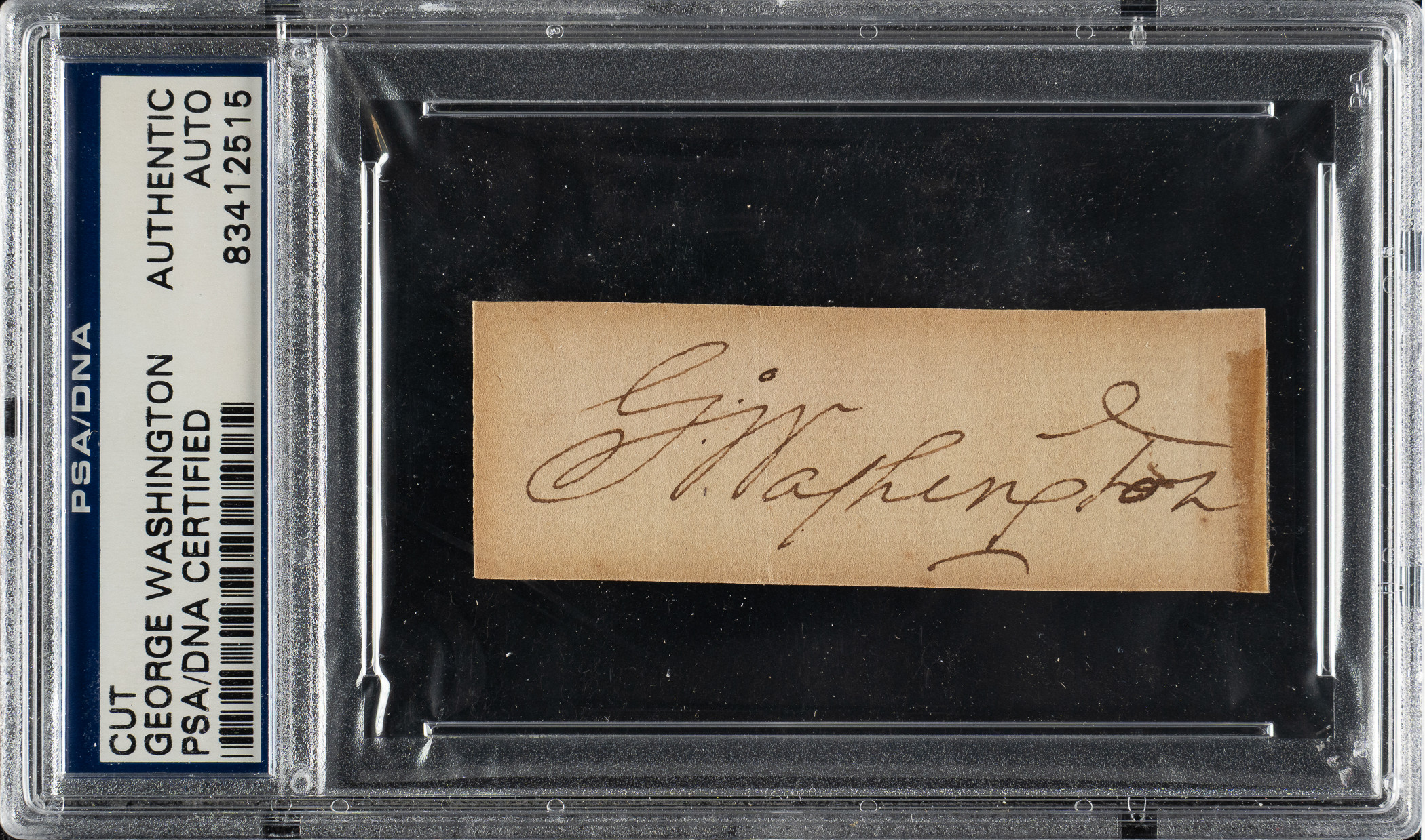 Cut signature of George Washington (1732-1799), first President of the United States. Washington's signature, "G Washington," has been scripted in black ink on a document fragment (3 x 1 inches). PSA/DNA has encapsulated the cut and certified the signature as "Authentic." George Washington signatures are extremely desirable and far rarer than that of other presidents. This cut is a particularly outstanding example, not to mention a relatively affordable one when compared to a Washington signature on a complete document or letter. The cut remains in Very Good condition overall.