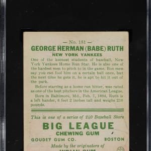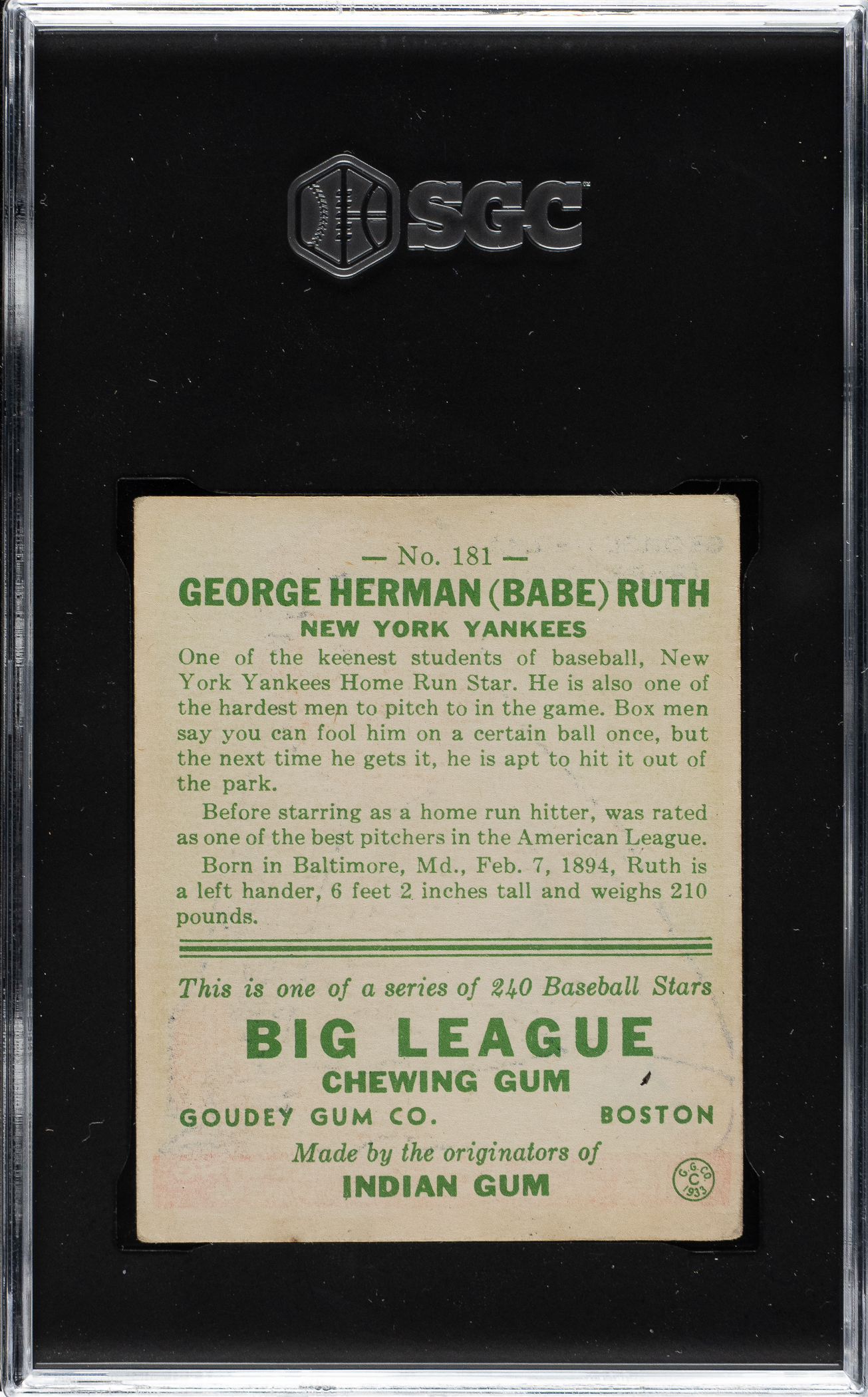 Graded VG/EX 4 by SGC. Mid-grade example of one of Babe Ruth’s classic cards: #181, green background, from the 1933 Goudey series. This card has outstanding registration, light corner wear, and centering towards the upper left. Clean reverse with bold green text. In an extremely desirable condition, this is an ideal card for the collector who wants an appealing 1933 Goudey #181 Babe Ruth.