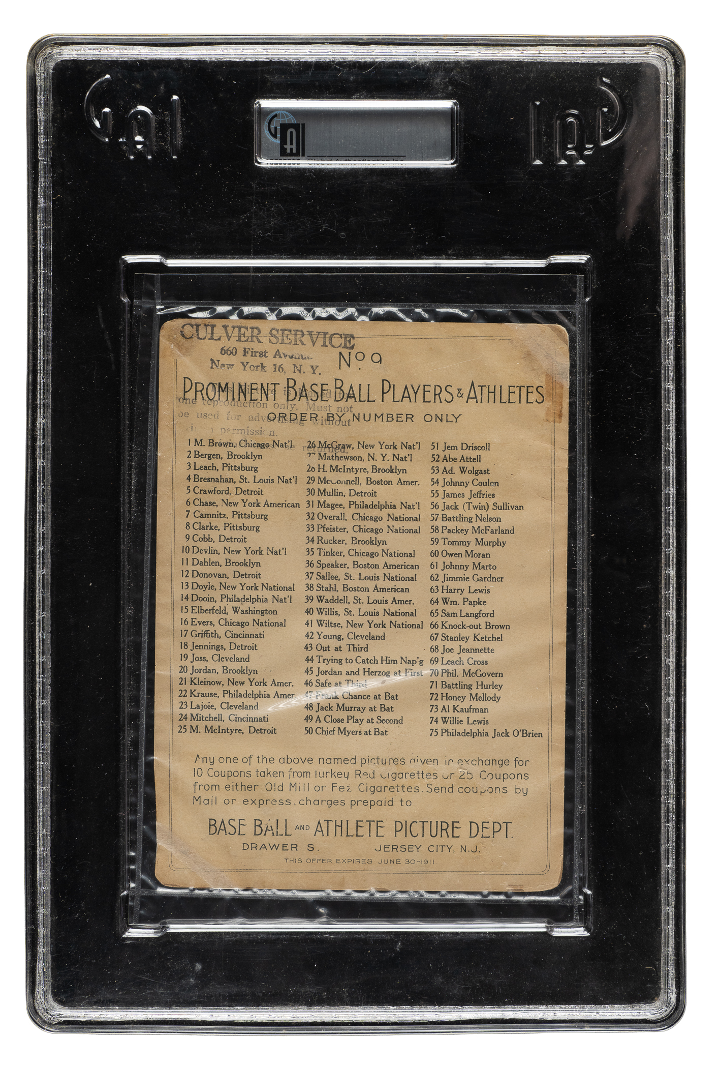 Presented is one of vintage-card collecting's most recognizable icons and the key card of the 1911 Turkey Red Tobacco cabinet-card series: #9 Ty Cobb. Besides being the most valuable card in the set, it is also one of the most desirable and striking of all Cobb cards. This example has vibrant colors, outstanding registration, and moderate corner wear. The checklist back (with offer) is boldly printed. Encapsulated as "Authentic" by GAI due to an irregular hand cut along the right edge. The card also displays heavy creasing and a "Culver Service" ink stamp on the reverse, as well as a few spots of paper loss. Despite these flaws, this is a presentable example of this classic card. The classic Turkey Red set is considered by many to be the most beautiful and well-made tobacco set ever issued. The T3 Ty Cobb has always been and will always be in high demand, especially a relatively affordable example such as this.