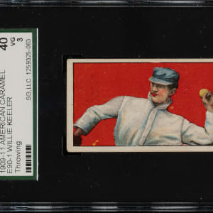 Graded VG 40 by SGC. Presented is a strong mid-grade example of one of the key rarities in the entire E90-1 American Caramel series (and of all caramel cards): the horizontal throwing pose of Hall of Famer Wee Willie Keeler. Reminiscent of Christy Mathewson in the 1914 and 1915 Cracker Jack sets, Keeler is a key Hall of Famer who has two poses in the E90-1 set. The portrait pose is relatively common. The horizontal throwing pose is extremely rare. This card is bright and clean, both front and back, with a bold red background, honest corner wear, and a couple light creases. Clean reverse. This is a tremendous example of a key Hall of Famer rarity from the most popular caramel-card set of the era.