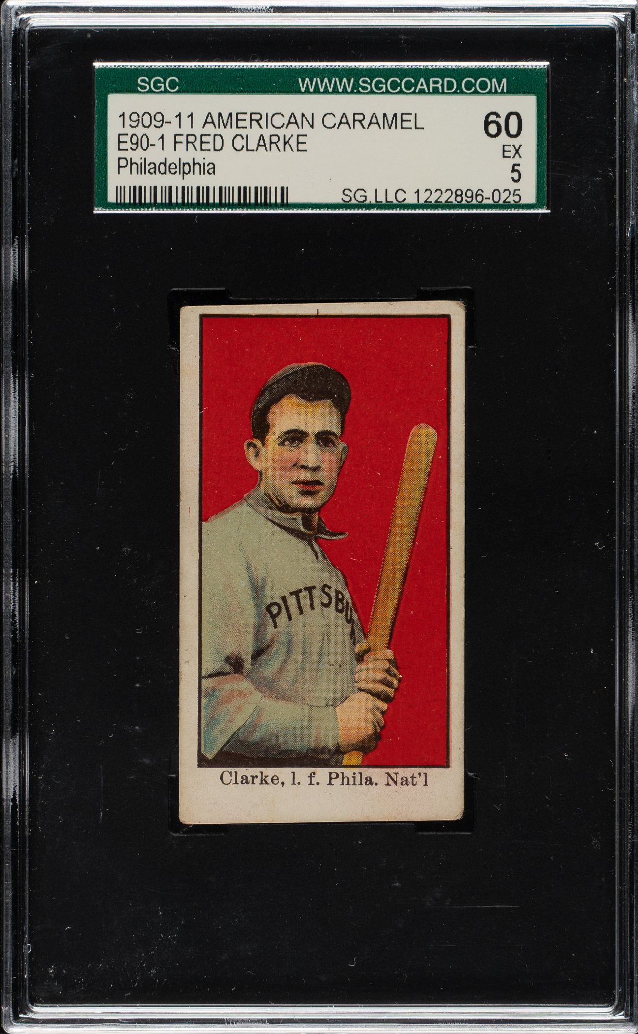 Graded EX 60 by SGC. Hall of Famer Fred Clarke as a member of the Philadelphia Phillies. Clarke appears on two cards in this set, both a batting pose; one depicting him with Philadelphia and the other depicting him with Pittsburgh, the more common of which is offered here.