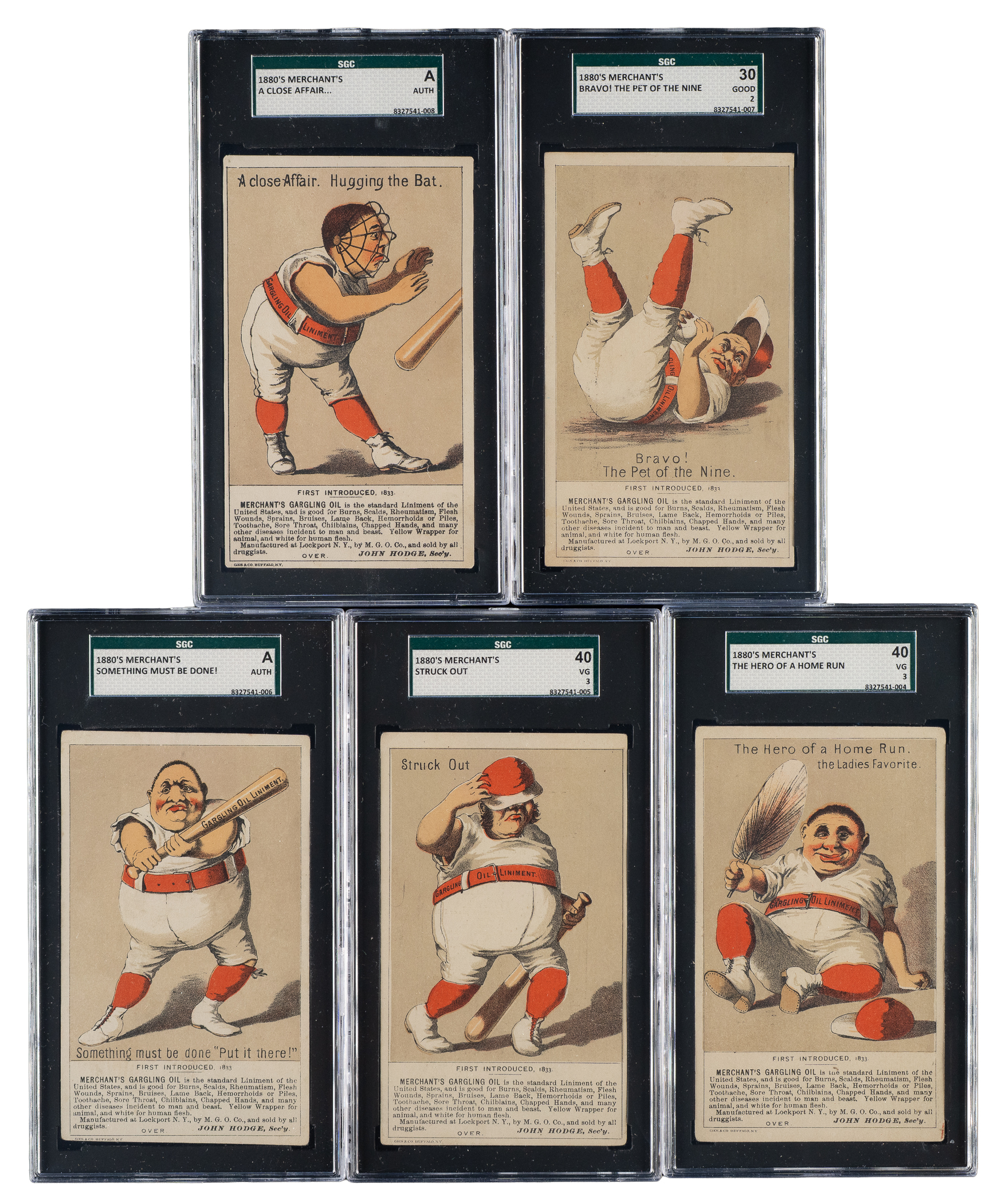 Complete set of 1880s H804-7 “Merchant’s Gargling Oil Series” trade cards, each professionally graded and encapsulated by SGC. This set consists of the following: A Close Affair. Hugging the Bat (Authentic), Bravo! The Pet of the Nine (GOOD 30), Something must be done "Put it there!" (Authentic), Struck Out (VG 40), and The Hero of a Home Run. the Ladies Favorite (VG 40). Total: 5 cards.
