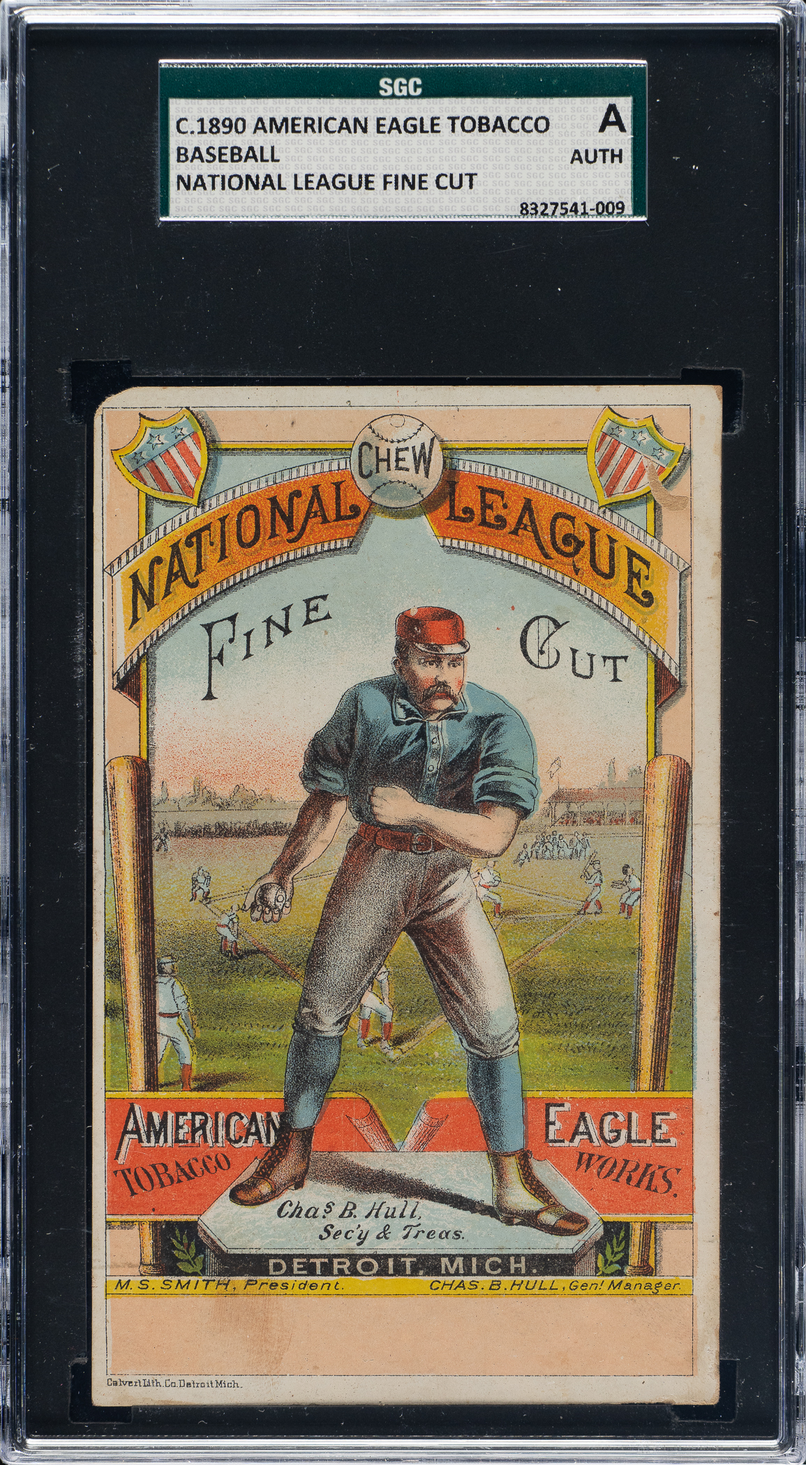Circa 1888 American Eagle Tobacco trade card advertising the company's "National League Fine Cut" tobacco brand. The trade card (3 x 5 inches) pictures Charles B. Hull, who is listed as the general manager, secretary, and treasurer of American Eagle Tobacco Company. Manufacturing information regarding American Eagle Tobacco appears on the reverse. The trade card has a well-worn upper-left corner and evidence of album removal on the reverse. Encapsulated as "Authentic" by SGC due to a slight trim.