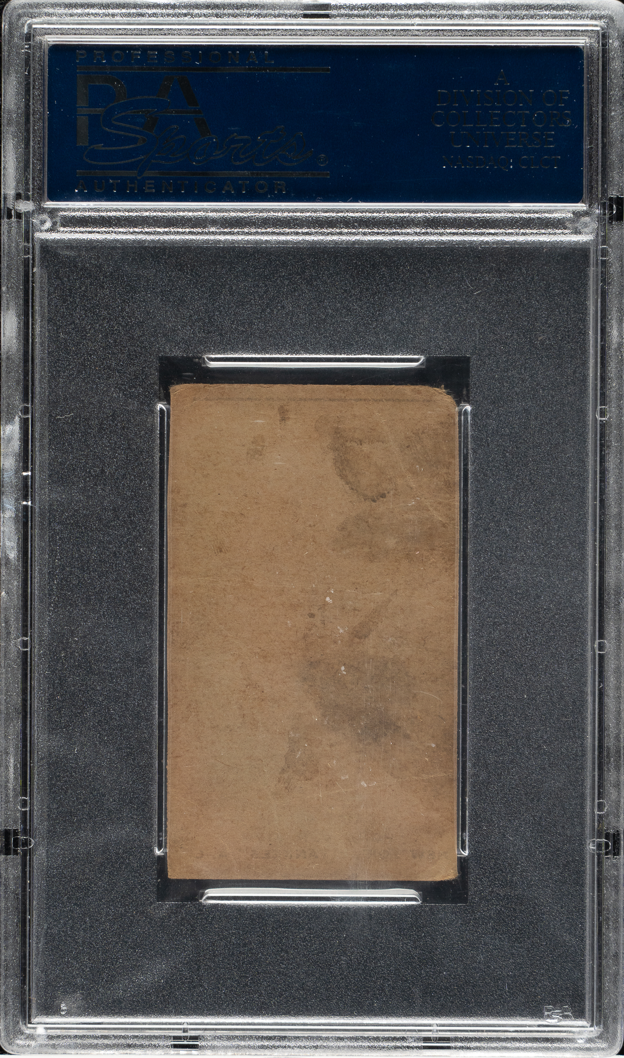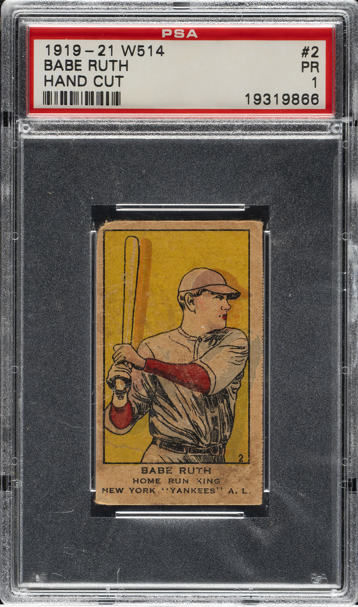Modestly graded example of New York Yankees Hall of Famer Babe Ruth from the W514 strip-card series. The W514 set is the largest and most widely collected of the various strip-card issues of the era. Babe Ruth is one of the key Hall of Famers in the W514 set. Strip cards are by definition hand-cut, as intended. The ever-so-slightly irregular cuts characteristic to the issue, which many times affect a small portion of the cutting guidelines, often disqualify cards from getting a numerical grade from the professional grading companies. The offered example is a rare exception, displaying an accurate cut on all sides. Ruth's image is "ghosted" and clearly visible upon close inspection. Graded POOR 1 by PSA largely due to heavy creasing, corner wear, and light soiling on the blank reverse. This is a very desirable low-grade example of one of Babe Ruth's classic 1920s strip cards.
