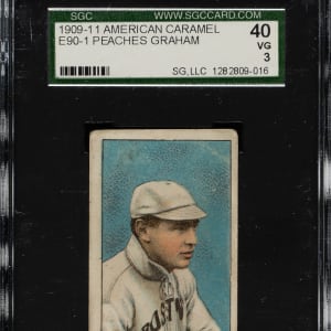 Graded VG 40 by SGC. Extremely attractive example featuring a striking portrait of Peaches Graham from the E90-1 American Caramel series. Graham has always been recognized as one of the rarest cards in the E90-1 set, and in the old days was thought of as being as rare as Mitchell, Cinn. Mitchell may have gotten more press and is now more famous and valuable, but in our experience Graham and several other key cards in the set (including Walsh) are just as rare. The card displays bright colors, a crisp image, and honest corner wear. Boldy printed reverse. This is a very strong example of this key rarity from the most popular caramel-card set of the era.