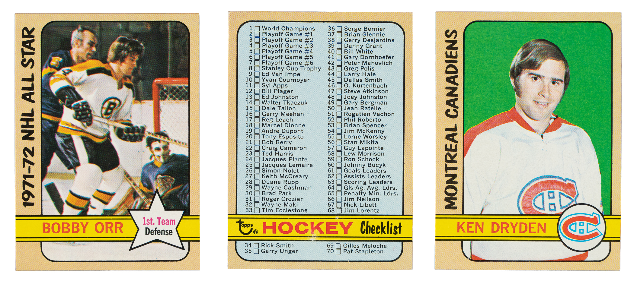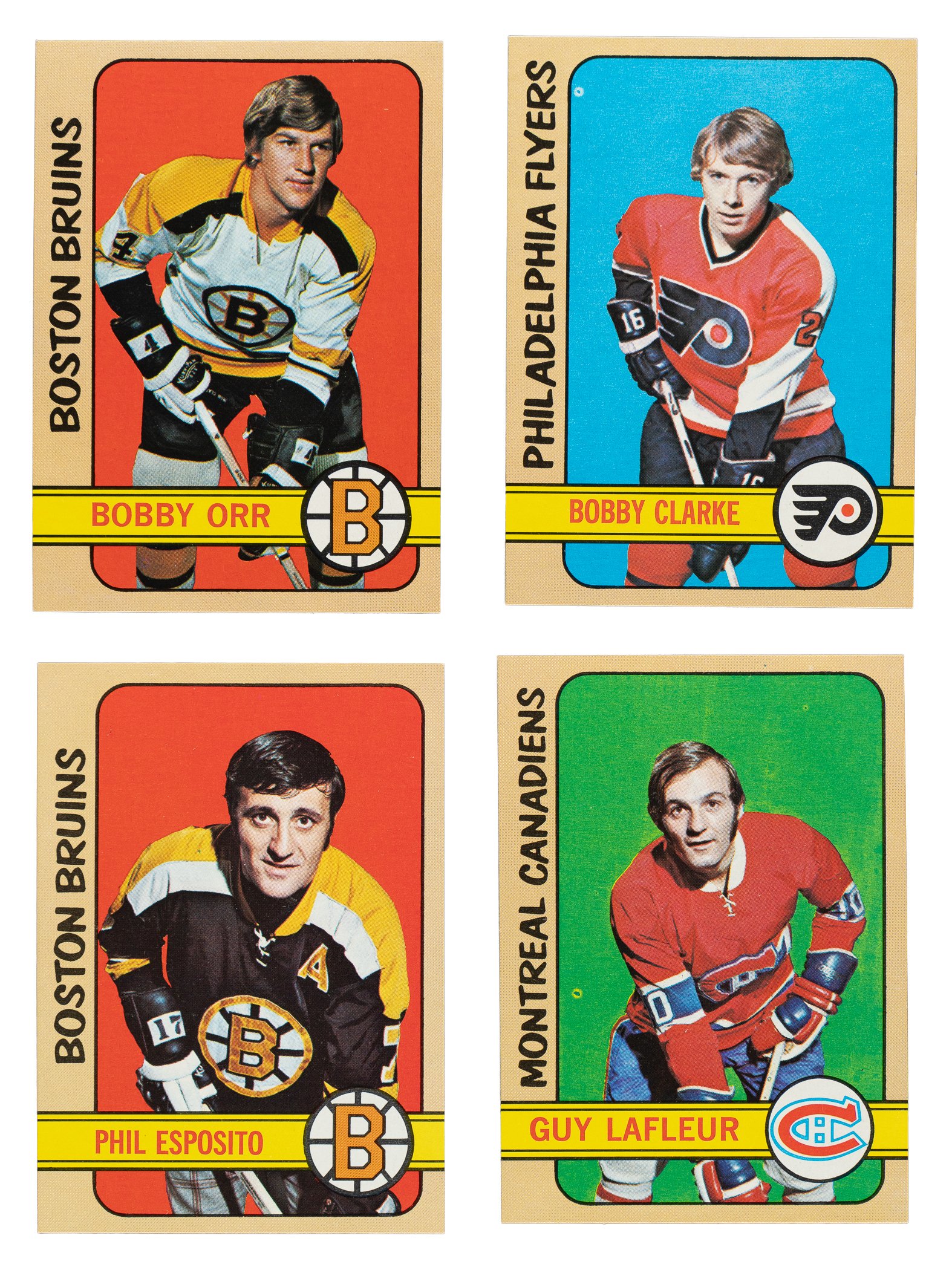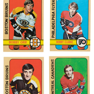 Extremely attractive and mostly high-grade complete set of 1972-1973 Topps hockey, The set is highlighted by many great stars of the era, including Hall of Famers Ken Dryden, Phil Esposito, and Bobby Orr. Condition is 65% Nr/Mt to Nr/Mt-Mt (including some Mint), 25% Ex to Ex-Mt, and 10% Vg to Vg-Ex (mostly Vg-Ex). Keys: #79 Lafleur (Nr/Mt-Mt), 90 Clarke (Nr/Mt-Mt), 94 Checklist (Ex), 100 Orr (Nr/Mt-Mt), 122 Orr AS (Nr/Mt-Mt), 126 Hull AS (), 150 P. Esposito (Nr/Mt-Mt), and 160 Dryden (Nr/Mt+). An outstanding complete set of this popular 1970s Topps hockey issue loaded with stars and highlights. Total: 176 cards.