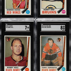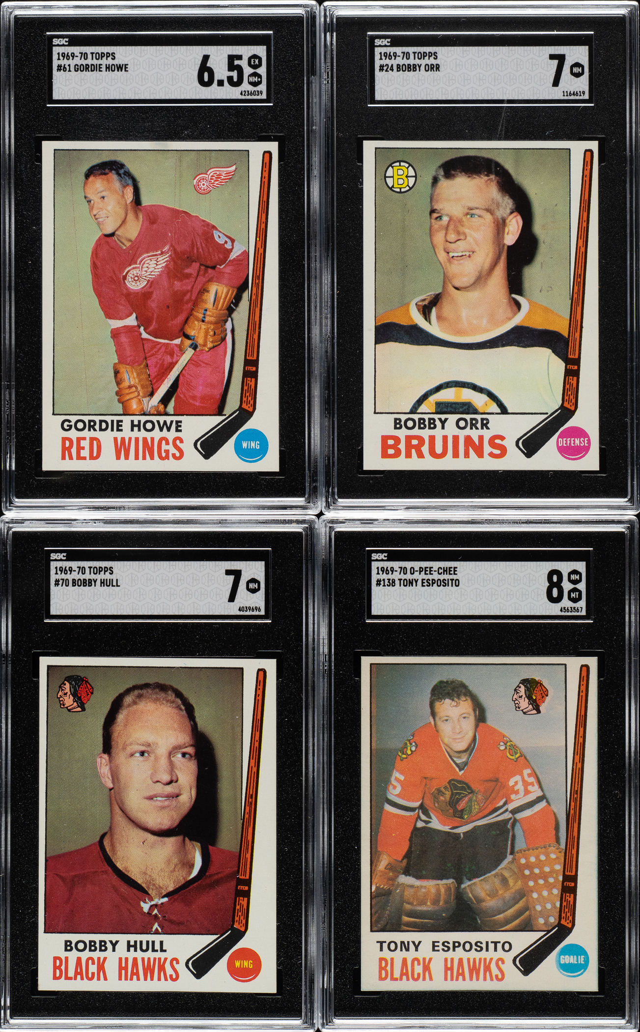 Presented is a very attractive and mostly high-grade collection of 1969-1970 hockey cards consisting of a complete 132-card set of Topps and a complete 99-card run of O-Pee-Chee Series 2 (#133-231). Hockey cards are much rarer than their baseball counterparts, and complete sets are offered with much less frequency as a result. We have selected six cards for grading and encapsulation by SGC. This collection consists of the following: 1) 1969-1970 Topps Complete Set (132): 45% Nr/Mt to Nr/Mt-Mt, 49% Ex to Ex-Mt, and 6% slightly lesser. Keys: #1 Worsley (Vg-Ex), 4 Savard RC (Ex due to centering), 24 Orr (NM 7), 30 P. Esposito (Ex-Mt+ due to centering), 61 Howe (EX/NM+ 6.5), 70 Hull (NM 7), 76 Mikita (Ex-Mt), and 132 Checklist (Ex). 2) 1969-1970 O-Pee-Chee Complete Series 2 Run (99 cards): 68% Nr/Mt to Nr/Mt-Mt (including some bordering on Mint) and 32% Ex to Ex-Mt (including some due solely to centering and a couple slightly lesser). Keys: #138 T. Esposito RC (NM/MT 8), 189 Sawchuk (Nr/Mt-Mt), 193 Howe Mr. Hockey (no number variation, Vg-Ex+), 205 Ross/Hart Trophies P. Esposito (#214 on back, Nr/Mt-Mt), 207 Vezina Trophy - Plante/Hall (Ex-Mt+ due mostly to centering), 209 Norris Trophy - Orr (NM+ 7.5), 212 Orr AS (NM/MT 8), 215 Howe AS (30/70 L/R, otherwise Nr/Mt+), and 216 Hull AS (65/35 L/R, otherwise Nr/Mt-Mt). Outstanding collection of these classic 1969-1970 hockey issues, loaded with Hall of Famers and stars of the era. Total: 231 cards.