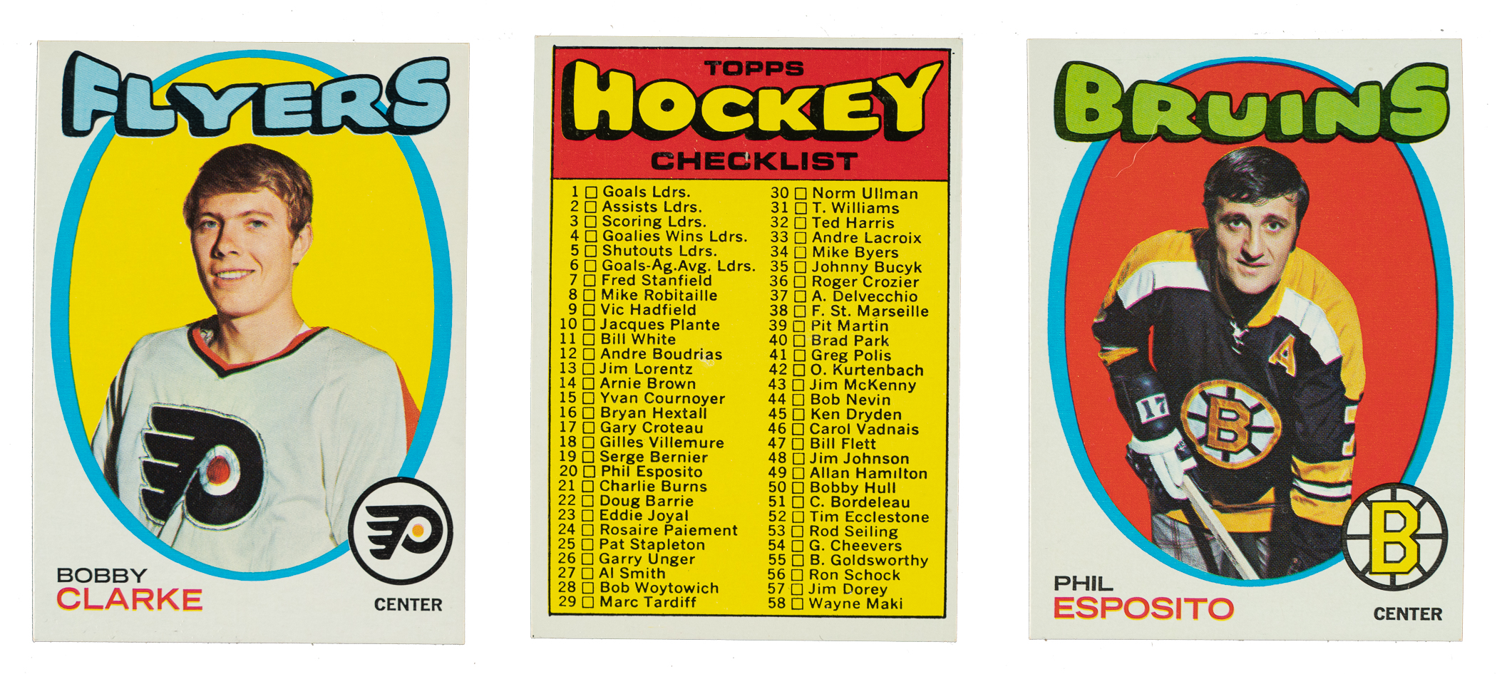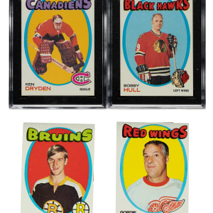 Outstanding high-grade complete set of 1971-1972 Topps Hockey. The set is highlighted by many great stars of the era, including Hall of Famers Ken Dryden (rookie), Bobby Hull, Phil Esposito, and Bobby Orr. Condition is 60% Nr/Mt to Nr/Mt-Mt and 40% Ex to Ex-Mt (including a few lesser and six that measure small). Keys: #20 P. Esposito (Nr/Mt+), 45 Dryden RC (NM 7), 50 Hull (NM/MT 8), 70 Howe (miscut centering on reverse, otherwise Ex-Mt), 100 Orr (Ex+), 111 Checklist (Ex-Mt+), and 114 Clarke (Ex-Mt). A very attractive high-grade complete set of this popular Topps hockey issue loaded with stars and highlights. Total: 132 cards.