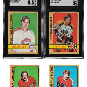 Very attractive complete set of 1972-1973 O-Pee-Chee hockey cards consisting of 340 different cards. Includes both variations of #334 Checklist and five Team Canada inserts (Bergman, Goldsworthy, Mikita, Parise, and White). Condition is 41% Nr/Mt to Nr/Mt-Mt, 36% Ex to Ex-Mt, and 23% Vg to Vg-Ex (including a couple Gd and 12% that measure small). We have selected two cards for grading and encapsulation by SGC. Keys: #8 Dionne (Vg-Ex+), 14 Clarke (Nr/Mt), 58 Orr Action (5/95 L/R and measures a bit small, otherwise Nr/Mt), 59 Lafleur (Nr/Mt+), 111 P. Esposito (Nr/Mt-Mt), 129 Orr (NM/MT 8), 145 Dryden (NM/MT+ 8.5), 227 Orr/Park AS (measures a bit small, otherwise Ex+), 228 Hull AS (Vg-Ex+), 280 NHL Scoring Ldrs (measures small, otherwise Ex due to centering), and 336 Hull (measures small, otherwise Ex due solely to centering). Notwithstanding the presence of some cards that measure factory small (a common characteristic for this set), this is an extremely attractive mid- to high-grade complete set of this popular 1970s O-Pee-Chee hockey issue loaded with stars and highlights. Total: 346 cards.