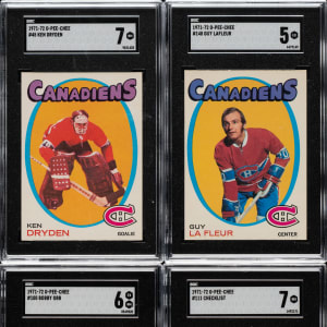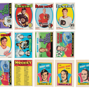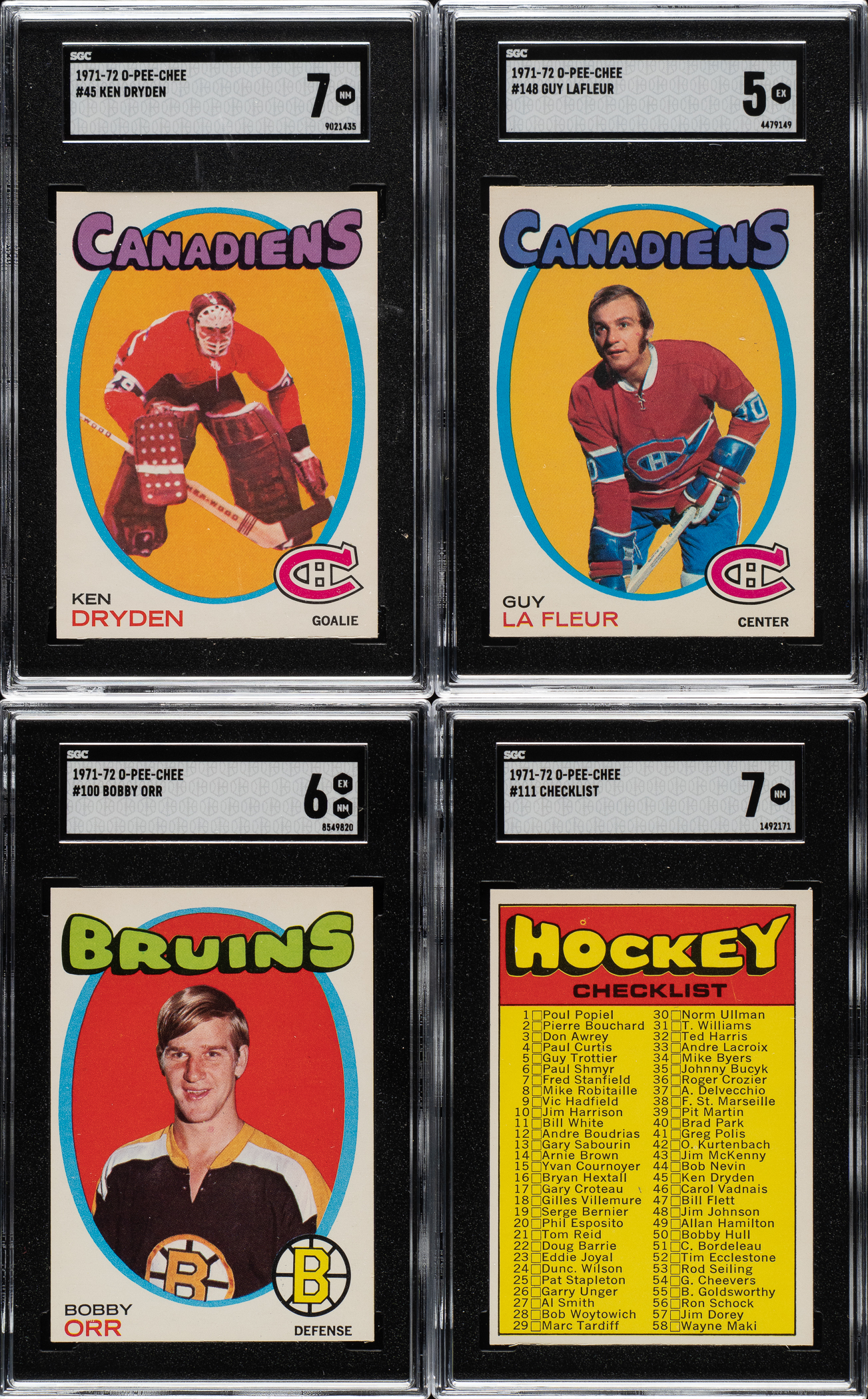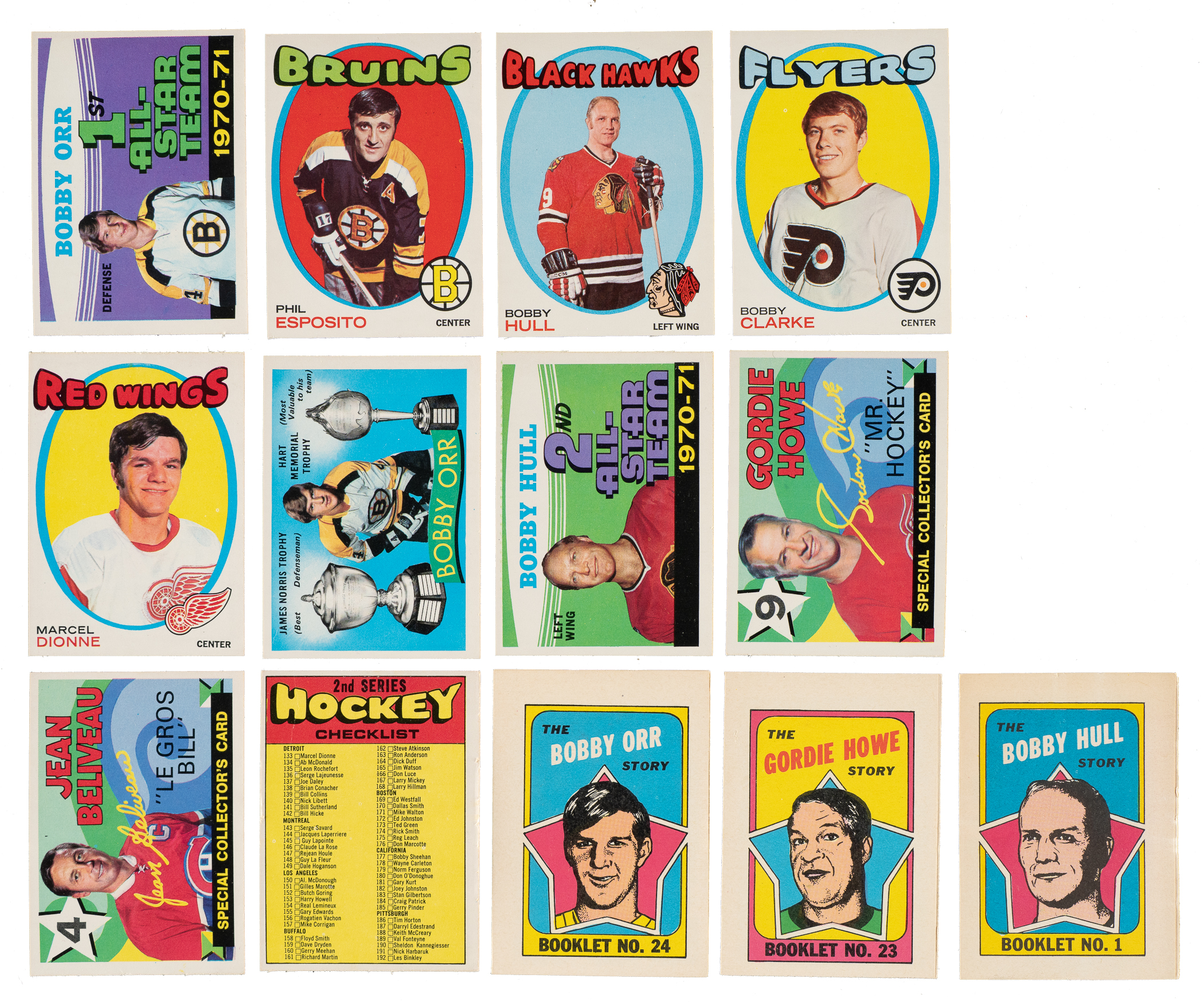 Very attractive mid- to high-grade complete set of 1971-1972 O-Pee-Chee hockey, The set is highlighted by many great stars of the era, including Bobby Hull, Bobby Orr, and the rookie cards of Ken Dryden, Marcel Dionne, and Guy Lafleur. Condition is 50% Nr/Mt to Nr/Mt-Mt (mostly Nr/Mt), 44% Ex to Ex-Mt, and 6% Vg to Vg-Ex (including a couple that measure small). We have selected four cards for grading and encapsulation by SGC. Keys: #20 P. Esposito (Nr/Mt), 45 Dryden RC (NM 7), 50 Hull (Ex-Mt), 100 Orr (EX/NM 6), 111 Checklist (NM 7), 114 Clarke (Nr/Mt), 133 Dionne RC (Vg-Ex), 148 Lafleur RC (EX 5), 245 Norris Trophy-Orr (Vg-Ex+), 251 Orr AS (Nr/Mt), 261 Hull AS (Vg-Ex+), 262 Howe Retires (Ex-Mt), 263 Beliveau Retires (Nr/Mt), and 264 Checklist (Vg). Also included is a complete set of twenty-four 1971-1972 O-Pee-Chee Story Booklets, ranging from Vg-Ex to Nr/Mt (averaging Ex), with one slightly lesser. Keys: #1 Hull (Vg+), 23 Howe (Vg-Ex), and 24 Orr (Ex-Mt). An extremely attractive complete set of this popular 1970s hockey issue, highlighted by a high-grade example of the key card to the set, the #45 Ken Dryden rookie. Total: 288 items (set of 264 plus 24 booklets).
