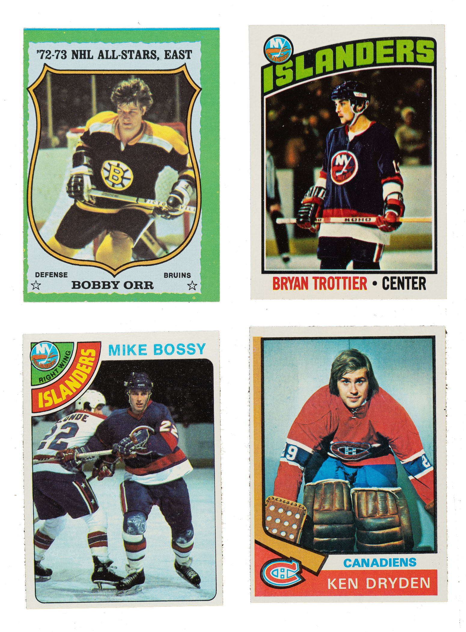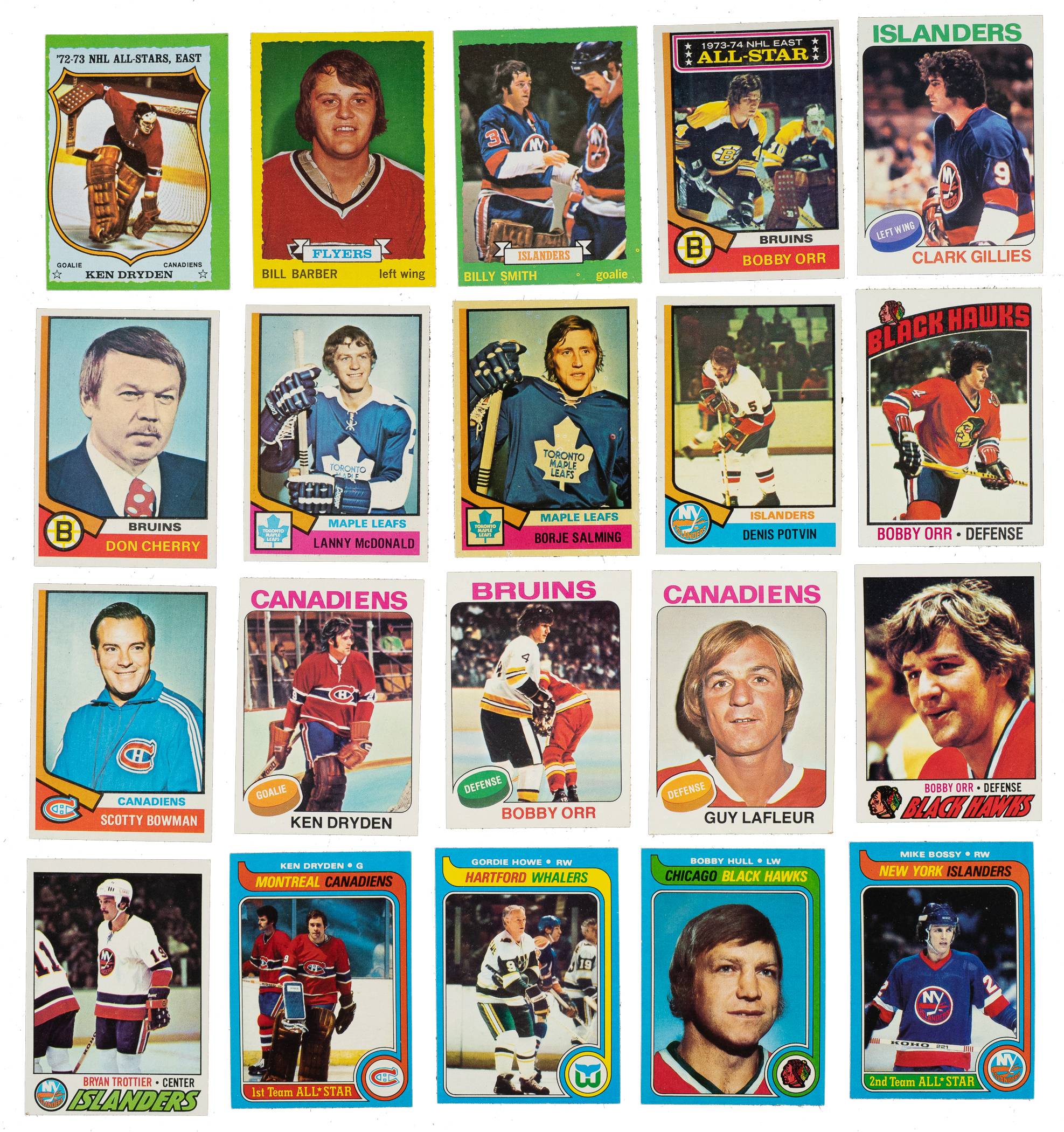 Outstanding collection of seven mid- to high-grade complete and near-complete Topps hockey sets (missing just the Wayne Gretzky rookie for a complete set run) spanning the years 1973 to 1979. These sets are loaded with all the stars, Hall of Famers, and rookies of the era, including Ken Dryden, Bobby Orr, Bryan Trottier (rookie), Clark Gillies (rookie), and others. Included are four complete and near-complete insert sets. This collection consists of the following: 1) 1973-1974 Complete Set (198): Condition is 20% Nr/Mt to Nr/Mt-Mt, 42% Ex to Ex-Mt, and 38% lesser (ranging from Gd to Vg-Ex and including some due to miscut centering). Keys: #10 Dryden (Ex due to centering), 72 Lafleur (Ex-Mt+), 81 Barber RC (Nr/Mt-Mt+), 149 Schultz RC (Vg-Ex+), 150 Orr (Ex+ due to centering), and 162 Smith RC (Ex+). 2) 1974-1975 Complete Set (264) Plus Near-Complete Cloth Stickers Insert Set (22/24): Condition of the base set is 44% Nr/Mt to Nr/Mt-Mt, 46% Ex to Ex-Mt, and 10% Vg to Vg-Ex. Condition of the stickers ranges is Ex-Mt to Nr/Mt overall, with a couple higher and lower. Keys: #100 Orr (Nr/Mt due solely to centering), 130 Orr AS (Ex-Mt), 155 Dryden (20/80 L/R, otherwise Nr/Mt), 161 Cherry RC (Ex+), 168 McDonald RC (Nr/Mt-Mt), 180 Salming RC (Nr/Mt due mostly to color toning), 195 Potvin RC (Nr/Mt+), 200 P. Esposito (Nr/Mt), 232 Lafleur (slight tilt to picture, otherwise Ex-Mt), and 261 Bowman RC (Nr/Mt-Mt). Missing Islanders and NHL Logo for completion of sticker set. 3) 1975-1976 Complete Set (330): Condition is43% Nr/Mt to Nr/Mt-Mt, 41% Ex to Ex-Mt, and 16% Vg to Vg-Ex. Keys: #35 Dryden (Ex-Mt), 100 Orr (Ex), 126 Lafleur (Vg-Ex), and 199 Gillies RC (Ex). 4) 1976-1977 Complete Set (264) Plus Complete Insert Set (22): Condition of the base set is 62% Nr/Mt to Nr/Mt-Mt (mostly Nr/Mt due to slight bowing), 30% Ex to Ex-Mt, and 8% Vg to Vg-Ex. Condition of the Glossy insert set ranges from Ex-Mt to Nr/Mt-Mt (averaging Nr/Mt). Keys: #115 Trottier RC (Ex+) and 213 Orr (Ex due solely to print defect on reverse). 5) 1977-1978 Complete Set (264) Plus Complete Glossy Insert Set (22): Condition of the base set is 24% Nr/Mt to Nr/Mt-Mt, 64% Ex to Ex-Mt (including some due solely to centering), and 12% Vg to Vg-Ex (including 3% Gd). Condition of the Glossy insert set (square-cornered version) is 75% Nr/Mt or better and 25% lesser (ranging from Vg-Ex to Ex-Mt). Keys: #105 Trottier (Ex) and 251 Orr (85/15 T/B, otherwise Nr/Mt-Mt). 6) 1978-1979 Complete Set (264): Condition is 49% Nr/Mt to Nr/Mt-Mt, 41% Ex to Ex-Mt, and 10% Vg to Vg-Ex. Key: #1 Bossy HL (Vg), 50 Dryden (Nr/Mt), 115 Bossy RC (Nr/Mt-Mt), and 168 Wilson RC (Ex due to centering). 7) 1979-1980 Complete Set (263/264) Plus Near-Complete Helmet and Decals Insert Set (17/21) Plus Five Variations: Missing #18 Gretzky for completion. Condition of the base set is 50% Nr/Mt to Nr/Mt-Mt and 50% Ex to Ex-Mt (including 3% slightly lesser). Condition of the inserts ranges from Vg-Ex to Nr/Mt (averaging Ex/Ex-Mt). Keys: #150 Dryden (Nr/Mt), 175 Howe (Nr/Mt+), 185 Hull (Nr/Mt), 230 Bossy (Ex-Mt due to centering), and 261 1979-80 Entries (Ex+). Helmet and Decals set is missing the following four cards for completion: Jets, Nordiques, Oilers, and Whalers. This is an outstanding collection of Topps hockey cards from the 1970s. Total: 1,934 cards. The size/weight of this item requires that there will be an additional shipping charge for this lot.