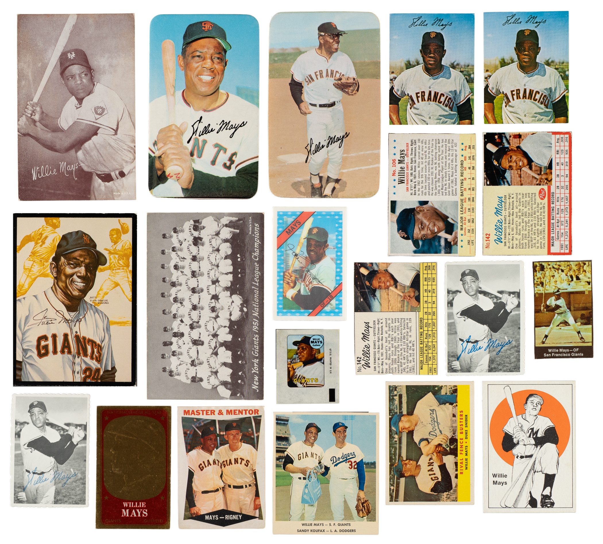Willie Mays' popularity knew no bounds, as evidenced by this diverse grouping of cards. Impressive collection of twenty-four (twenty-two different) Willie Mays cards, issued between 1958 and 1983. This collection consists of the following: 1-2) 1947-1966 Exhibits (2 cards):1951 New York Giants Team w/ Mays (Vg-Ex) and Mays/batting (Vg-Ex, "Made in U.S.A."). 3) 1958 Topps#436 Rival Fence Busters w/ Mays/Snider (Vg-Ex). 4-5) 1960 Topps (2 cards):#7 Master & Mentor w/ Mays (Vg-Ex) and 200 Mays (Vg-Ex). 6) 1962 Post Cereal#142 (Fr). 7) 1962 Jell-O#142 (cut small, otherwise Gd+). 8) 1962 Statistic Back ExhibitsMays (Vg). 9) 1963 Post Cereal#106 (Vg). 10) 1964 Topps#423 Tops in NL w/ Aaron/Mays (Vg). 11) 1965 Baseball GreatsMays/Koufax (trimmed, otherwise Nr/Mt). 12) 1965 Topps Golden Embossed All-Stars#27 (Ex). 13) 1965MacGregor/Brunswick Advisory Staff (Ex). 14) 1969Topps Decals (Vg-Ex+). 15-16) Two 1969 Topps Deckle Edge #33 (both Vg-Ex). 17) 1969 Nabisco Team Flakes (borders cut off, otherwise Ex-Mt). 18) 1970 Topps Super#18 (slightly miscut bottom edge, otherwise Nr/Mt-Mt). 19) 1971 Topps Super#56 (Nr/Mt). 20) 1972 Kellogg's#54 (Mint). 21) 1978 Olde Cards Halsey Hall Recalls #20 (Ex-Mt). 22) 1979 Metallic Creations (Vg). 23-24) Two 1983 Starliner Stickers (Nr/Mt-Mt and Nr/Mt). This is an impressive group of cards from a variety of different issues depicting one of baseball's most popular stars, Hall of Famer Willie Mays, and would serve as a great foundation for, or addition to, any comprehensive Mays collection. Total: 24 cards.