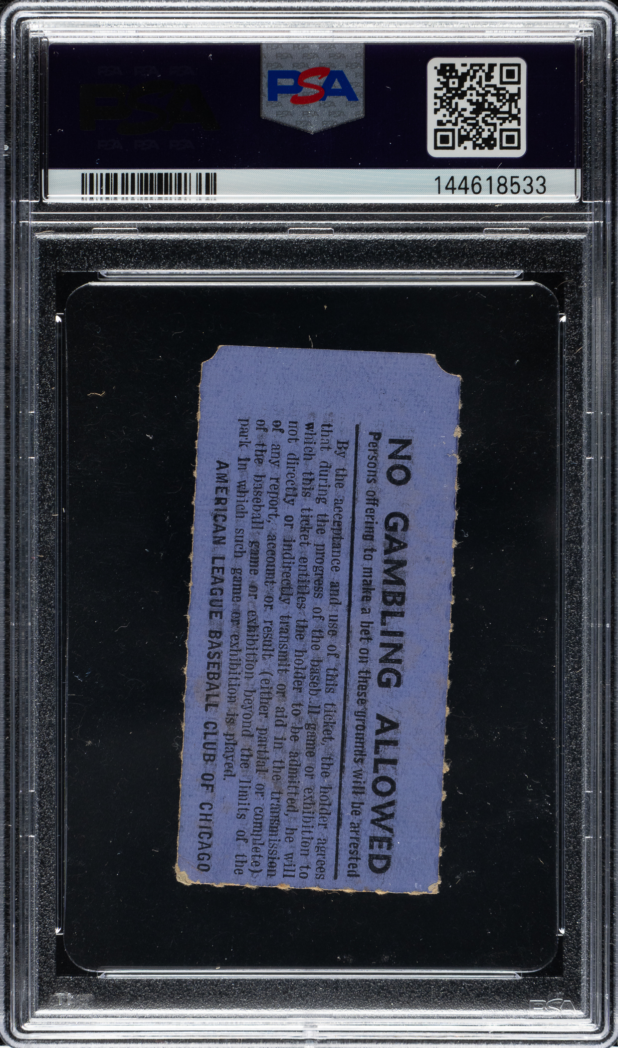 Graded VG-EX 4 by PSA. Ticket stub (1.25 x 2.75 inches) issued for a doubleheader between the Chicago White Sox and New York Yankees on July 13, 1941, at Comiskey Park. The Yankees swept the doubleheader 8-1 and 1-0. Joe DiMaggio collected three hits in the first game and one in the second, marking the 52nd and 53rd games of his record 56-game hitting streak.
