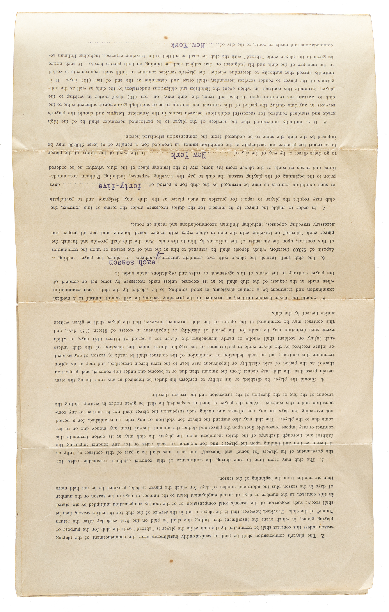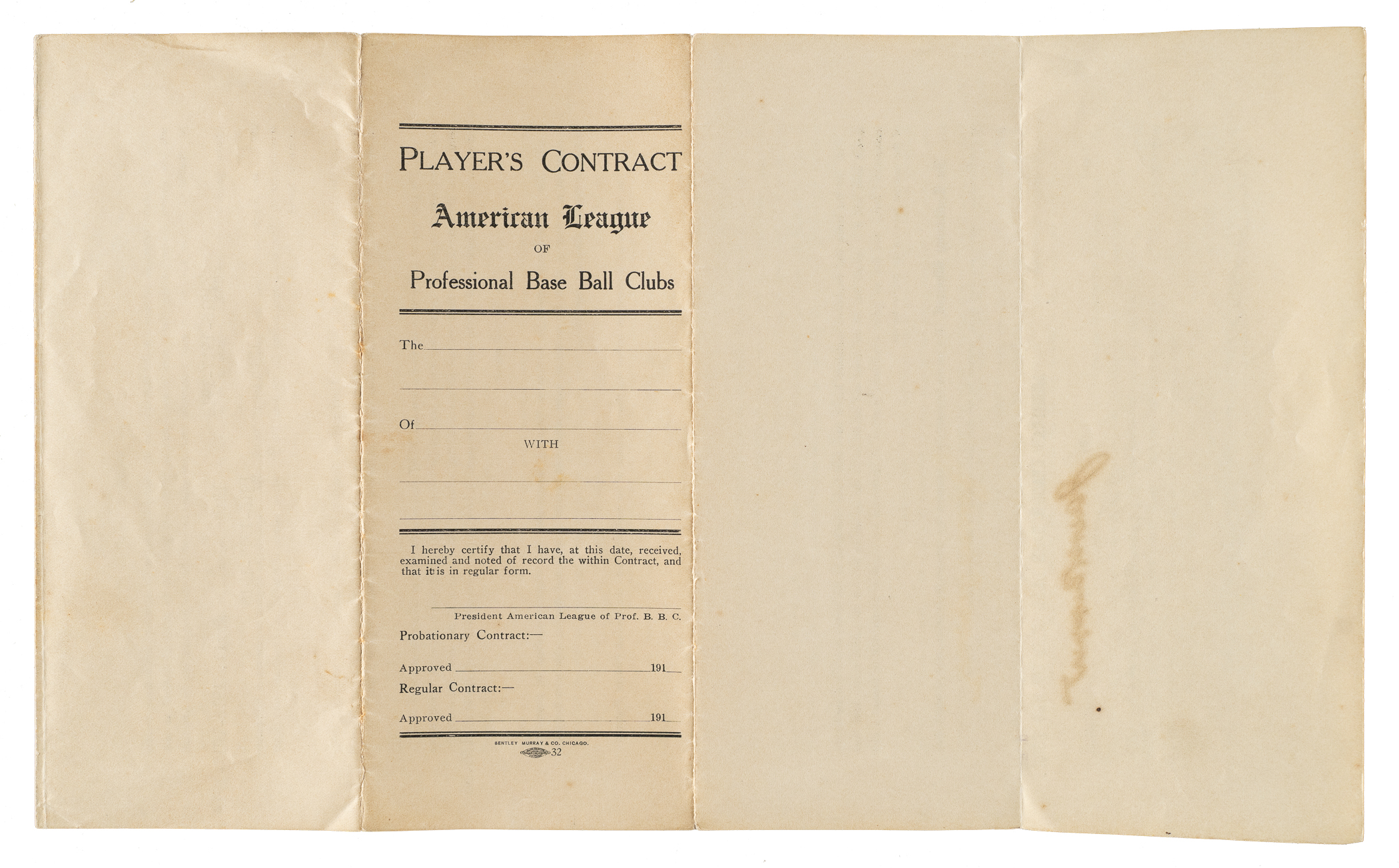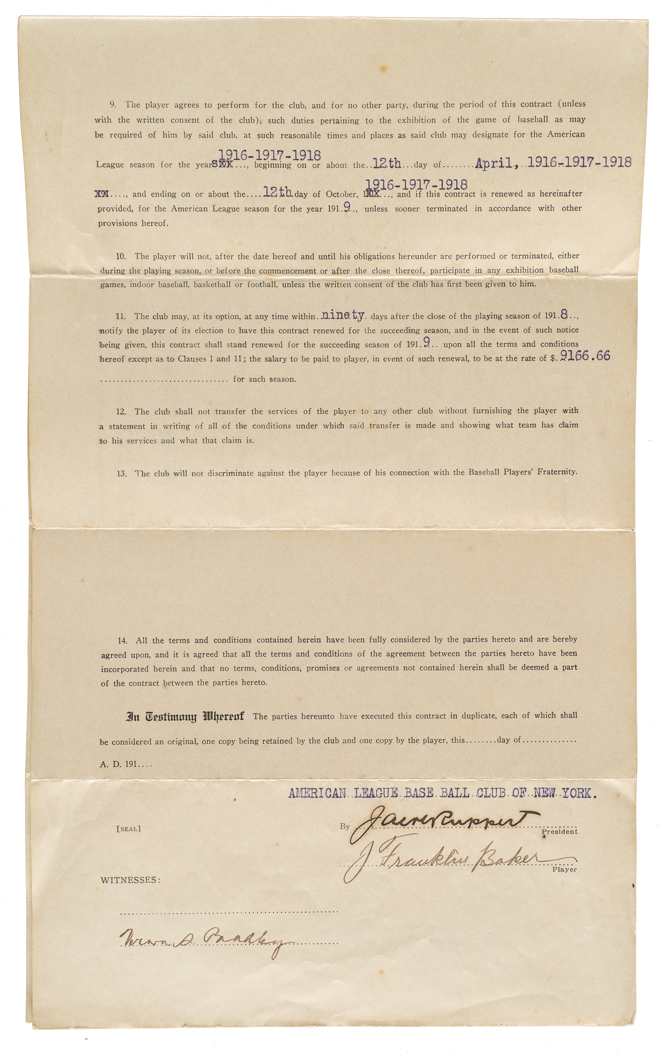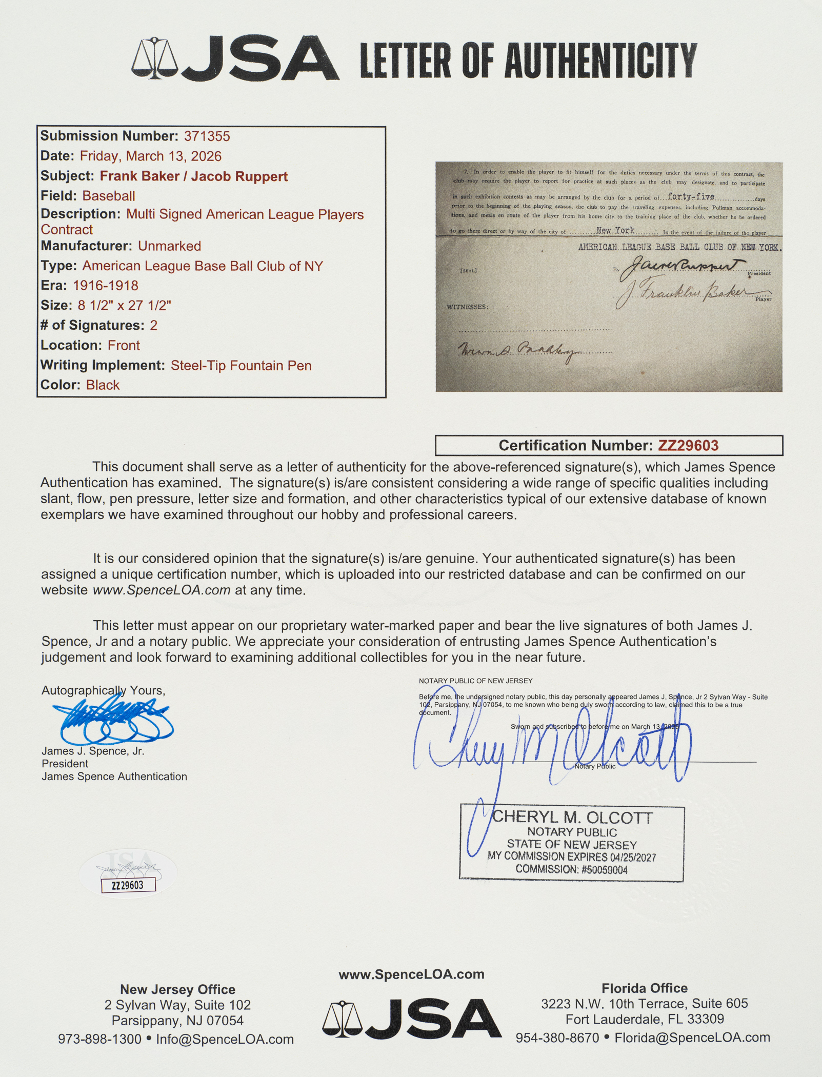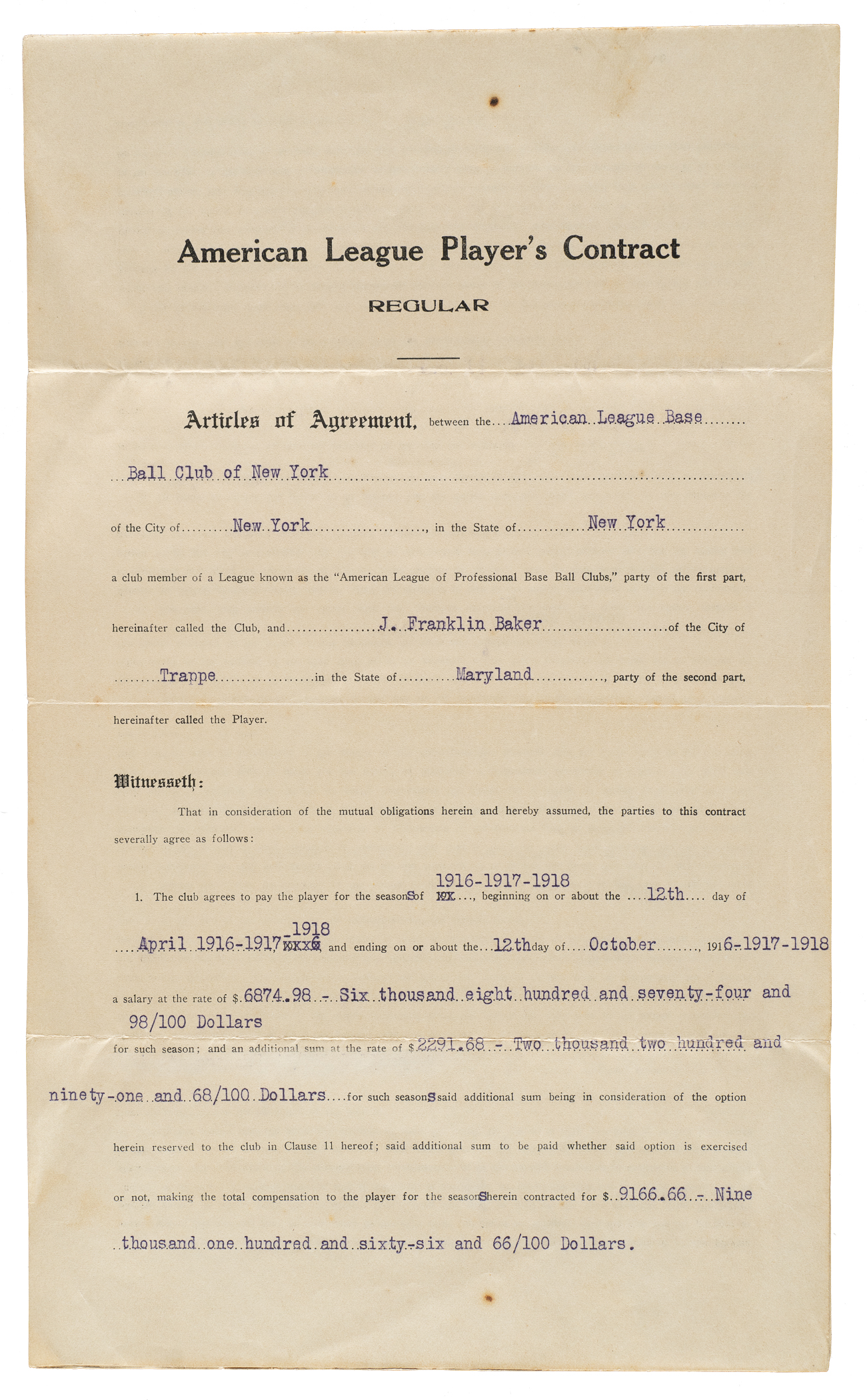 Four-page fold-over contract, undated, between Frank Baker and the American League Base Ball Club of New York, signed in black fountain pen by "J. Franklin Baker" and "Jacob Ruppert." Also signed in black ink by a witness. It is extremely rare to find such an early player contract for any Hall of Famer, let alone one of the stature of Frank "Home Run" Baker. The three-year agreement for the 1916-1918 season calls for Baker to receive a salary of $9,166 for each season. Baker, who was the most prominent member of Connie Mack's fabled "$100,000 infield," earned his famous nickname, "Home Run Baker," in the 1911 World Series by virtue of his game-winning home runs in Games 2 and 3. 1911 also marked the first of four consecutive seasons in which he led the American League in home runs. He retired with the Yankees in 1922, finishing his career with a .307 lifetime average, 96 home runs, and 987 RBI (lofty totals during baseball's dead-ball era). He was elected to the Hall of Fame in 1955. Contracts of Hall of Fame players are rare and the offered example is no exception. This is just the third Frank Baker contract we have ever handled. The contract (8.5 x 14 inches) displays three horizontal folds, along the lines of which are a couple tiny tears, light creases, and a couple spots of discoloration. In Very Good condition overall. Full LOA from James Spence/JSA.