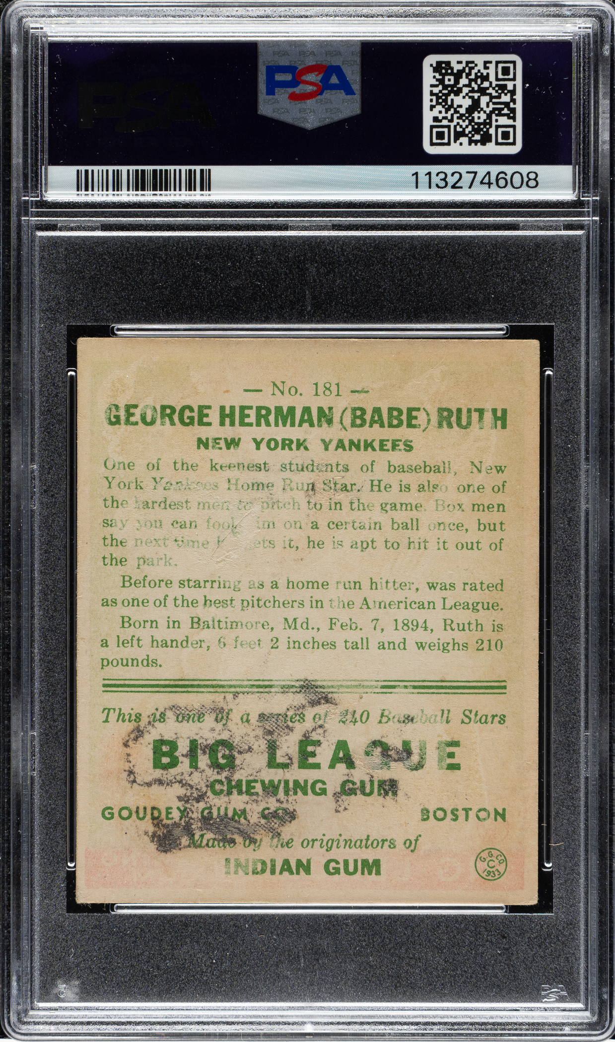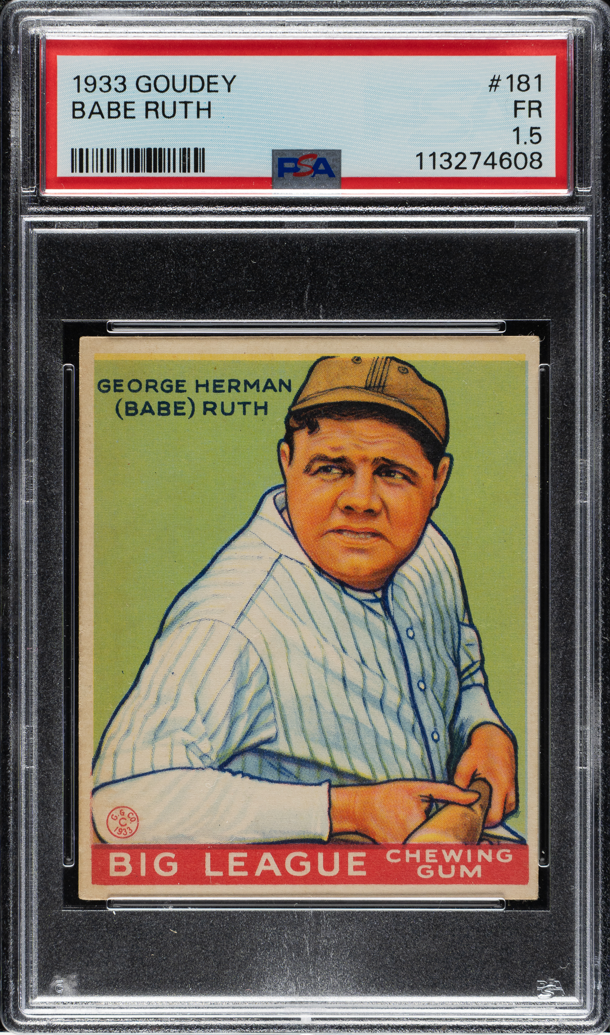 Graded FAIR 1.5 by PSA. Modestly graded example of one of New York Yankees Hall of Famer Babe Ruth's classic cards: #181 Ruth, green background, from the 1933 Goudey series. This example has a brilliant green background, outstanding registration, and light corner wear. Downgraded due to evidence of album removal on the reverse. This card is ideal for the collector who wants a very attractive example of the 1933 Goudey #181 Ruth card but is not interested in spending the many thousands (or even tens of thousands) of additional dollars an example in a significantly higher grade would require.