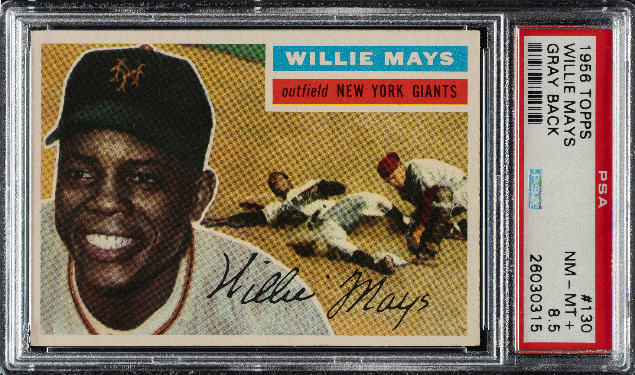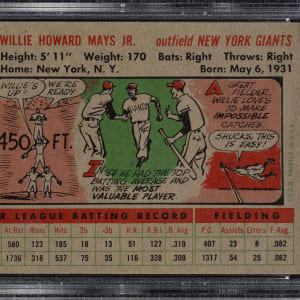 Graded NM-MT+ 8.5 by PSA. Striking example of New York Giants Hall of Famer Willie Mays from the classic 1956 Topps set. This card displays vibrant colors, excellent registration, and four strong corners. The gray back is boldly printed and entirely clean. 1956 Topps cards typically suffer from a variety of condition problems, including print defects and a tendency to have soft corners, which make high-grade examples particularly difficult to find. Extraordinary high-grade example worthy of the finest Willie Mays or Hall of Famer card collection.