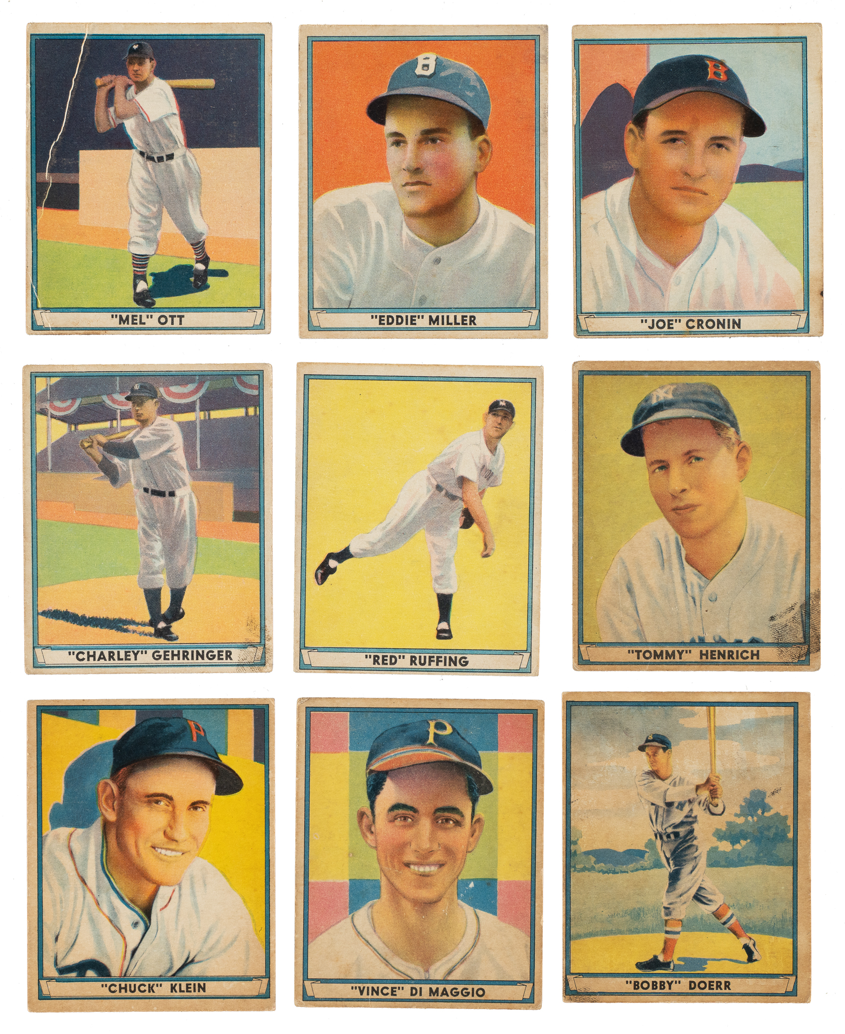 Very attractive partial set of the 1941 Play Ball series issued by Gum, Inc., consisting of 48 different cards (out of 72 in the set). The 1941 Play Ball set is one of card collecting's all-time classic gum issues. Condition is 23% Vg-Ex to Ex (mostly Vg-Ex), 52% Gd to Vg, and 25% lesser (including a few that measure a bit small). Keys: #1 Miller (Vg), 8 Ott (Fr), 13 Foxx (Vg+), 15 Cronin (10/90 L/R and B/T, otherwise Vg), 18 Greenberg (measures small, otherwise Vg+), 19 Gehringer (Fr due to soiling at bottom-right corner), 20 Ruffing (Vg-Ex), 39 Henrich (Pr), 54 Reese RC (Vg), 60 Klein (Ex), 61 V. DiMaggio (Gd+), 64 Doerr (Gd), and 72 Gomez (Vg). Missing the following twenty-four cards for completion: #6 Hubbell, 10 Vaughan, 12, 14 Williams, 24, 26, 27, 34, 35, 37, 38, 40, 41, 43, 48, 49, 52, 55, 62, 63 D. DiMaggio, 65, 66, 70 Dickey, and 71 J. DiMaggio. An attractive set such as this, which spans several grades, often represents a particularly outstanding collecting value. This is a very attractive set that we think any collector would find extremely appealing, while at the same time being a far more affordable alternative to a higher-grade set of this very popular prewar gum issue. Total: 48 cards.