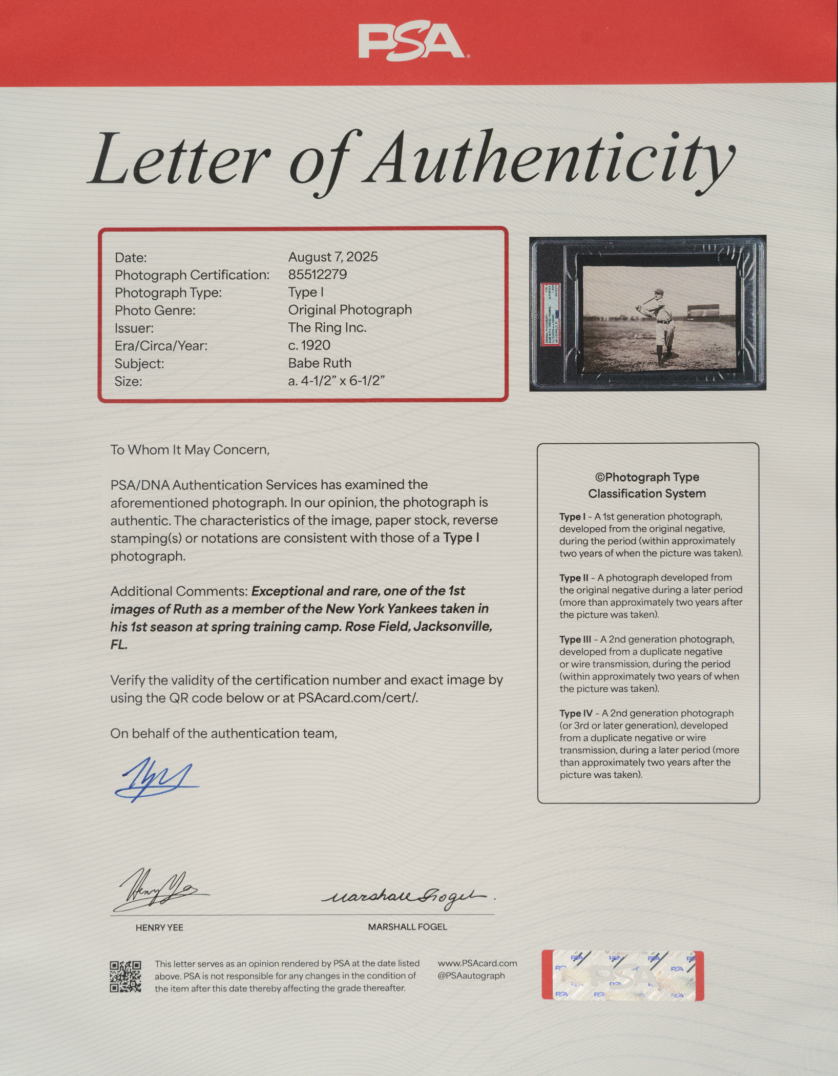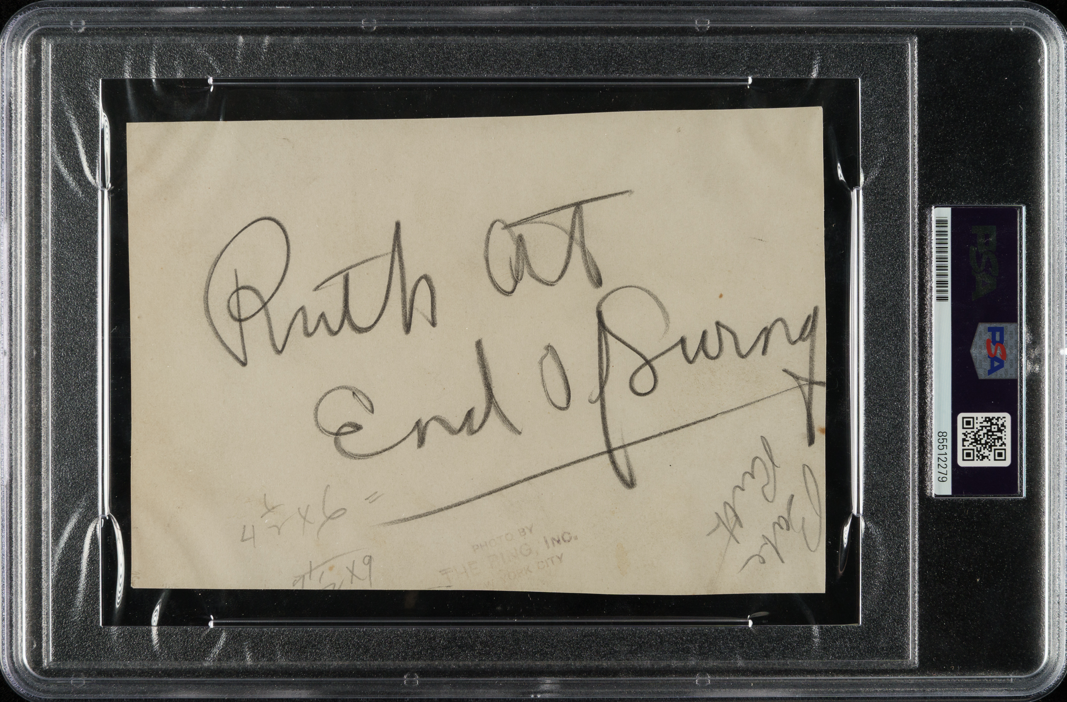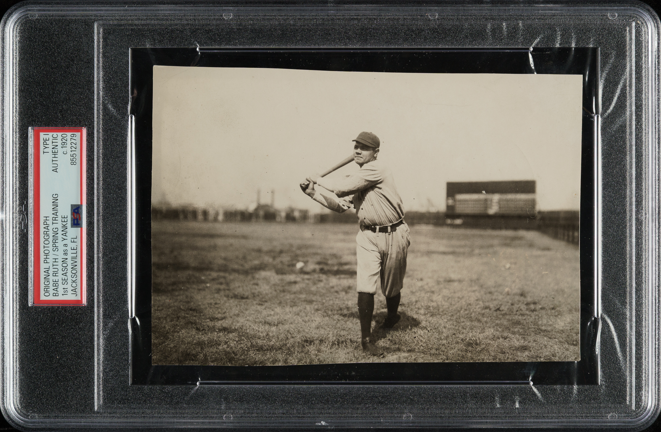 Exceptional original photo of Babe Ruth as a member of the New York Yankees during spring training in Jacksonville, Florida, circa 1920. Encapsulated and certified as an original Type I photograph by PSA/DNA. This remarkable image is one of only a handful of confirmed examples featuring Ruth during his first spring training with the Yankees. Ruth is captured in full uniform in a swing-through pose, with the Rose Field scoreboard visible in the background. The handwritten pencil inscription "Ruth at End of Swing" appears on the reverse, as do a few other editorial notations and a "The Ring Inc." credit stamp. The photo (4.5 x 6.5 inches) displays exceptional clarity and remains in Excellent condition overall. Full LOA from PSA/DNA.