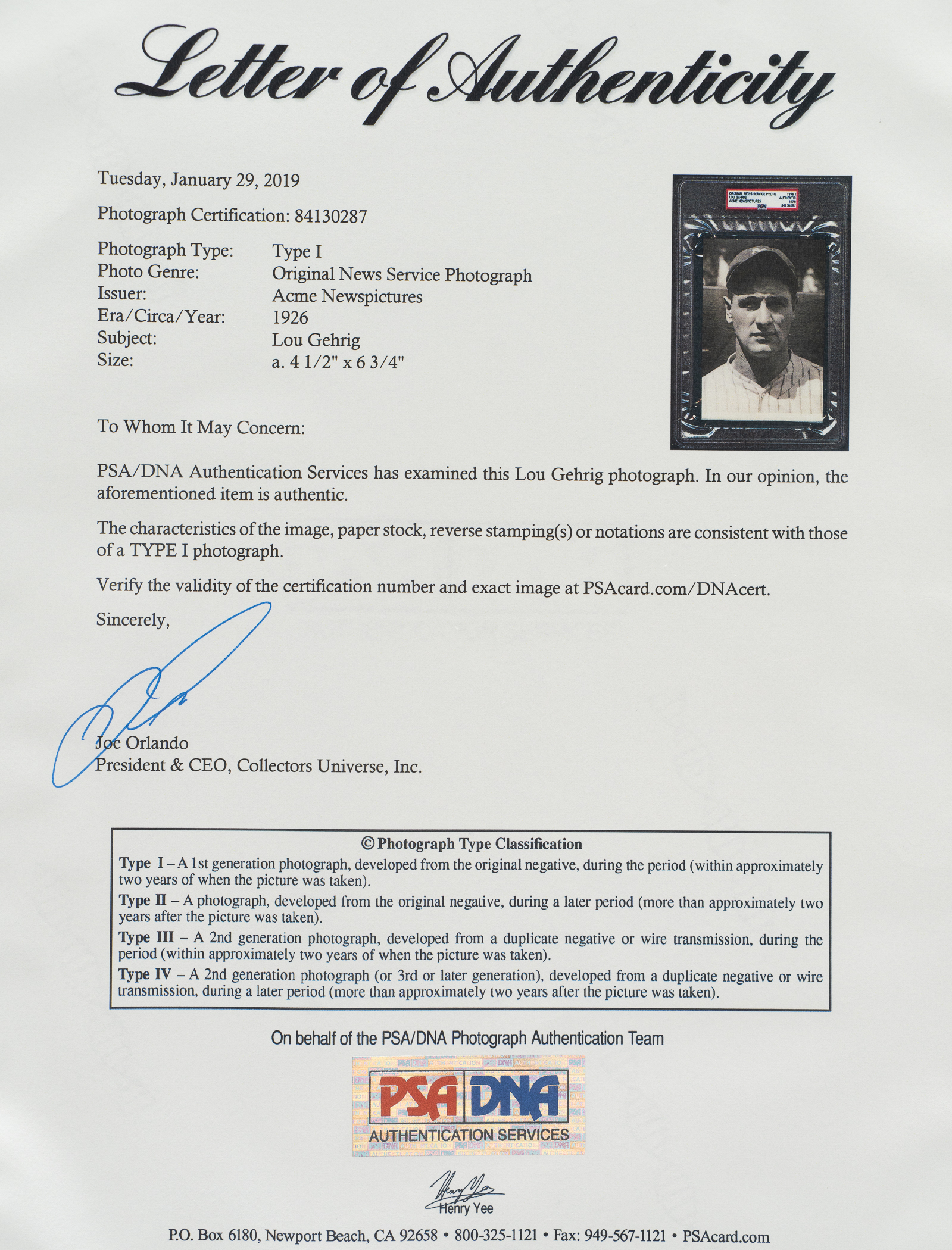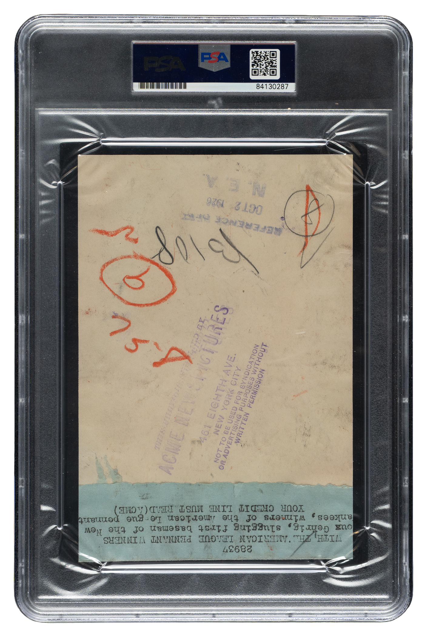 Original news photo of Hall of Fame first baseman Lou Gehrig in 1926. Encapsulated and certified as an original Type I photo by PSA/DNA. The portrait shot captures Gehrig in full uniform, gazing into the camera. An "ACME Newspicture" credit stamp appears along the reverse, along with the original paper news caption and a "N.E.A. Reference Dept." stamp dated "Oct 2 1926." The photo (4.5 x 6.75 inches) displays a diagonal crease running through Gehrig's face. Good condition overall. Full LOA from PSA/DNA.