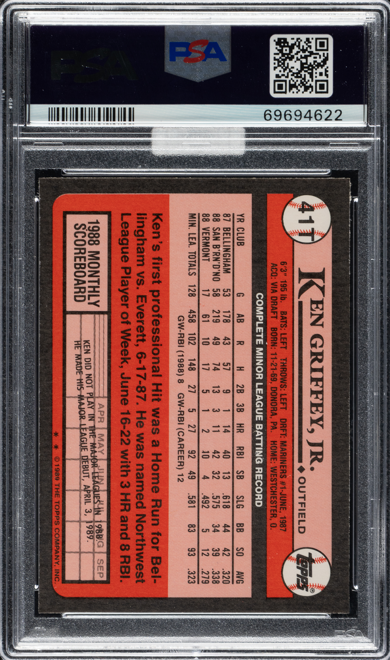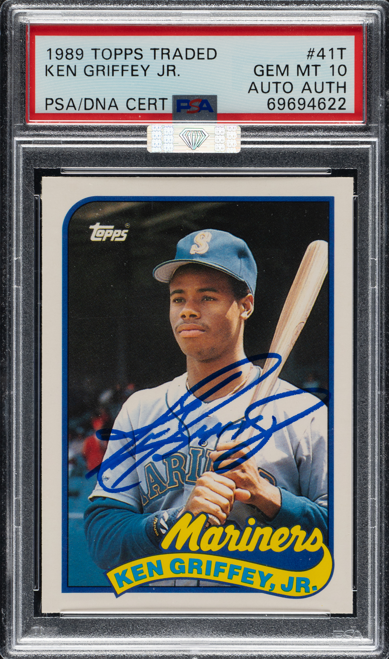 PSA/DNA has encapsulated the card, grading the card GEM MINT 10 and certifying the signature as "Authentic." Seattle Mariners Hall of Famer Ken Griffey Jr. Awarded an MBA Silver Diamond by Mike Baker Authenticated for high-end eye appeal. A corresponding MBA sticker is affixed to the front of the holder.