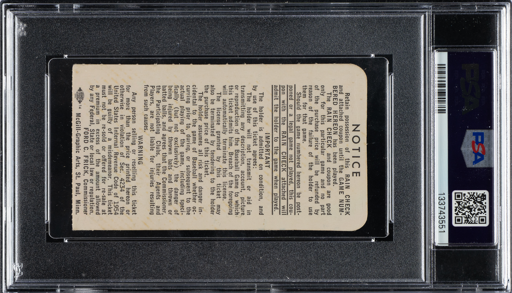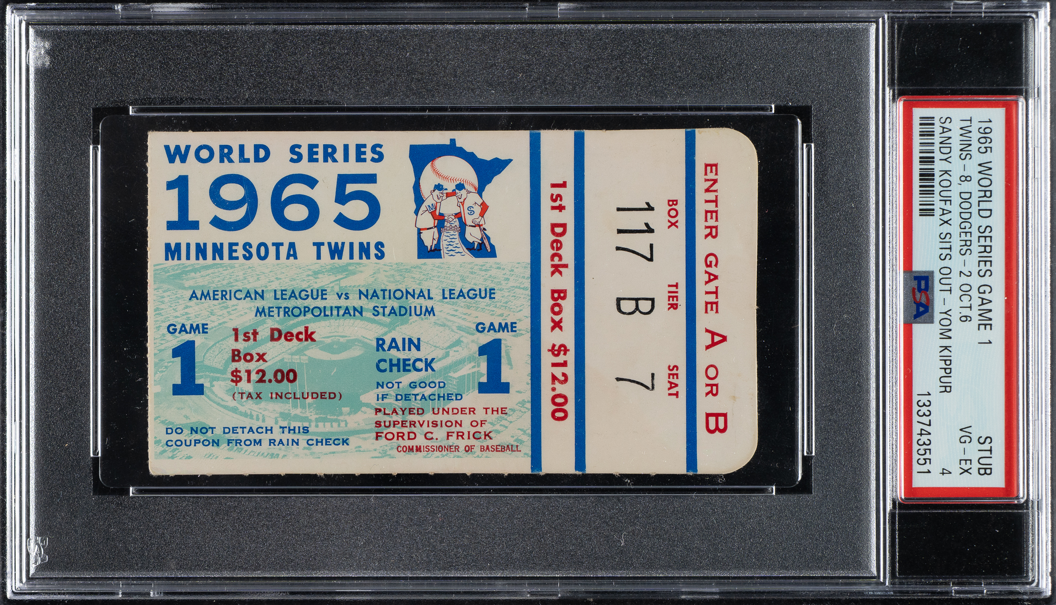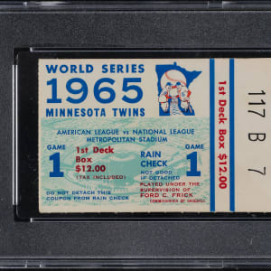 Graded VG-EX 4 by PSA. Ticket stub (4 x 2.25 inches) issued for Game 1 of the 1965 World Series held between the Los Angeles Dodgers and the Minnesota Twins at Dodger Stadium in Los Angeles on October 6th. Game 1 is best remembered for who didn't play, Sandy Koufax, who sat out for Yom Kippur as his Dodgers fell to 8-2 to the Twins. Upon returning in Game 2, Koufax dominated the rest of the World Series in historic fashion. He threw three complete games, posted a microscopic .38 ERA across 24 innings with 29 strikeouts, and closed it out with a two-hit shutout in Game 7 to earn World Series MVP honors.