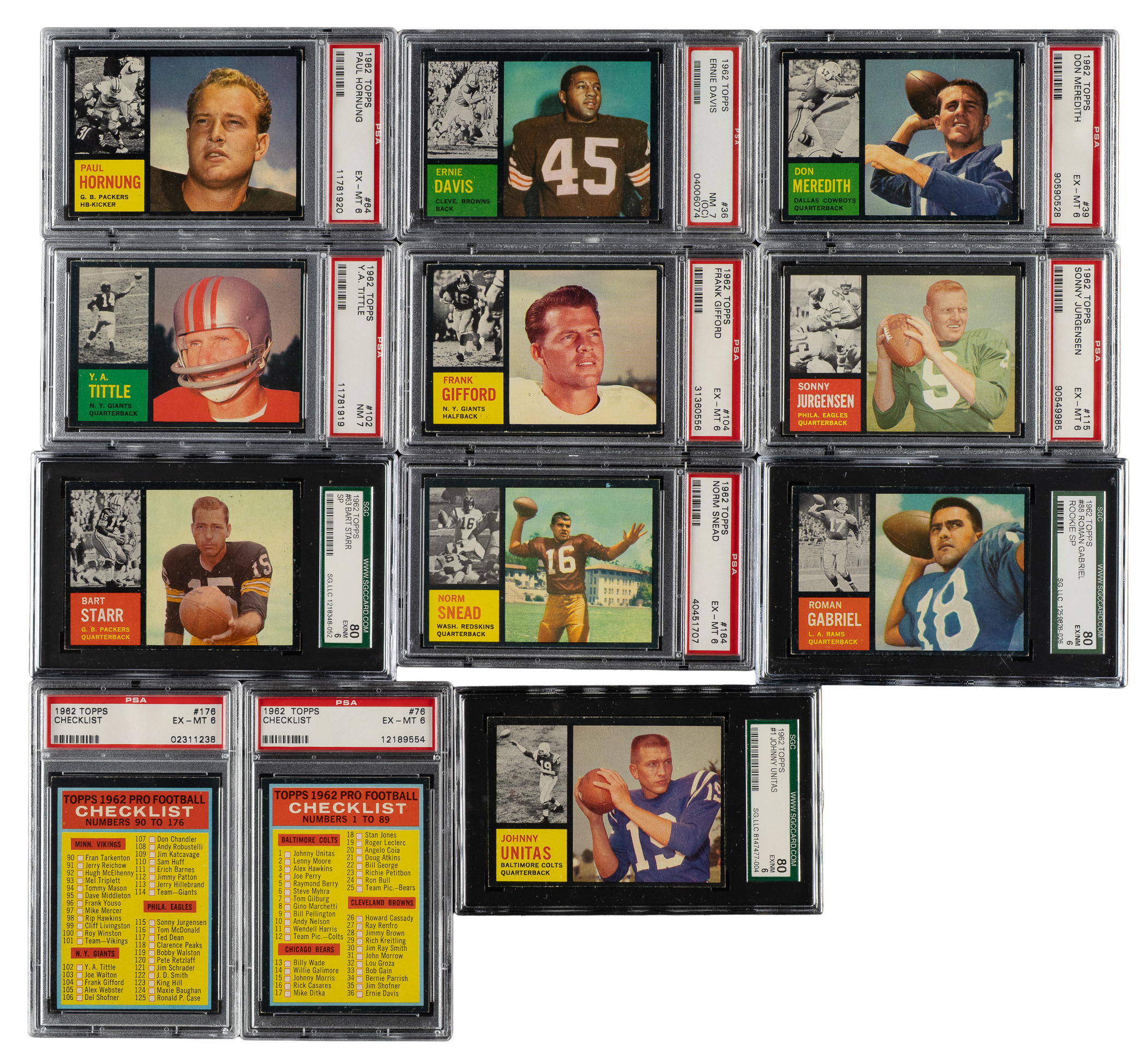 Presented is a very attractive mid- to high-grade complete set of 1962 Topps football cards, each professionally graded and encapsulated by PSA (160), SGC (15), and BVG (1). The black border design of the 1962 Topps football set makes this issue particularly challenging to collect in extremely high grade. This classic set features all the stars of the era, including rookie cards of Hall of Famers Mike Ditka and Fran Tarkenton, and stars such as Johnny Unitas, Jim Brown, Bart Starr, and Ernie Davis. PSA Grading Composite: NM-MT 8 (1 card): #22 (OC). NM+ 7.5 (1 card): #33 (SGC 86). NM 7 (13 cards): #24, 27, #36 Davis RC (OC), 38, 71, 72, 74, 102 Tittle, 111, 116, 138 (ST), 167 (ST), and 174. EX-MT+ 6.5 (9 cards): #30, 42, 45, 57, 75, 86, 119, 145, and 154. EX-MT 6 (152 cards): Including#1 Unitas (SGC 80), 17 Ditka RC, 28 Brown, 39 Meredith, 63 Starr (SGC 80), 64 Hornung, 76 Checklist, 88 Gabriel RC (SGC 80), 90 Tarkenton RC, 104 Gifford, 115 Jurgensen, 126 (ST), 141 (ST), 164 Snead RC, and 176 Checklist. Very attractive complete early 1960s Topps football set, including many Hall of Famers and stars of the era. The equivalent SMR value for just 170 of the 176 graded cards (factoring in the 10 half grades at the lower whole-grade level and not including the six PSA-qualified cards) is $3,938. Total: 176 cards. The size/weight of this item requires that there will be an additional shipping charge for this lot.