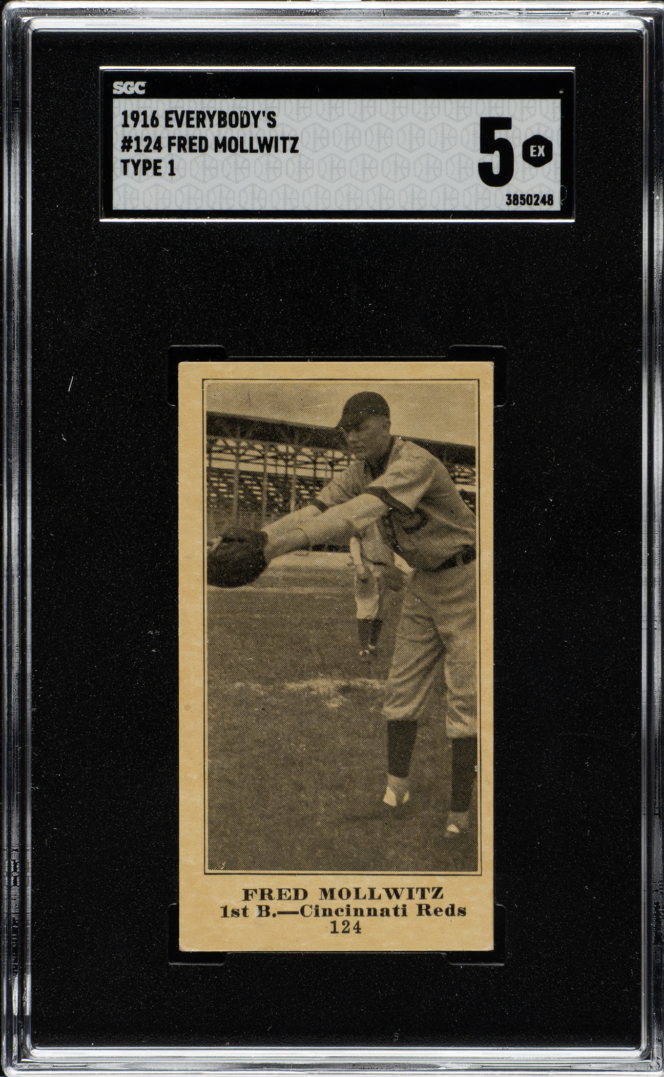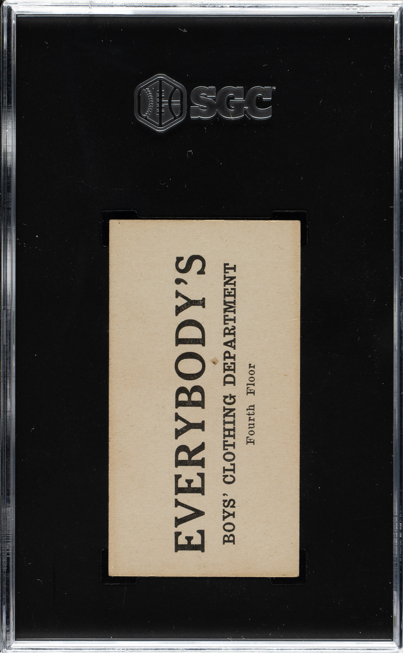 Graded EX 5 by SGC. One of only three examples graded at this level by SGC with none higher. Presented is a very attractive example of #124 Fred Mollwitz from the 1916 M101-4 set featuring an Everybody's Clothing Store advertising reverse. The Everybody's reverse is among the scarcest of the various advertisers found on M101-4 cards. The offered example displays a crisp image and light corner wear. The important advertising reverse is boldly printed and clean. This is an outstanding example of this rare advertising reverse, which would be an ideal addition to any M101-4 or type-card collection.
