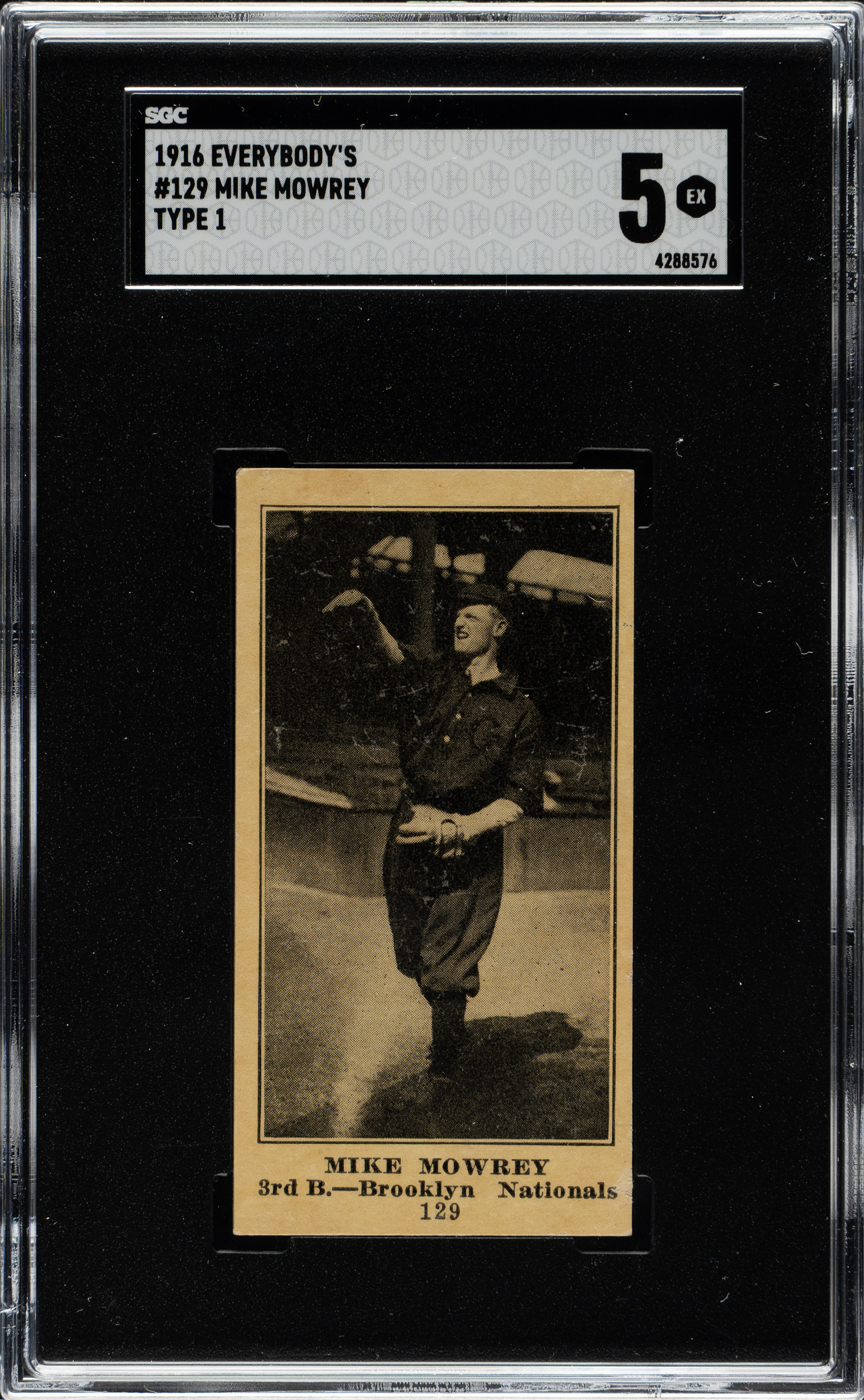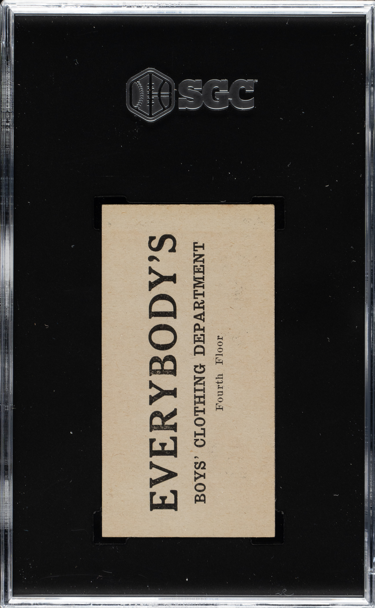 Graded EX 5 by SGC. One of only two examples graded at this level by SGC with none higher. Presented is a very attractive example of #129 Mike Mowrey from the 1916 M101-4 set featuring an Everybody's Clothing Store advertising reverse. The Everybody's reverse is among the scarcest of the various advertisers found on M101-4 cards. The offered example displays a crisp image and light corner wear. The important advertising reverse is boldly printed and clean. This is an outstanding example of this rare advertising reverse, which would be an ideal addition to any M101-4 or type-card collection.