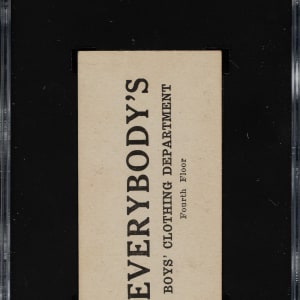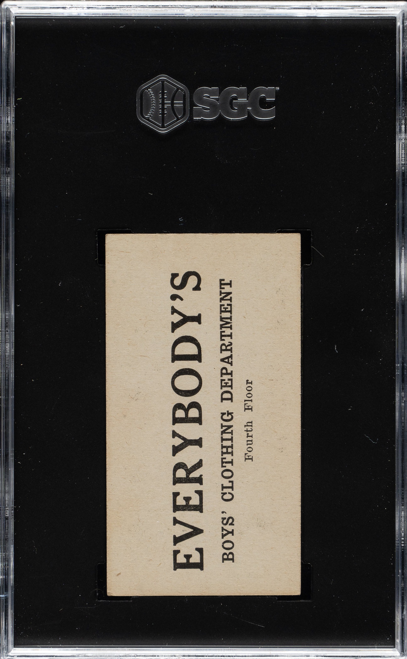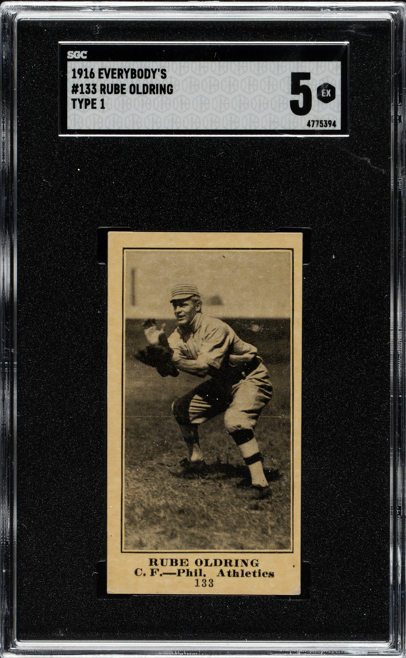 Graded EX 5 by SGC. One of only two examples graded at this level by SGC with just one higher. Presented is a very attractive example of #133 Rube Oldring from the 1916 M101-4 set featuring an Everybody's Clothing Store advertising reverse. The Everybody's reverse is among the scarcest of the various advertisers found on M101-4 cards. The offered example displays a crisp image and light corner wear (weaker bottom two). The important advertising reverse is boldly printed and clean. This is an outstanding example of this rare advertising reverse, which would be an ideal addition to any M101-4 or type-card collection.