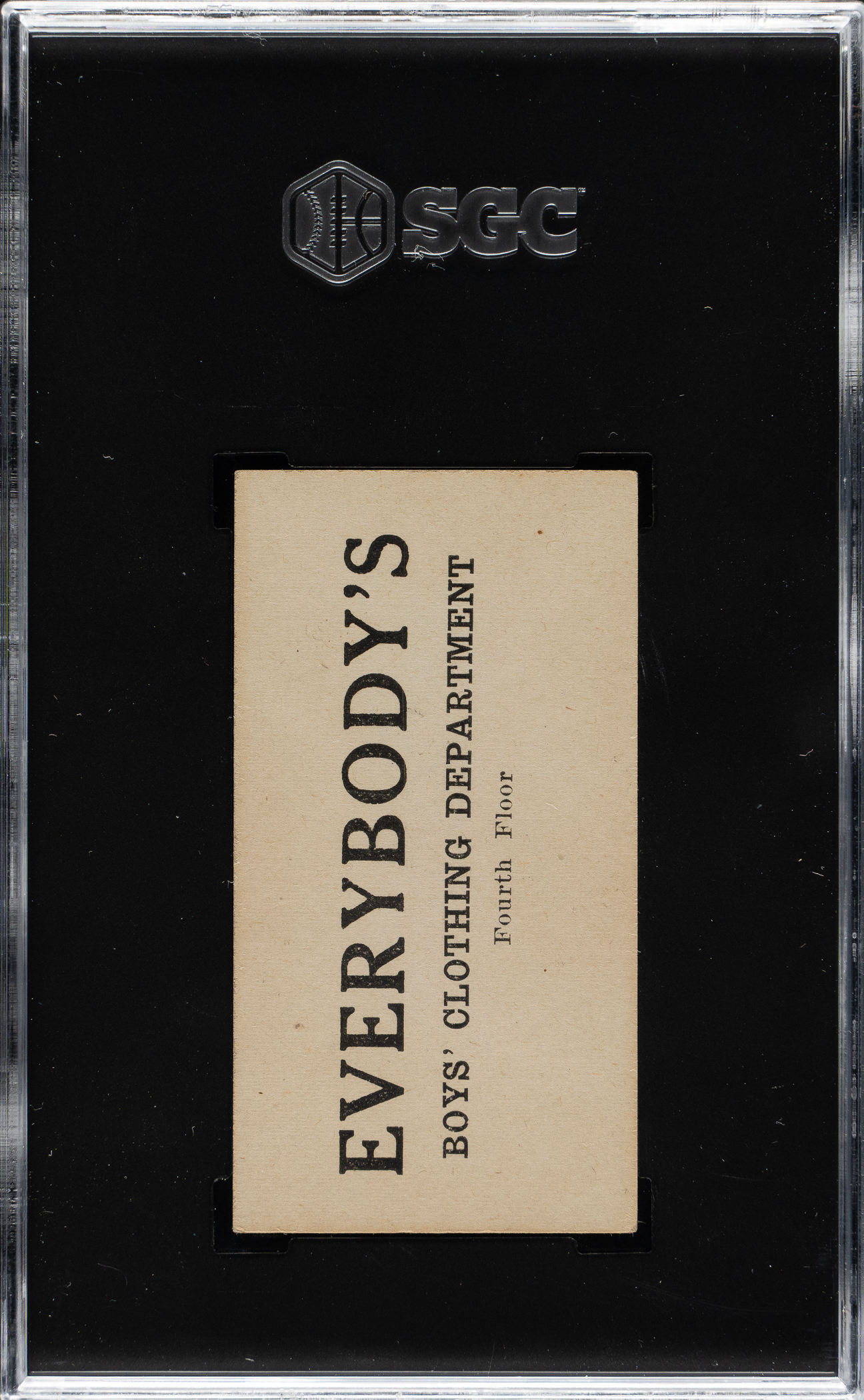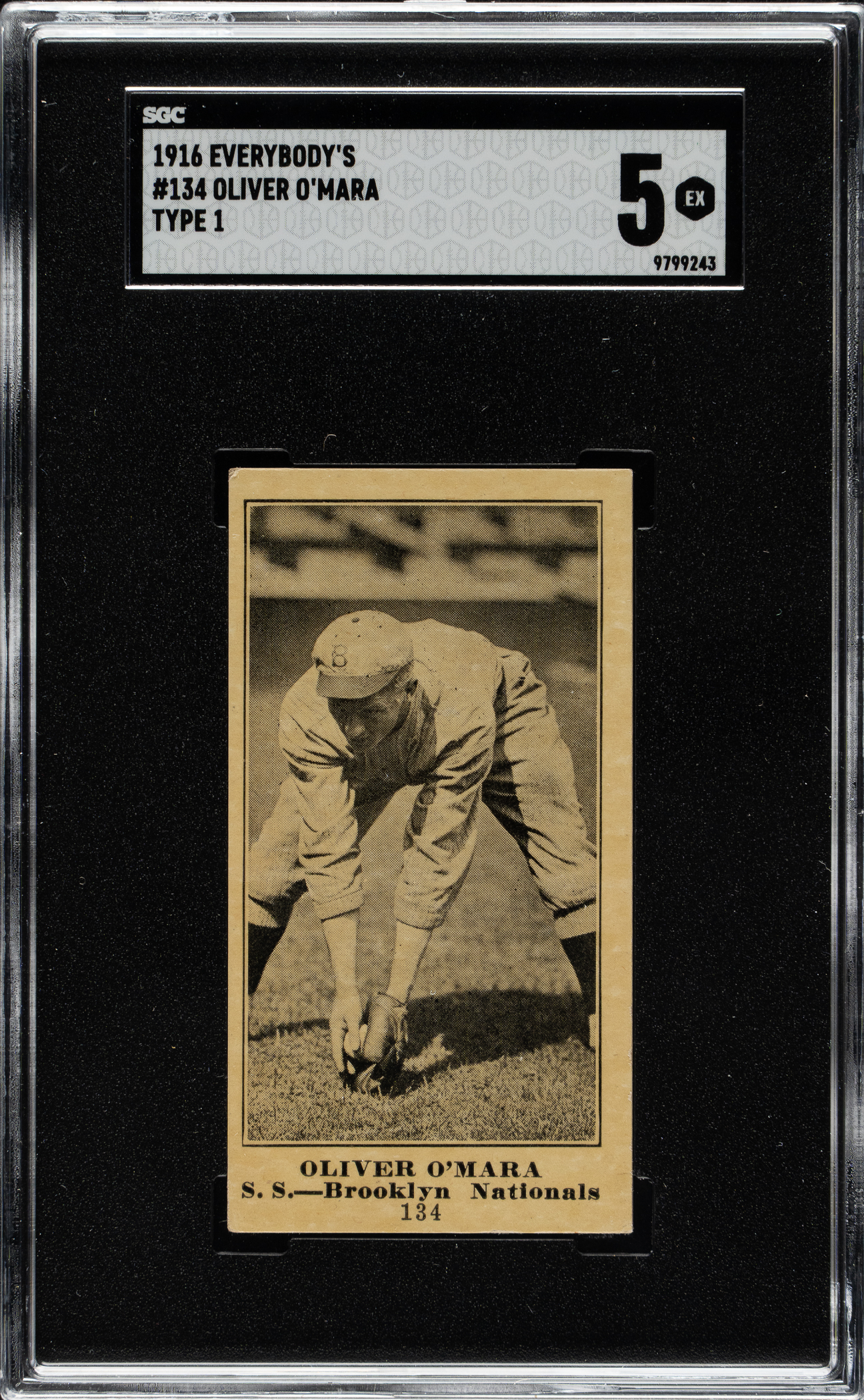 Graded EX 5 by SGC. One of only two examples graded at this level by SGC with just one higher. Presented is a very attractive example of #134 Oliver O'Mara from the 1916 M101-4 set featuring an Everybody's Clothing Store advertising reverse. The Everybody's reverse is among the scarcest of the various advertisers found on M101-4 cards. The offered example displays a crisp image and light corner wear. The important advertising reverse is boldly printed and clean. This is an outstanding example of this rare advertising reverse, which would be an ideal addition to any M101-4 or type-card collection.