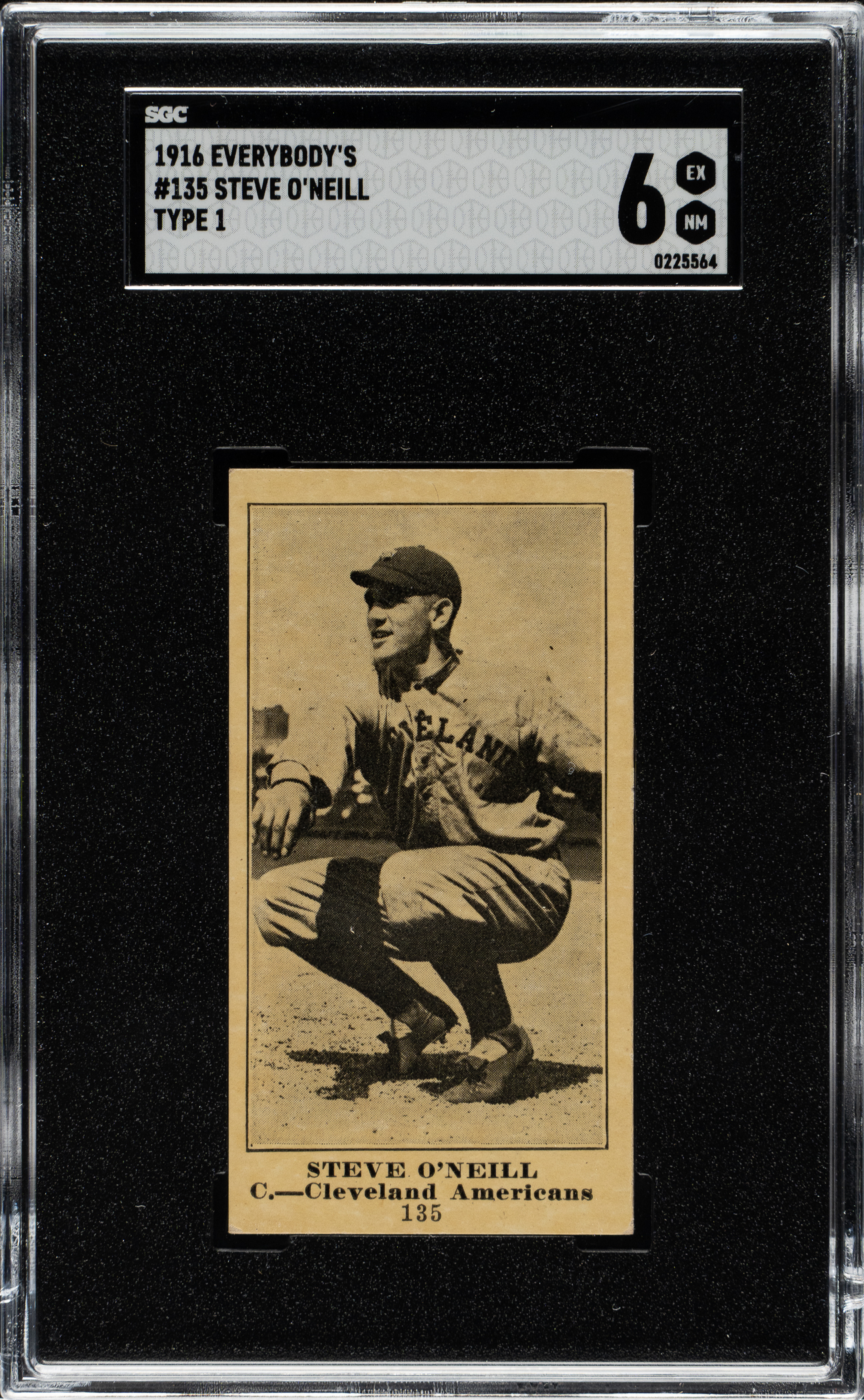 Graded EX/NM 6 by SGC. This is the ONLY example graded at this level by SGC with none higher! Presented is a beautiful example of #135 Steve O'Neill from the 1916 M101-4 set featuring an Everybody's Clothing Store advertising reverse. The Everybody's reverse is among the scarcest of the various advertisers found on M101-4 cards. The offered example displays a crisp image and strong corners. The important advertising reverse is boldly printed and clean. This is an outstanding example of this rare advertising reverse, which would be an ideal addition to any M101-4 or type-card collection.