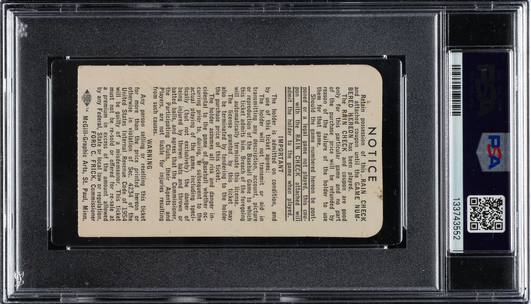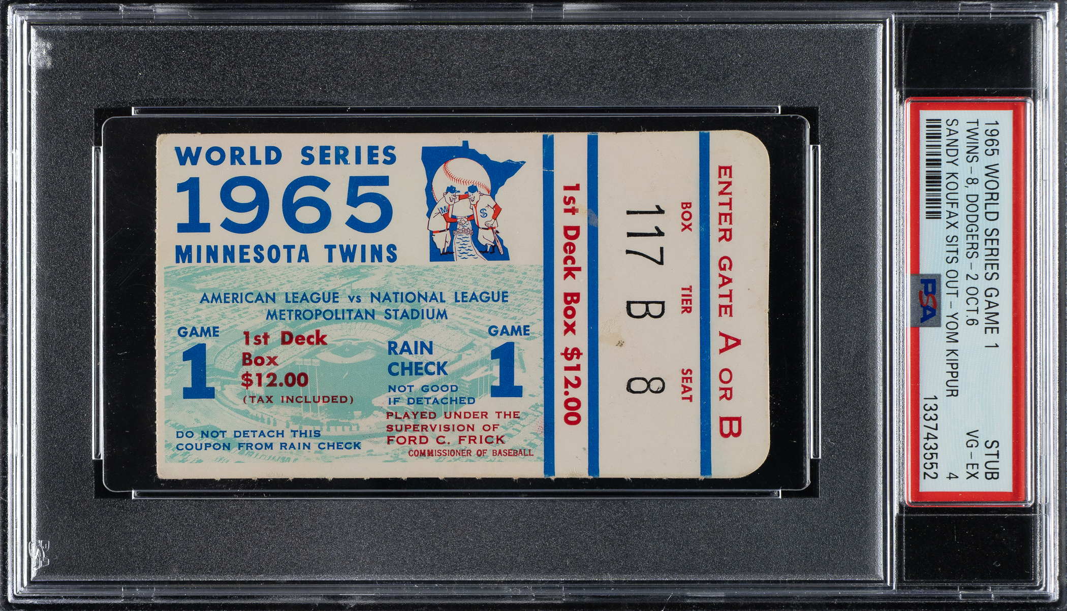 Graded VG-EX 4 by PSA. Ticket stub (4 x 2.25 inches) issued for Game 1 of the 1965 World Series held between the Los Angeles Dodgers and the Minnesota Twins at Dodger Stadium in Los Angeles on October 6th. Game 1 is best remembered for who didn't play, Sandy Koufax, who sat out for Yom Kippur as his Dodgers fell to 8-2 to the Twins. Upon returning in Game 2, Koufax dominated the rest of the World Series in historic fashion. He threw three complete games, posted a microscopic .38 ERA across 24 innings with 29 strikeouts, and closed it out with a two-hit shutout in Game 7 to earn World Series MVP honors.