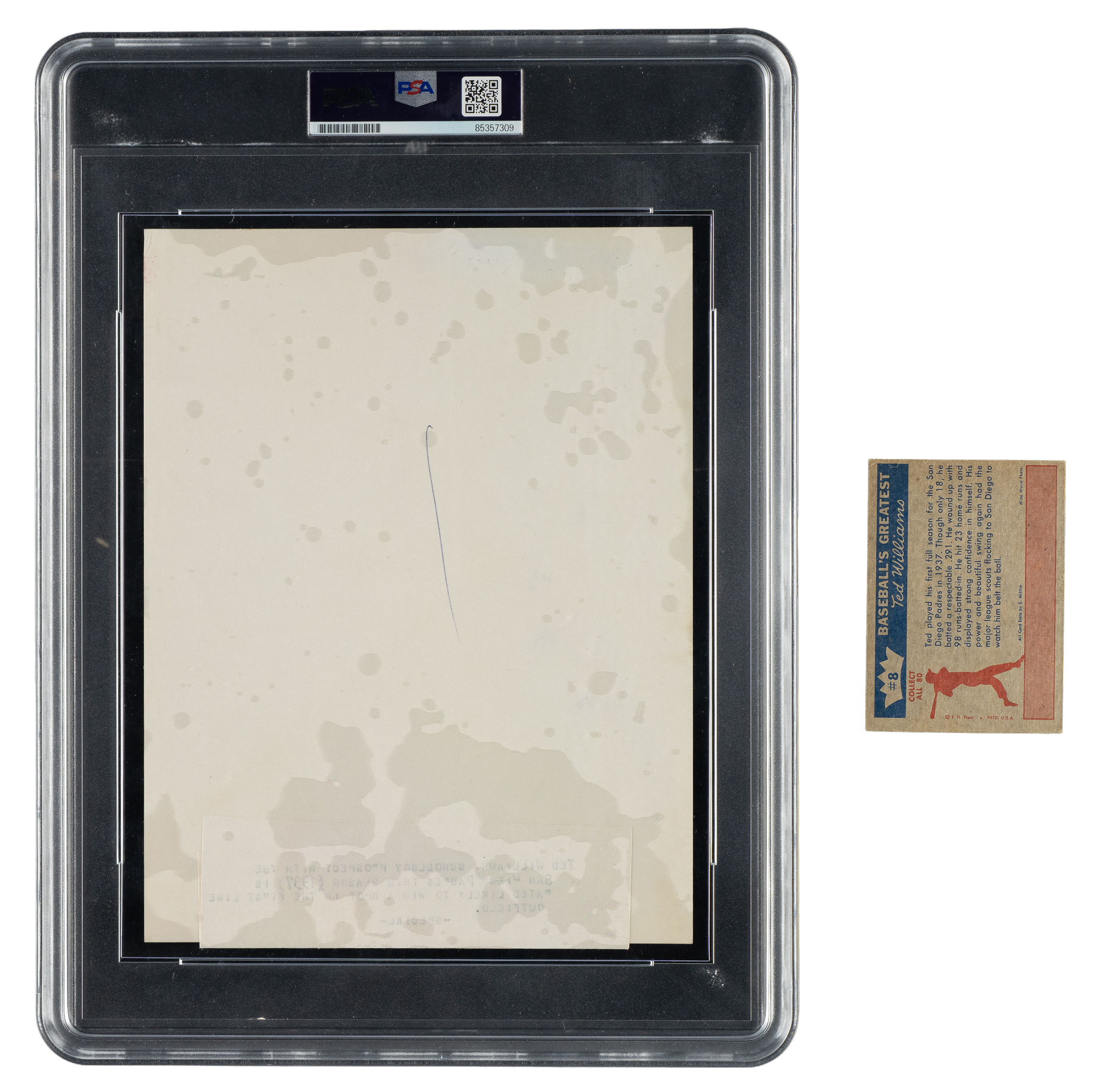 Vintage photo of Ted Williams as a member of the San Diego Padres (Pacific Coast League), used in the production of Williams' 1959 Fleer card. Encapsulated and certified as an original Type III photograph by PSA/DNA. Per PSA/DNA, the "photo is a period example that was made from a duplicate negative featuring an image originally taken by the Associated Press." The reverse bears a paper news caption and a stray ink mark. The folded-over caption reads "Ted Williams, schoolboy prospect with the San Diego Padres this season (1937) is rated likely to win a spot in the first line outfield. -Special-." The photo (7 x 9-1/8 inches) is in Very Good to Excellent condition overall.