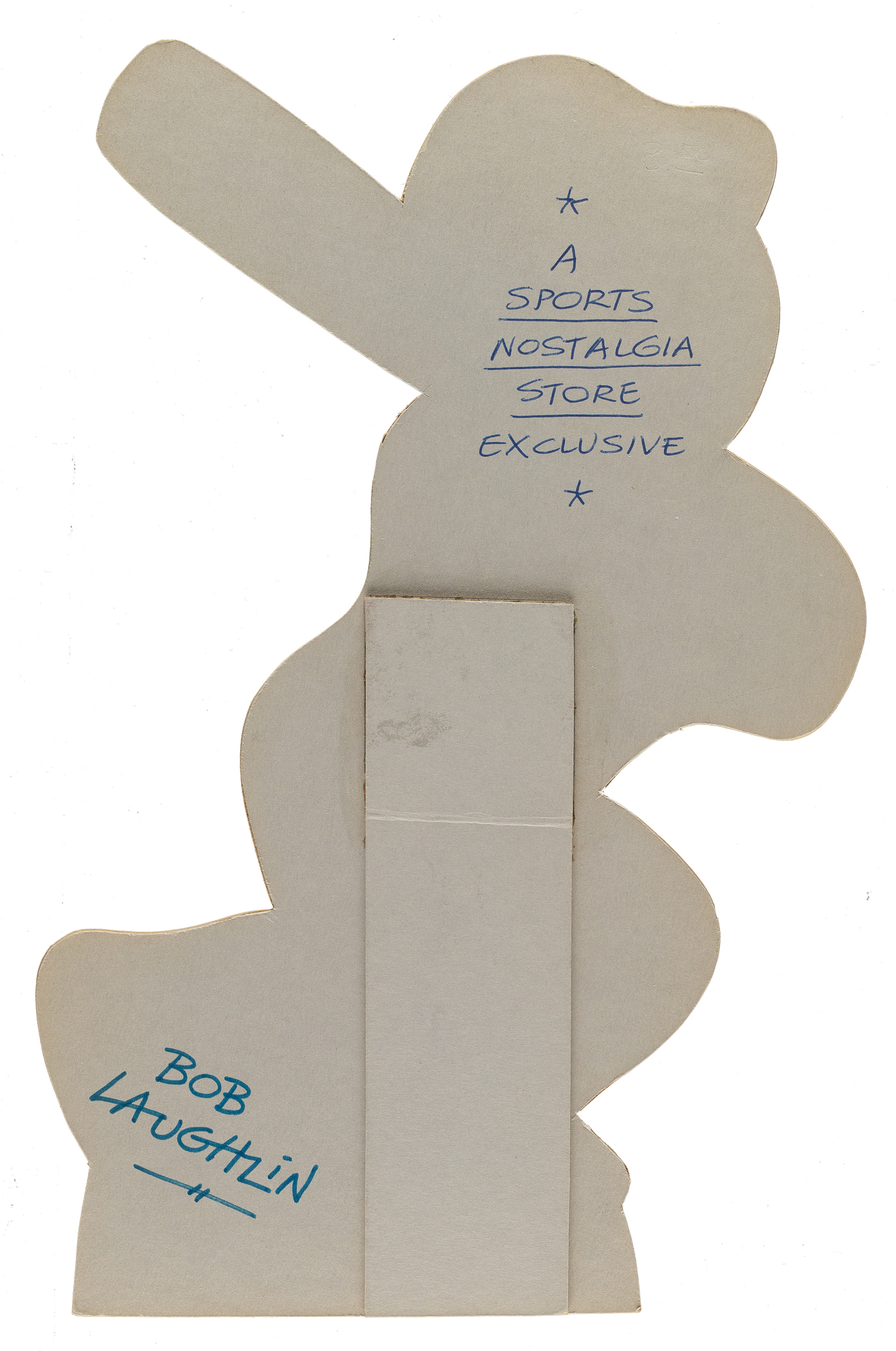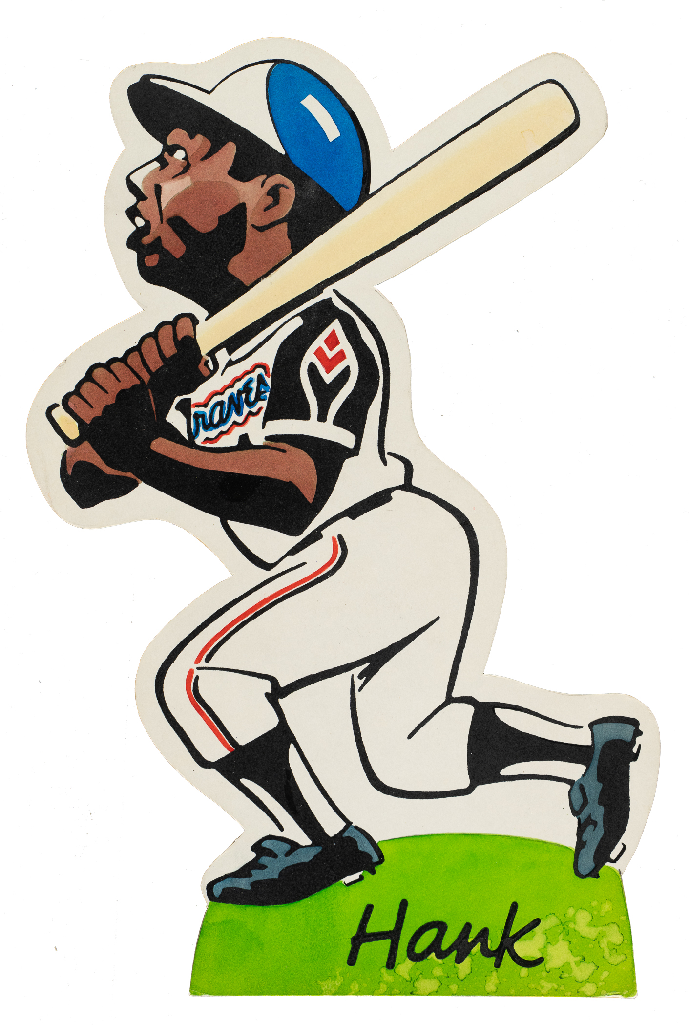 Atlanta Braves Hall of Famer Hank Aaron from the 1973 Laughlin "Super Stand-Ups" baseball series. This scarce series of player stand-ups was created by artist Bob Laughlin in the early 1970s. This unusual issue was designed with a star player's die-cut cartoon body attached to an easel back for one to display. When originally issued in the early 1970s they retailed for $3.50 each. Laughlin has signed the piece in blue ink on the reverse. In addition, a notation in blue ink on the reverse reads "A Sports Nostalgia Store Exclusive." The die-cut cardboard display (7 x 11 inches) is complete with its easel back. In Very Good to Excellent condition overall.