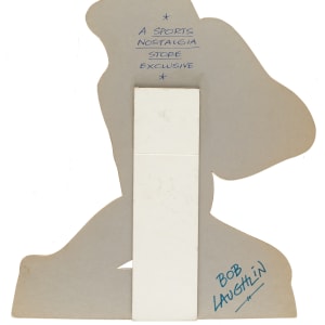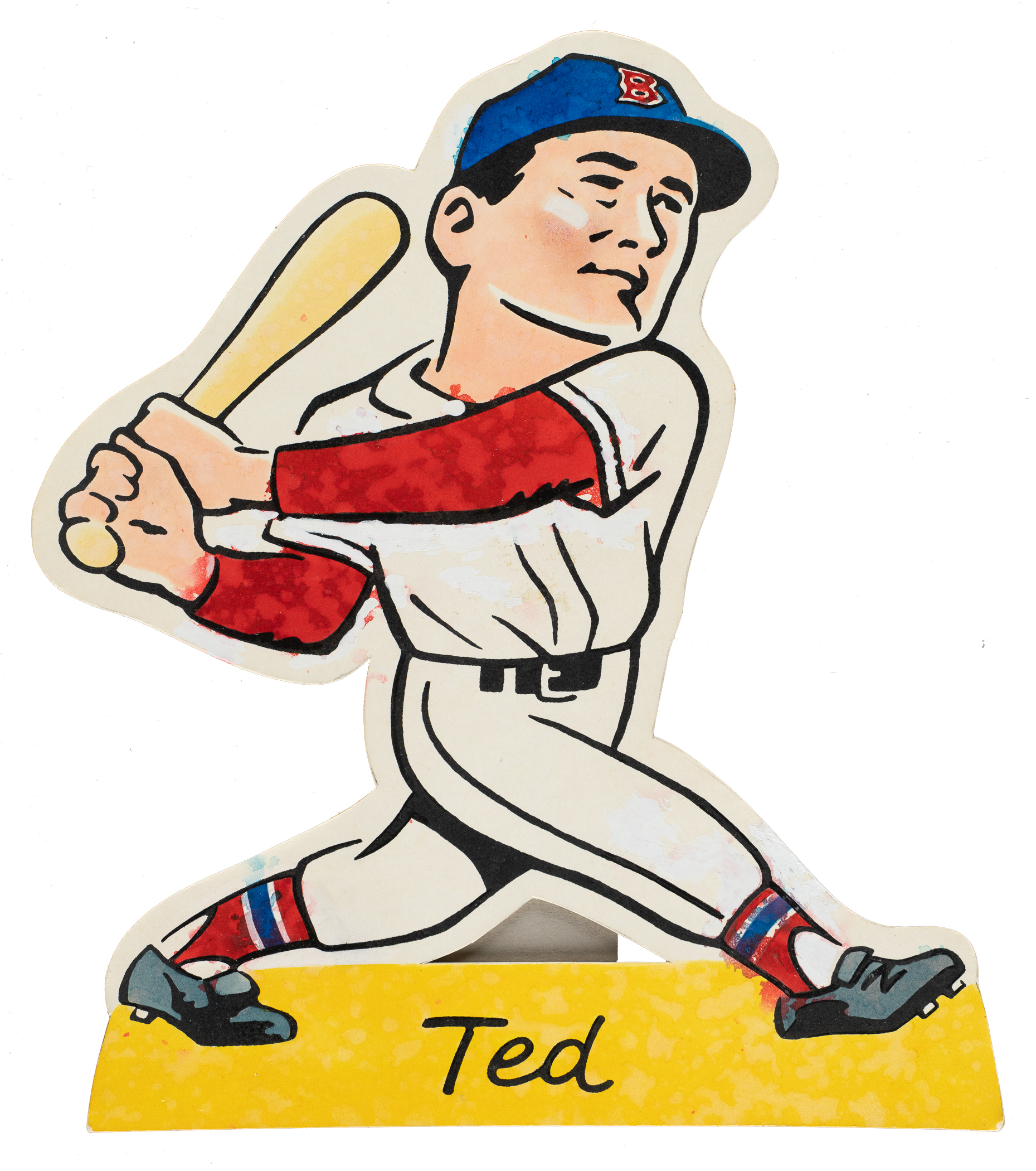 Boston Red Sox Hall of Famer Ted Williams from the 1973 Laughlin "Super Stand-Ups" baseball series. This scarce series of player stand-ups was created by artist Bob Laughlin in the early 1970s. This unusual issue was designed with a star player's die-cut cartoon body attached to an easel back for one to display. When originally issued in the early 1970s they retailed for $3.50 each. Laughlin has signed the piece in blue ink on the reverse. In addition, a notation in blue ink on the reverse reads "A Sports Nostalgia Store Exclusive." The die-cut cardboard display (8.25 x 10.5 inches) is complete with its easel back. In Very Good condition overall.