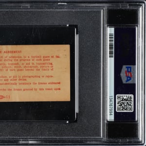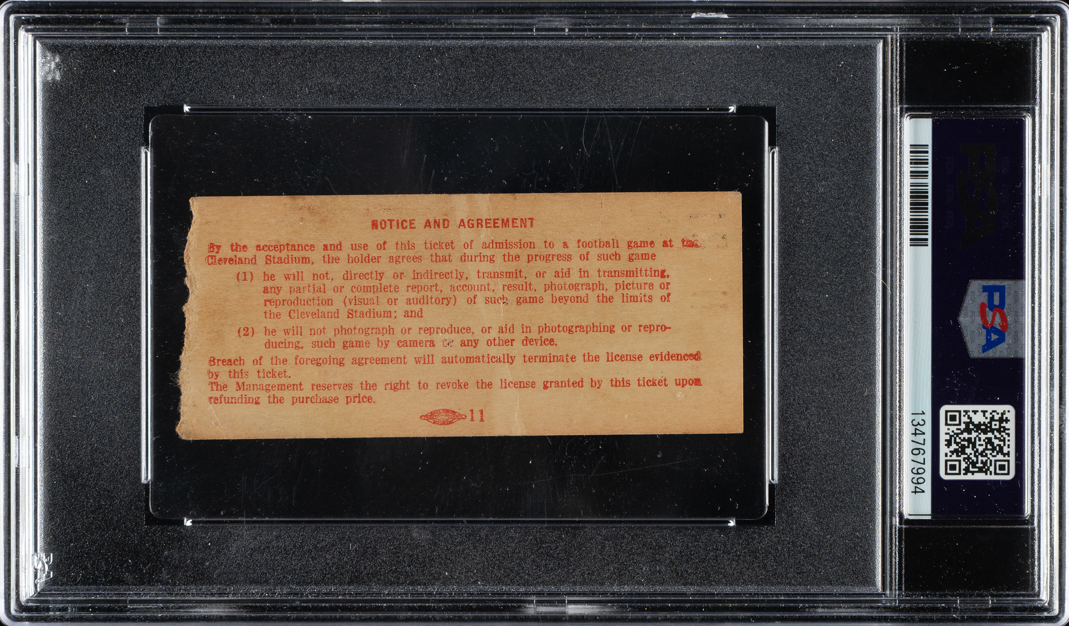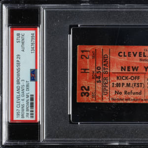 Rare ticket stub from Jim Brown's first National Football League game, the Cleveland Browns against the New York Giants at Cleveland Stadium on September 29, 1957. Jim Brown made his NFL debut at Cleveland Stadium in front of a season-opening crowd of 58,095. Brown rushed for 89 yards on 21 carries in a 6-3 Browns victory. Encapsulated as "Authentic" by PSA, the stub (3-3/4 x 1-5/8 inches) is issued for an "Upper Stand" seat and presents in Good condition overall. The kickoff time and date are also preprinted on the ticket stub. This is an attractive example of this important ticket stub and one that would make a welcome addition to an advanced Jim Brown, Cleveland Browns, or football ticket collection.