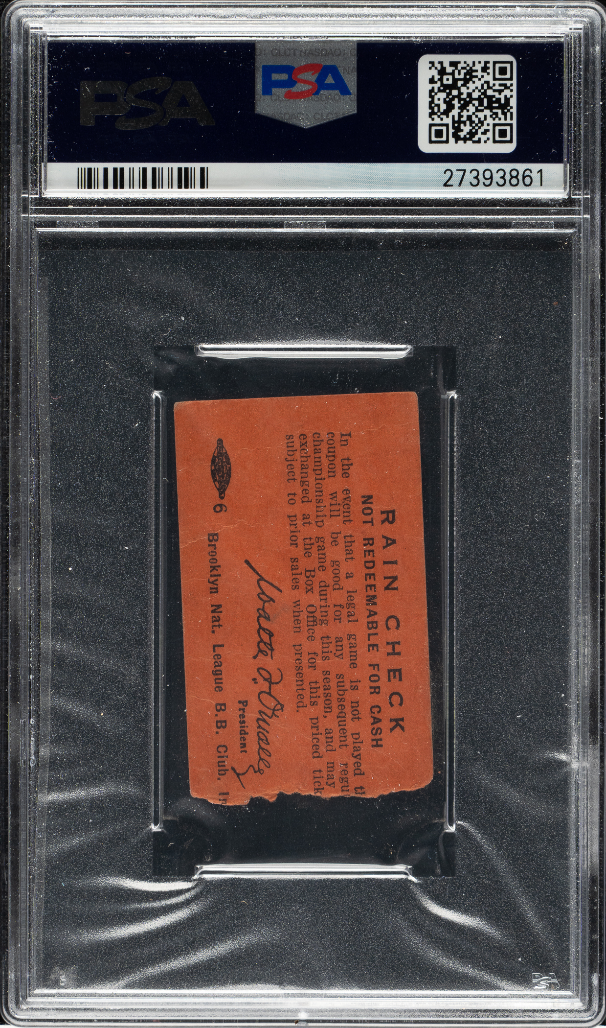 Ticket stub issued for a doubleheader between the Brooklyn Dodgers and St. Louis Cardinals on July 17, 1953, at Ebbets Field. The Dodgers swept the day-night doubleheader, 14-0 and 7-4, with Jackie Robinson belting a pair of home runs in the nightcap. Encapsulated as "Authentic" by PSA, the ticket stub (1.25 x 2 inches) presents in Good condition overall.