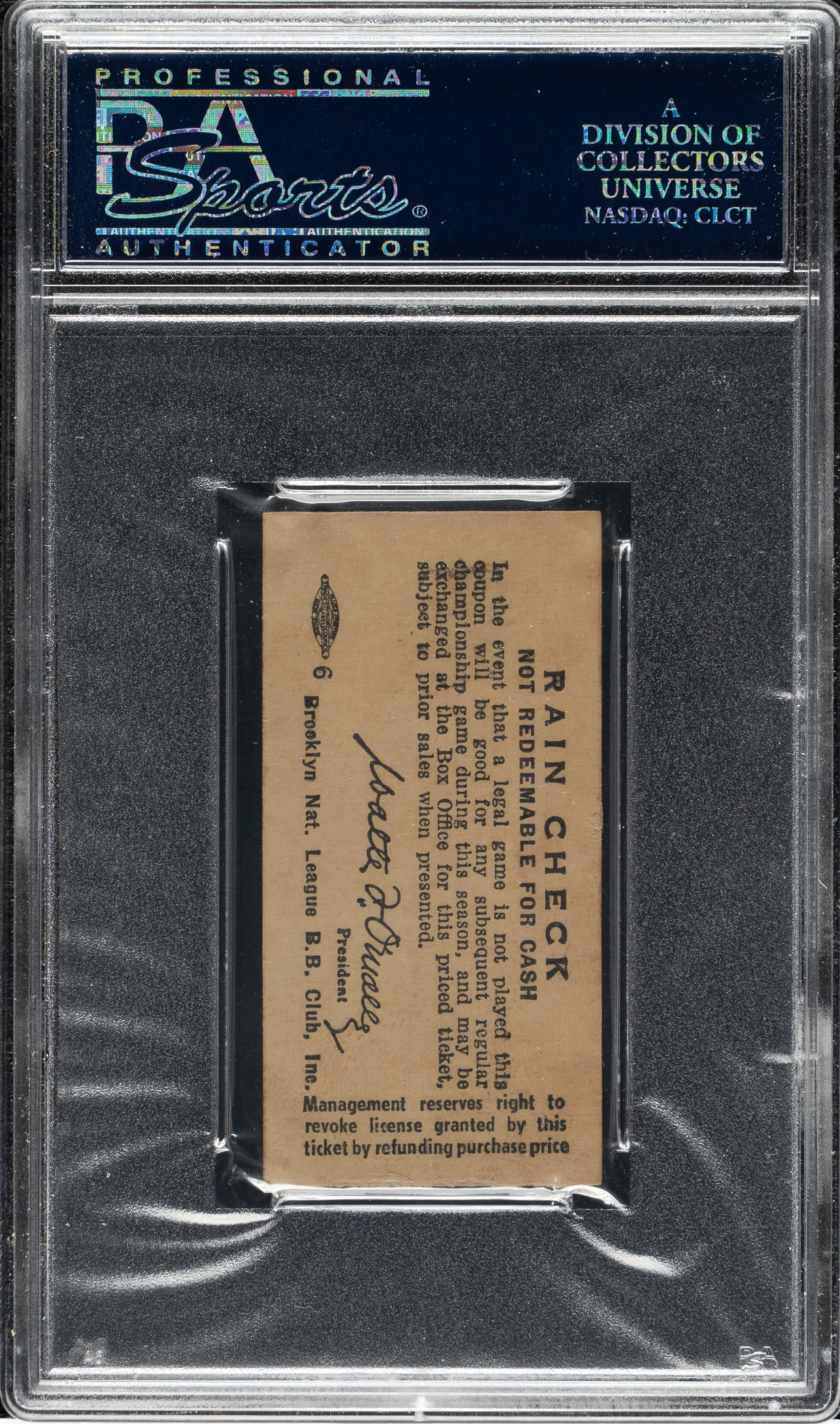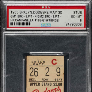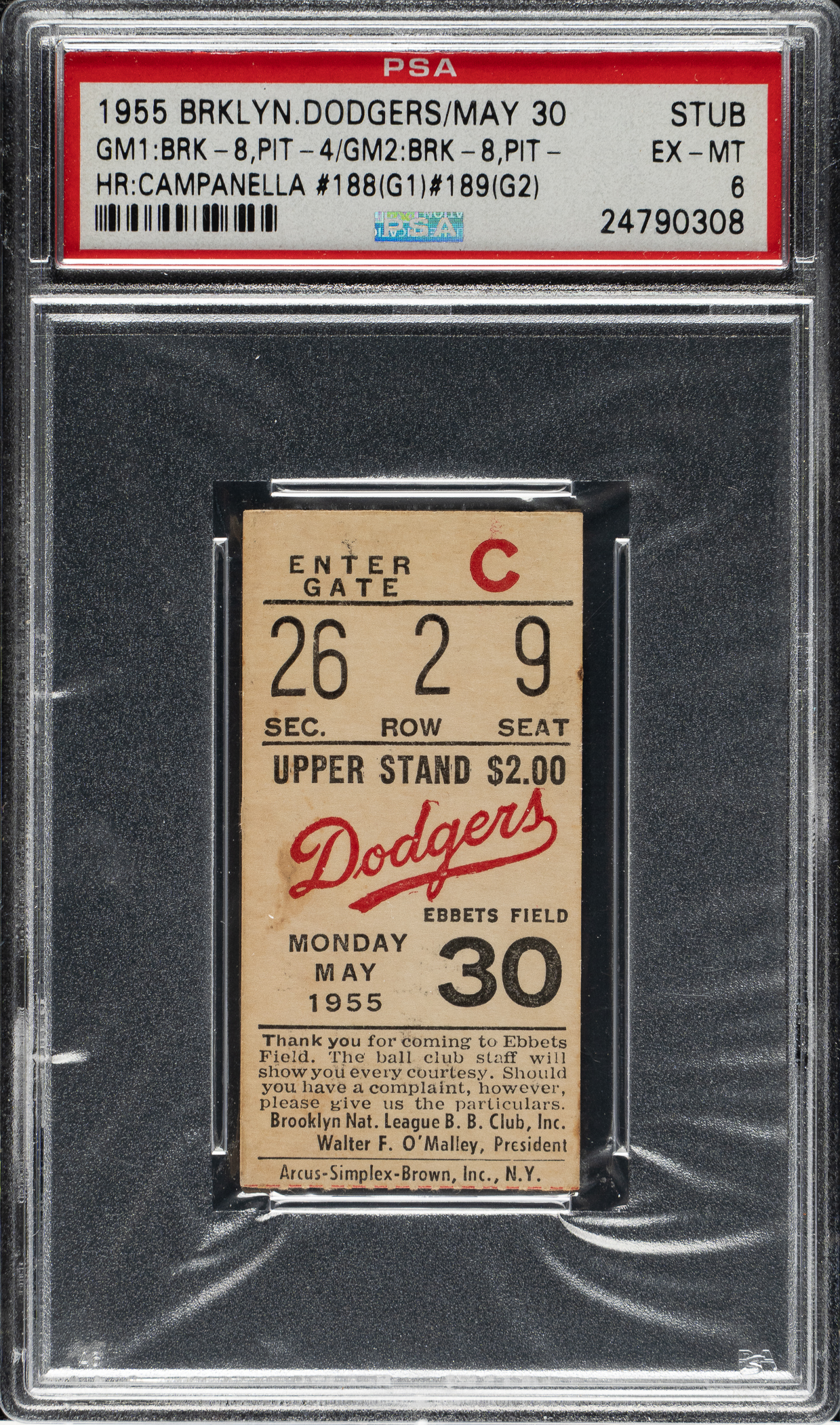 Graded EX-MT 6 by PSA. This is the ONLY example graded at this level by PSA with none higher! Ticket stub (1.25 x 2.5 inches) issued for a doubleheader between the Brooklyn Dodgers and Pittsburgh Pirates on May 30, 1955, at Ebbets Field. The Dodgers swept the doubleheader, 8-3 and 8-4, with Roy Campanella hitting a home run in both games.