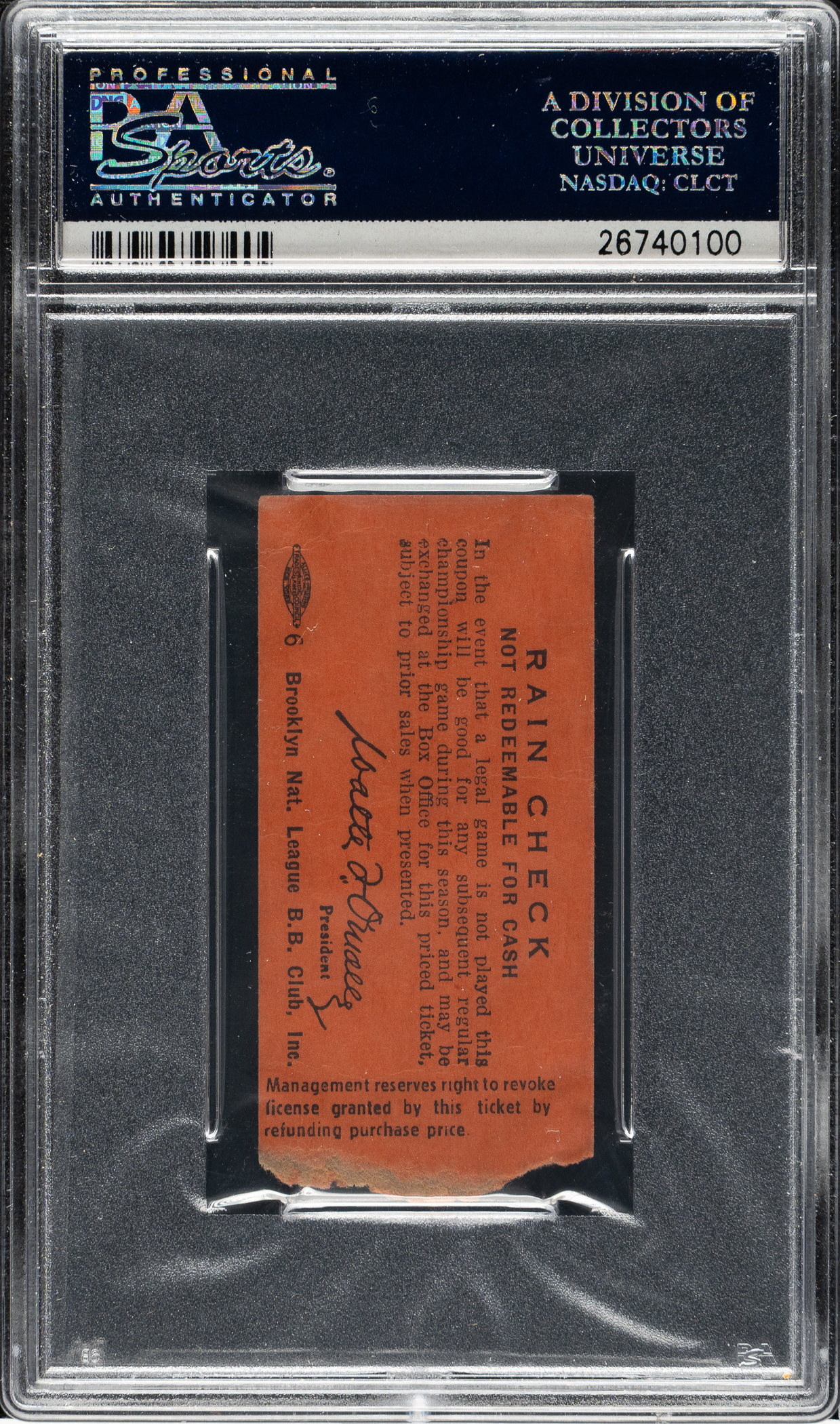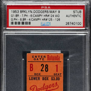 Ticket stub issued for a doubleheader between the Brooklyn Dodgers and Philadelphia Phillies on May 9, 1953, at Ebbets Field. The Dodgers won the first game 7-6 thanks to a Roy Campanella two-run walk-off home run, while the Phillies captured the nightcap 8-4. Encapsulated as "Authentic" by PSA, the ticket stub (1-1/4 x 2-5/8 inches) presents in Good condition overall.
