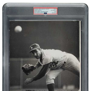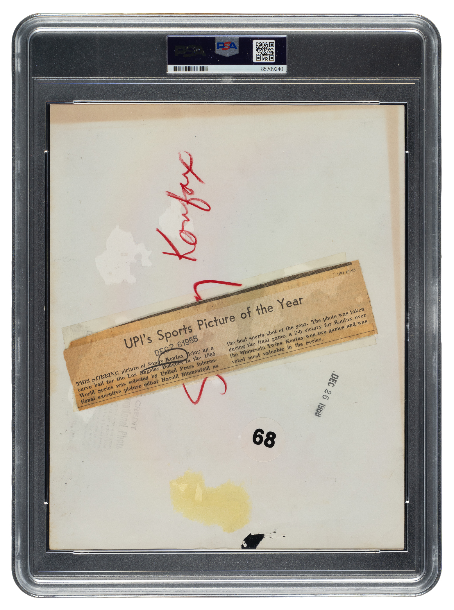 Original news photo providing a batter's perspective of Hall of Fame pitcher Sandy Koufax. Encapsulated and certified as an original Type I photograph by PSA/DNA. Koufax is captured delivering a pitch during the seventh game of the 1965 World Series against the Minnesota Twins, which the Dodgers won. The reverse bears a "United Press International Photo" credit stamp and a paper news caption, along with a "Dec 26 1968" date stamp and Koufax's handwritten name. The photo (8 x 10-1/8 inches) displays scattered creasing and is missing a piece along the bottom edge. Fair condition overall.