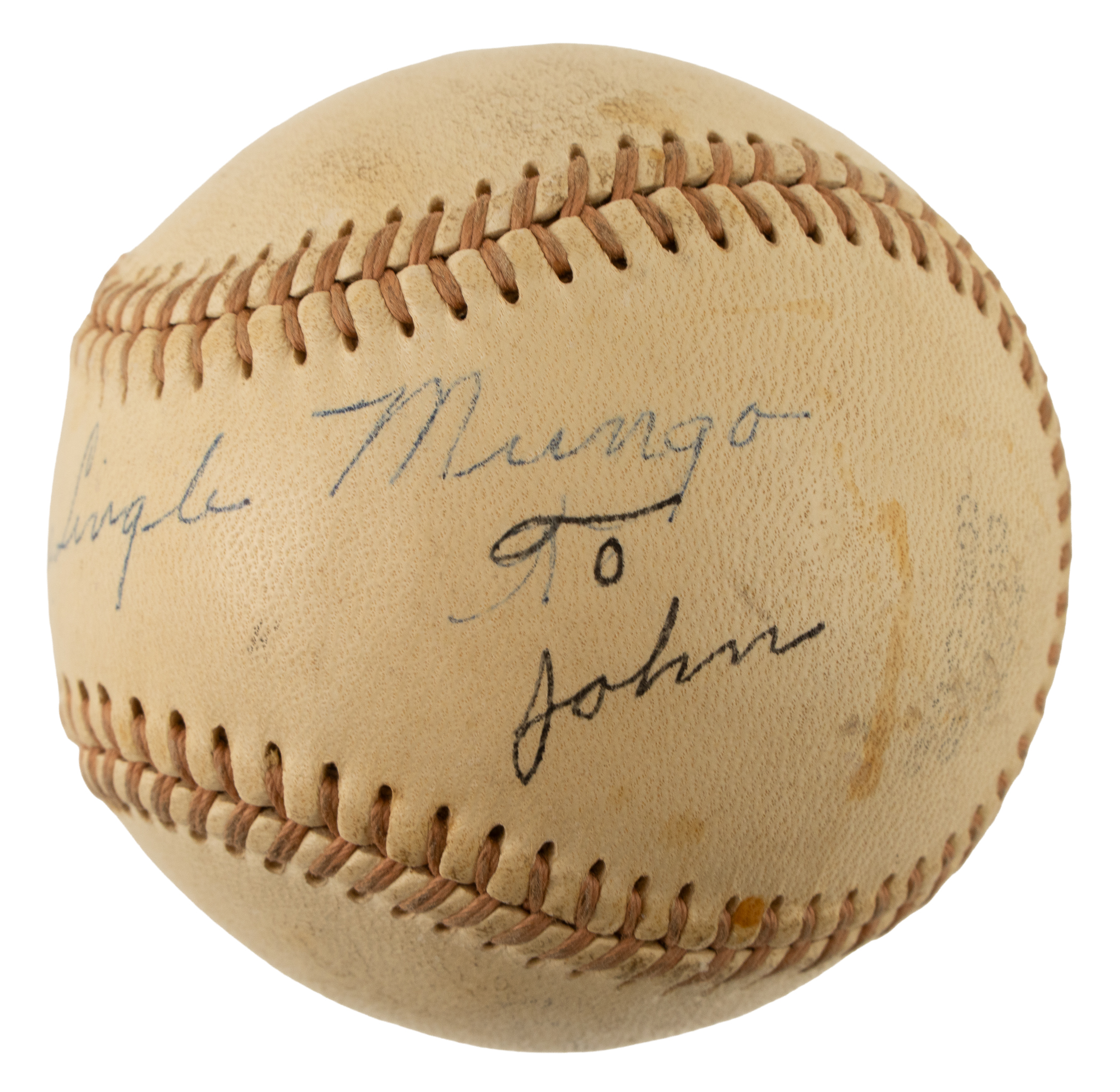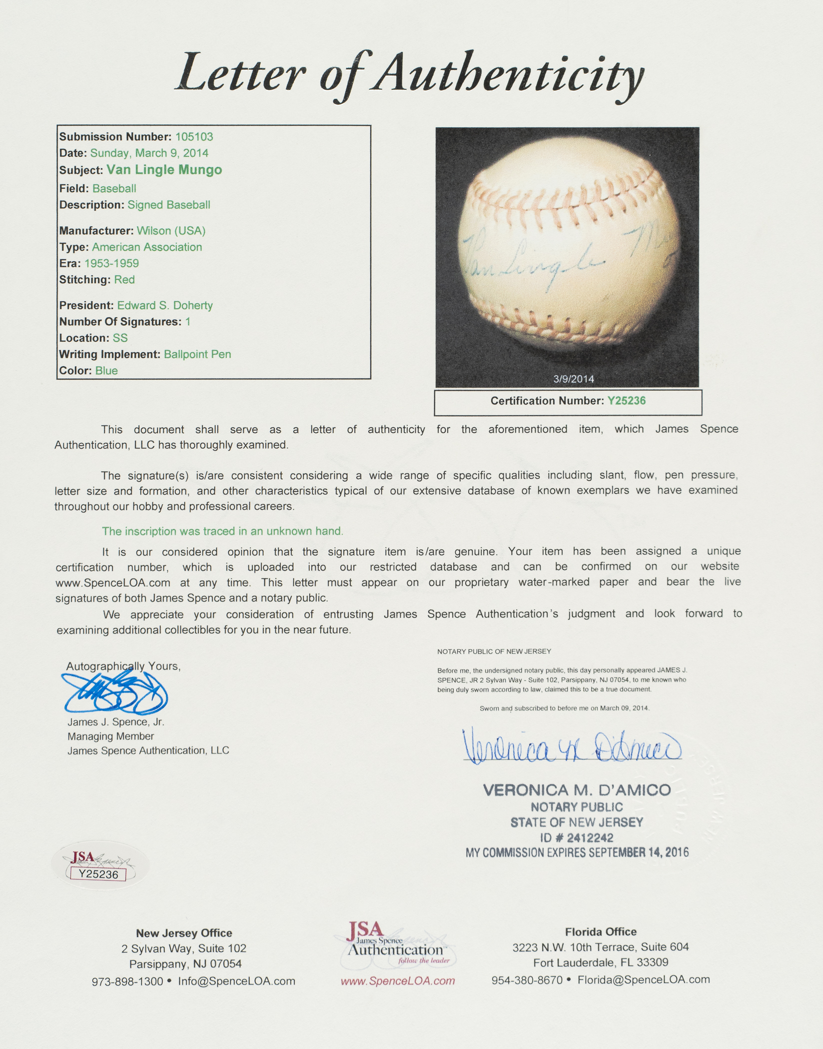 Wilson "Official American Association" baseball signed by pitcher Van Lingle Mungo in blue ink across the sweet spot. Mungo has added the personalization "To John" on a side panel (according to JSA, "the inscription was traced in an unknown hand"). Mungo passed away in 1985 at the age of 73. The ball displays light toning and a few surface abrasions. In Very Good to Excellent condition overall. Full LOA from James Spence/JSA.