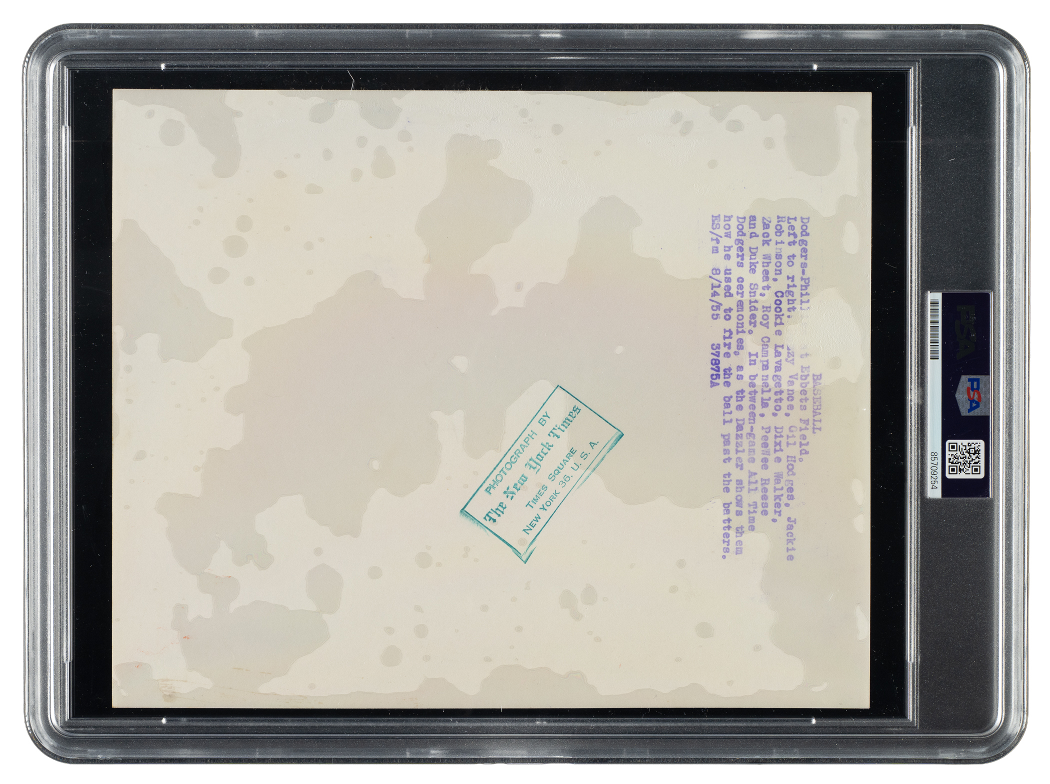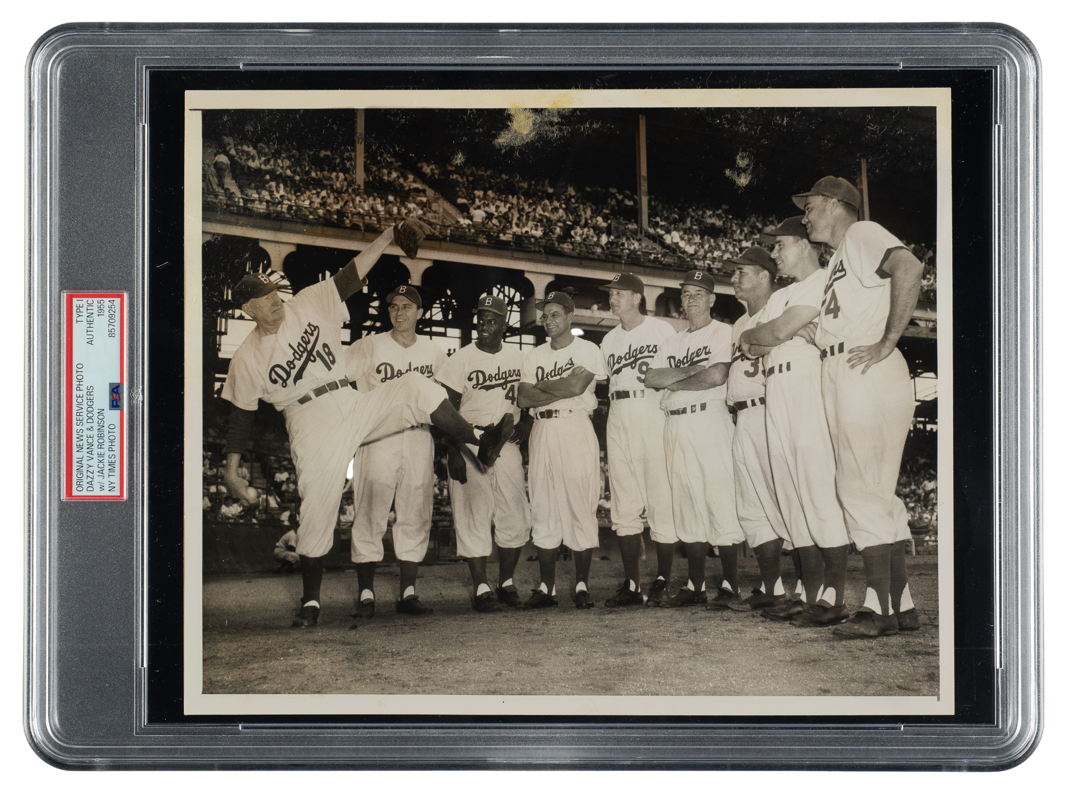 Original news photo taken during a celebration honoring the "All-Time Dodgers team" during the 1955 season. Encapsulated and certified as an original Type I photo by PSA/DNA. The Dodgers hosted the festivities on August 14th, in between games of a doubleheader at Ebbets Field. Several Dodgers greats from the past attended the ceremony, including Dazzy Vance and Zach Wheat. In this photo, Vance is captured showing off his pitching motion in front of a large group that includes Wheat and several members of the 1955 squad, most notably Gil Hodges, Jackie Robinson, Roy Campanella, Pee Wee Reese, and Duke Snider. The reverse bears a "New York Times" credit stamp and a printed caption dated "8/14/'55." The photo (10 x 8-1/8 inches) displays spots of paper residue on the front and is in Very Good condition overall.