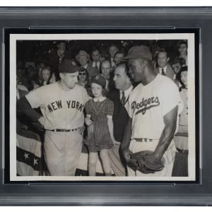 Original news photo featuring Tommy Henrich and Jackie Robinson before Game 5 of the 1949 World Series. Encapsulated and certified as an original Type I photograph by PSA/DNA. The players are pictured with MLB commissioner Happy Chandler and five-year-old Polio survivor Kathleen Dugan, as Chandler purchases the first ticket to the Robinson-Joe DiMaggio charity dinner, held December 12th at the Waldorf Astoria in Manhattan. The reverse features the original "International News Photos" paper news caption and an "Oct 12 1949" date stamp. The photo (7-1/8 x 9 inches) displays scattered creasing and is in Good condition overall.